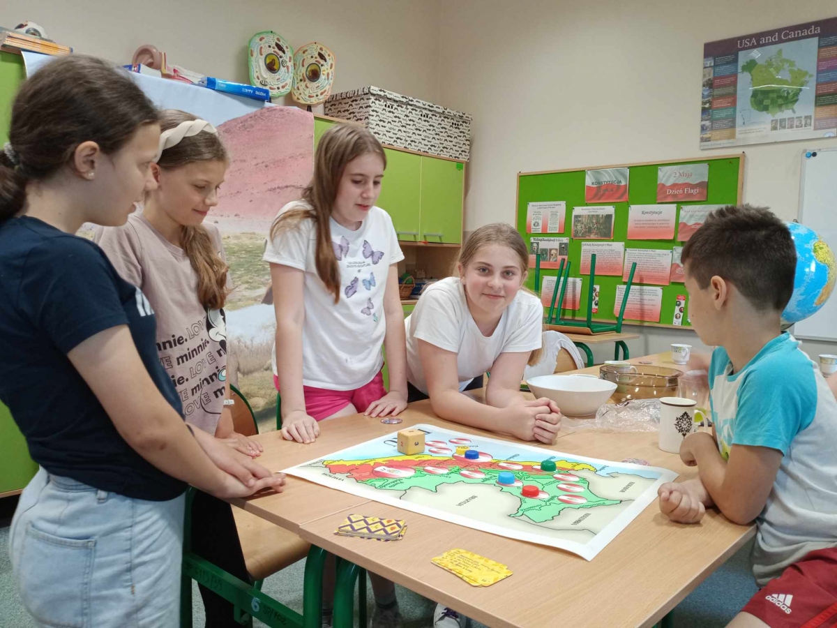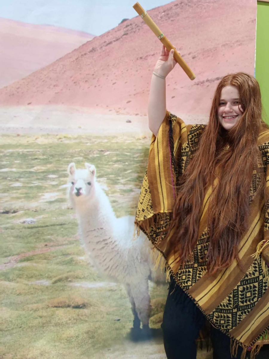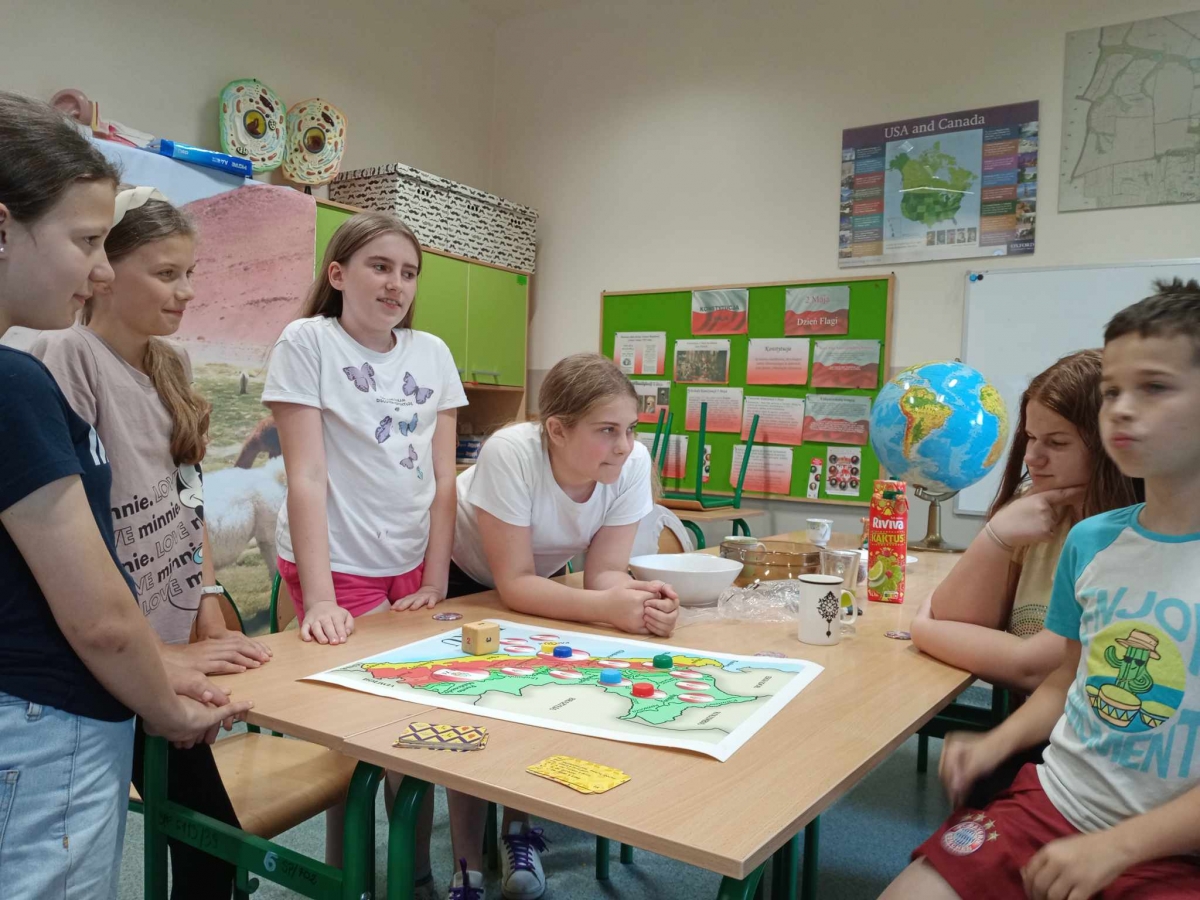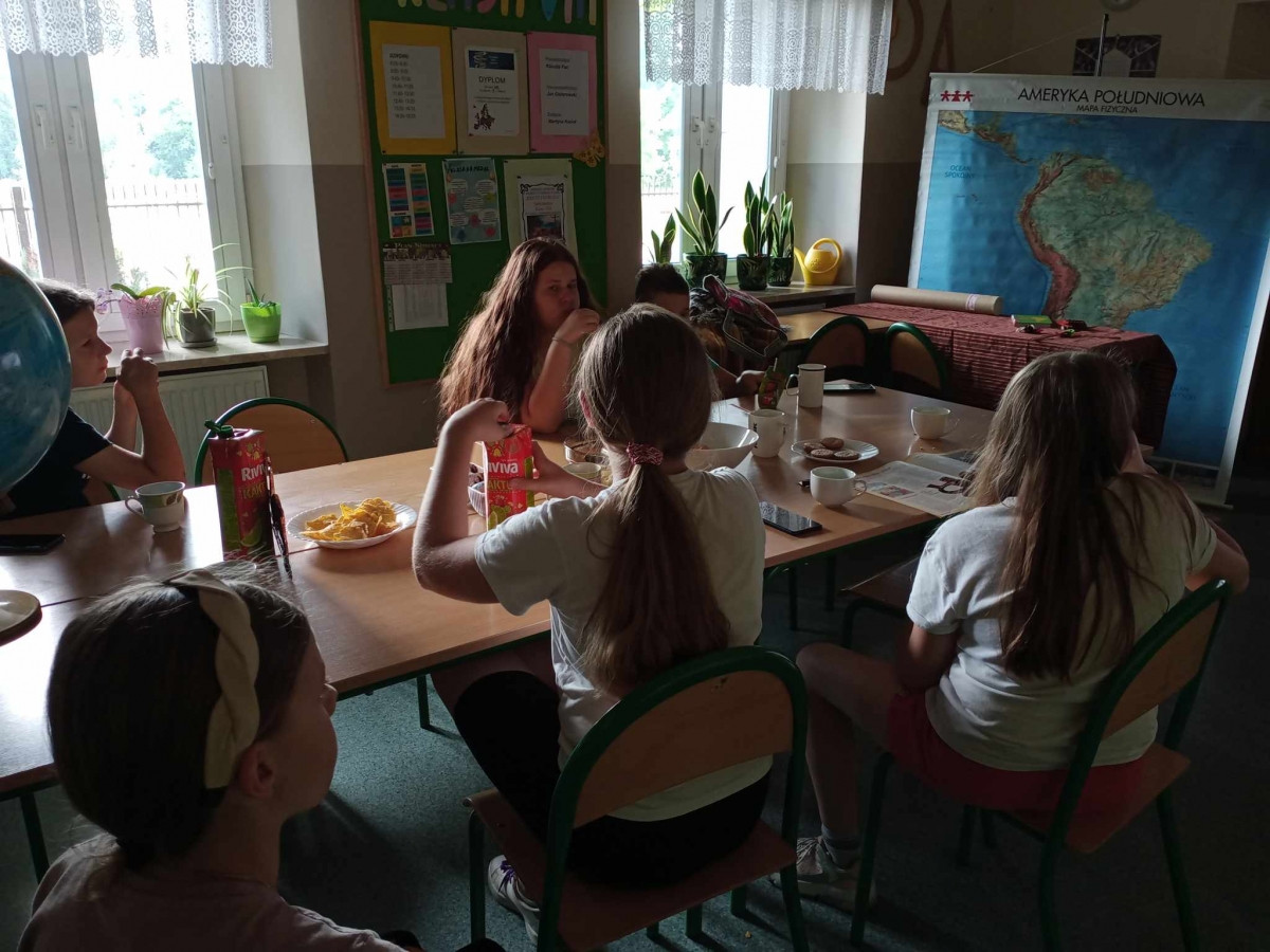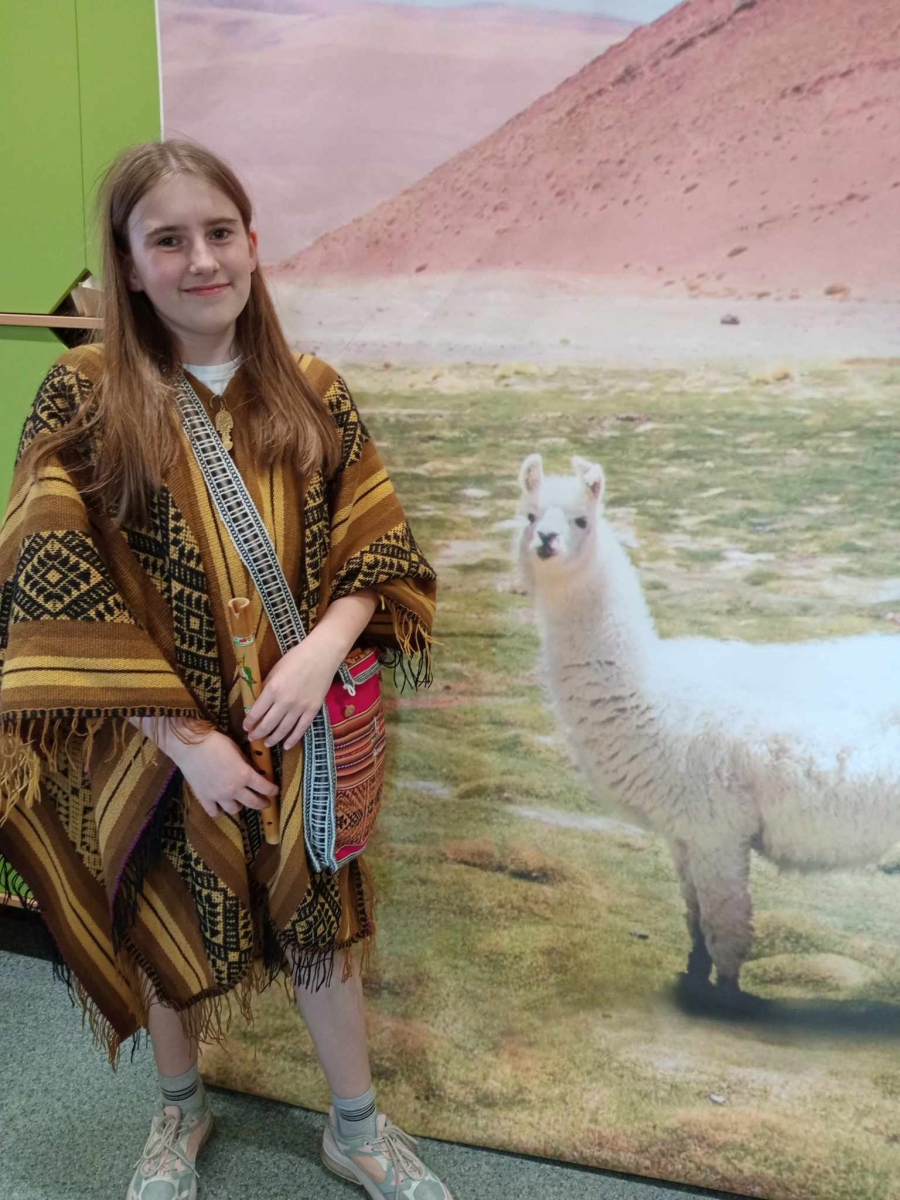 Tym razem uczestnicy zajęć gościli w Peru. Pani Basia najpierw przedstawiła krótki rys geograficzny, w czasie którego uczniowie pracowali z mapą, potem przyszedł czas na przebieranki i pozowanie z lamą. Były też tradycyjne poncha i instrumenty. Na zakończenie spotkania wszyscy uczestniczy grali w grę o Peru wymyśloną i zrobioną przez benedyktyna o. Andrzeja, który był w Peru na misjach. W trakcie oglądania filmiku o Peru dzieci dowiedziały się, że stamtąd pochodzą ziemniaki i kukurydza, więc na stole nie mogło zabraknąć prażynek i chrupek kukurydzianych do degustacji.