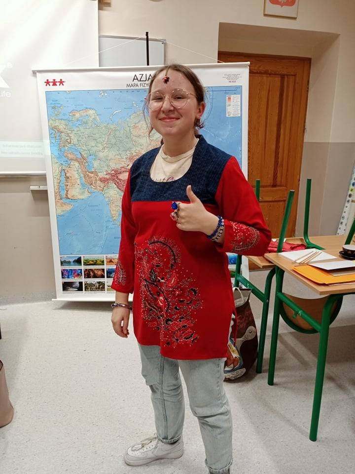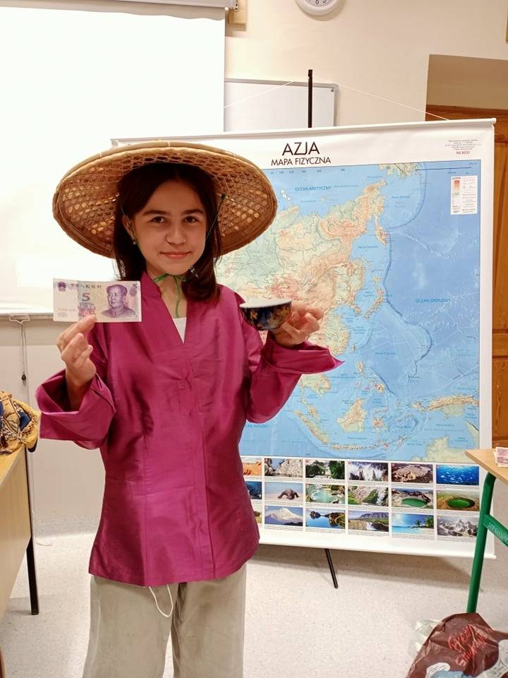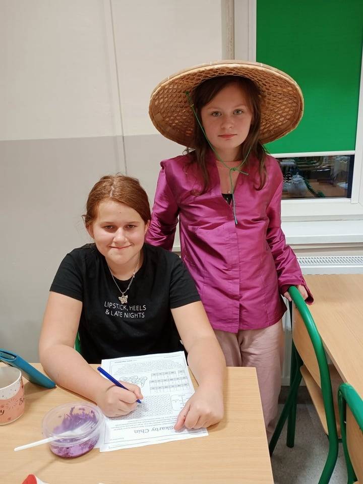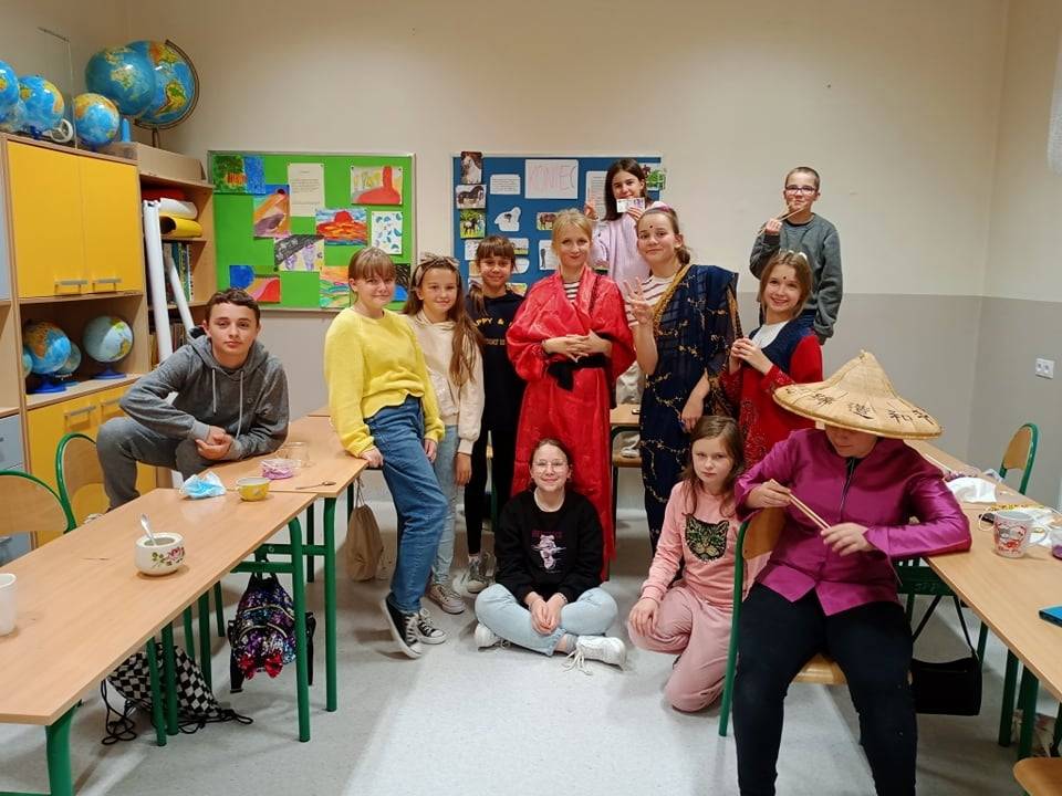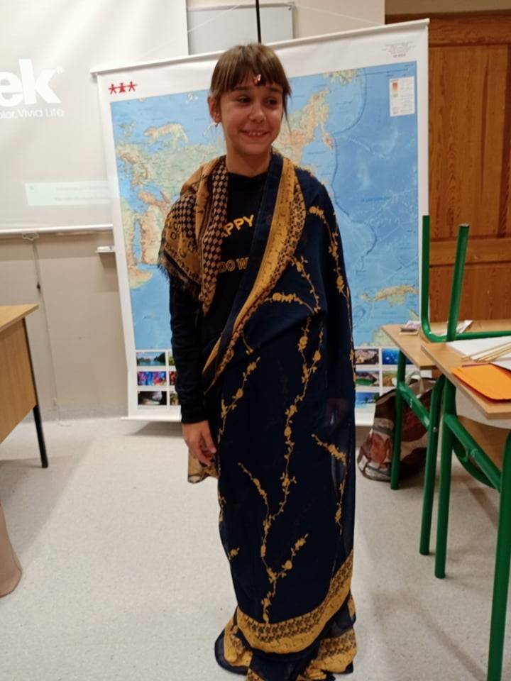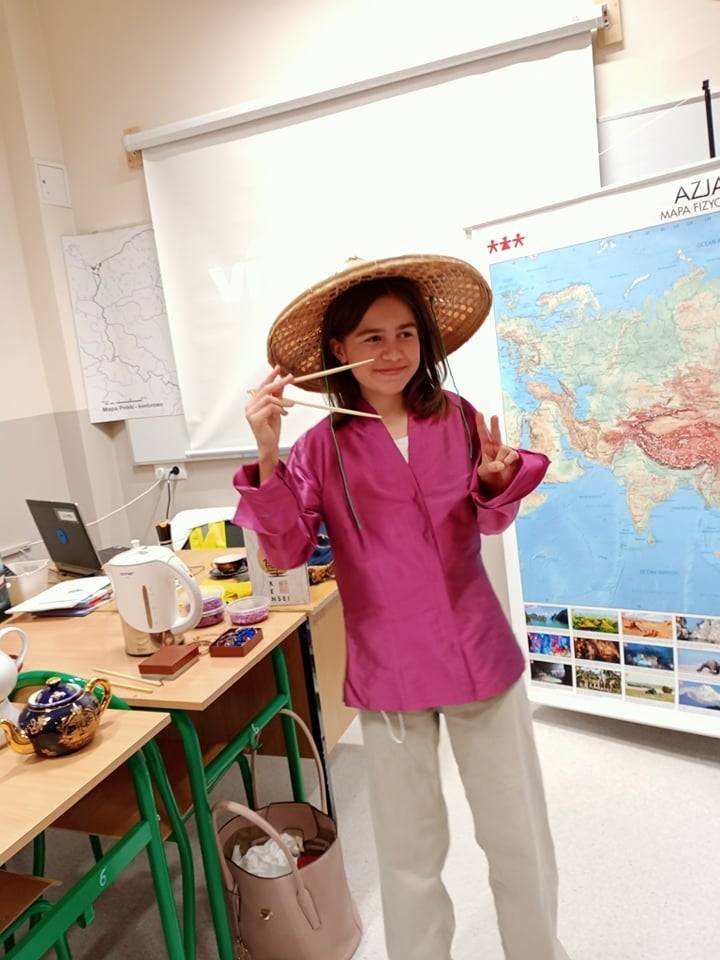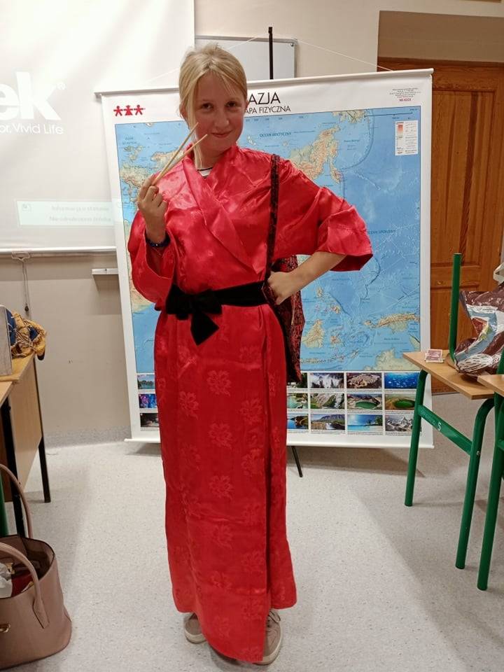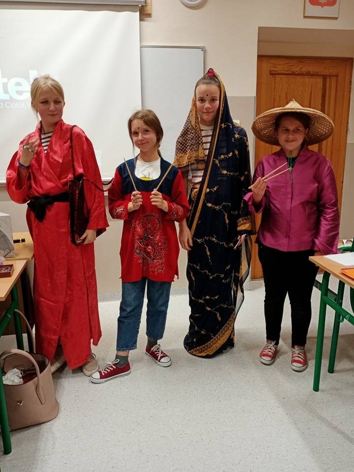 Tematem przewodnim sesji była Azja. Piliśmy herbatę i jedliśmy orzeszki ziemne, mandarynki oraz granata. Można się było ubrać w różnorodne i piękne stroje: hinduskie sari, japońskie kimono i chiński strój. Uczniowie z uwagą wysłuchali informacji o geografii Azji, rozwiązywali zagadki, a także słuchali muzyki z krajów azjatyckich.