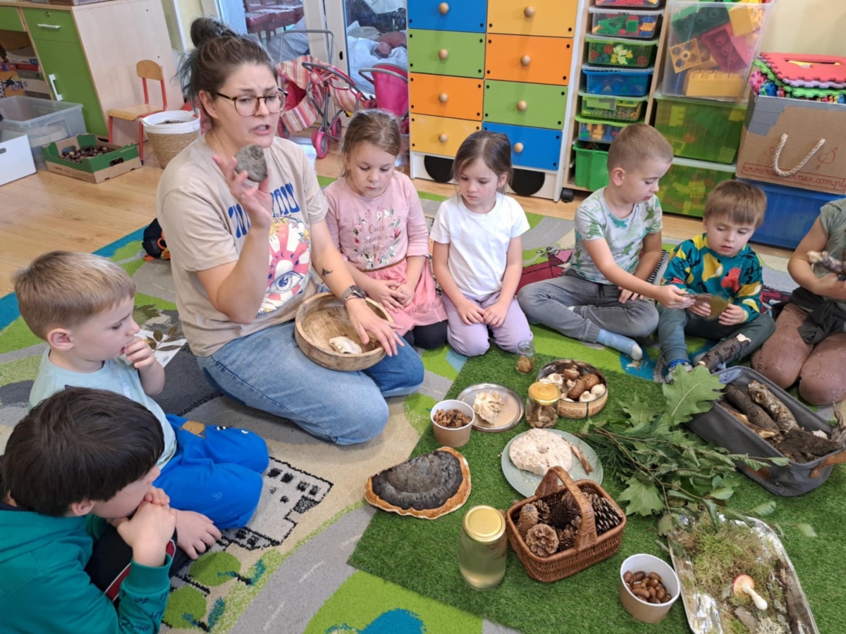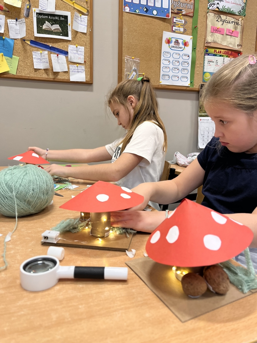 Kolejne warsztaty przyrodnicze za nami. Tematem przyrodniczego spotkania były Grzyby i inne leśne skarby. Dzieci dowiedziały się czemu i kiedy szyszki zamykają się chowając swoje nasiona, dopasowały leśne skarby do właściwych gatunków drzew, poznały budowę grzybów oraz różne ciekawostki o nich. Na koniec każdy z uczniów wykonał swoją muchomorową lampkę z ekologicznych materiałów i jesiennych darów.