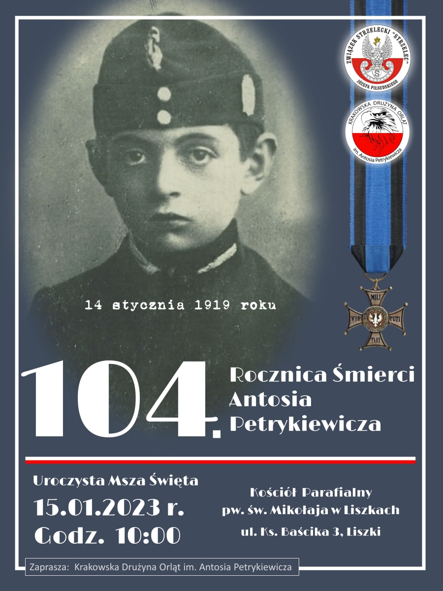 Czołem!W imieniu Orląt i Strzelców z Krakowskiej Drużyny Orląt im. Antosia Petrykiewicza pragnę zaprosić na uroczystą Mszę Świętą w 104. rocznicę śmierci naszego patrona.Msza odbędzie się w Kościele Parafialnym w Liszkach w dniu 15.01.2023 roku o godz. 10:00.Ze strzeleckim pozdrowieniemSt. sierż. ZS Bartosz Wołkowski