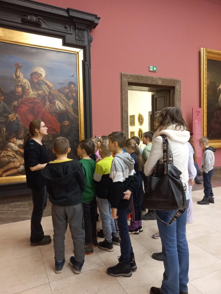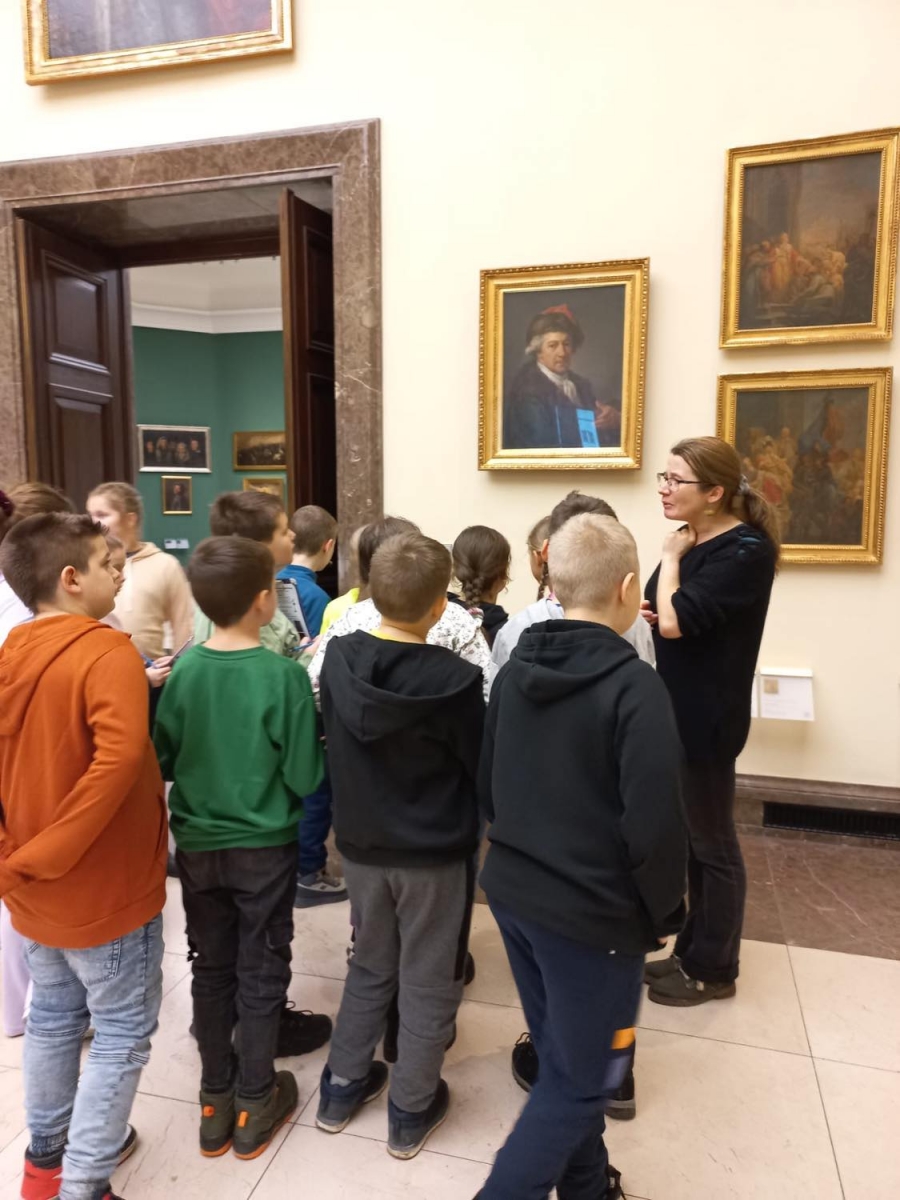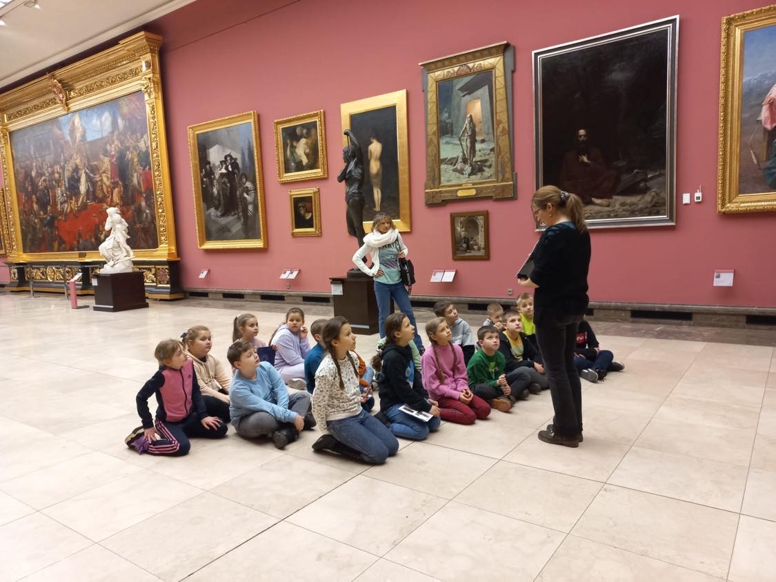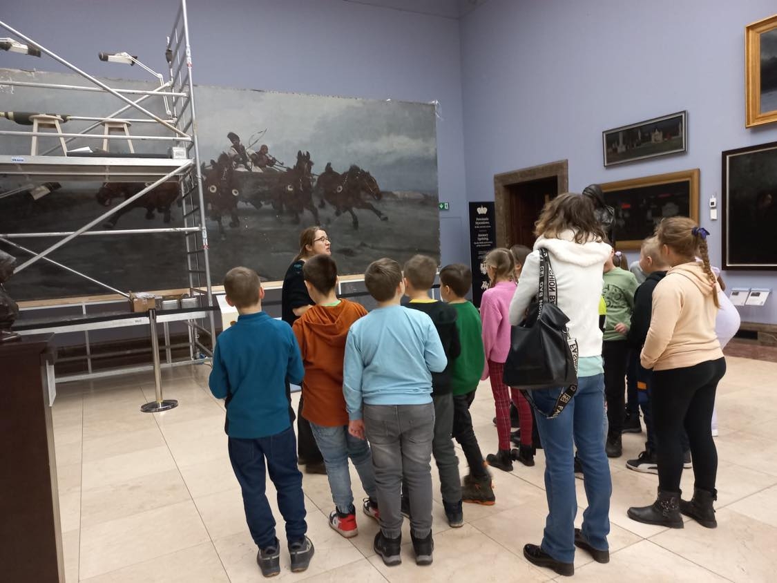 Uczniowie, wędrując przez cztery sale: Bacciarellego, Michałowskiego, Siemiradzkiego i Matejki, zapoznawali się z wybranymi dziełami malarskimi i rzeźbami. Dzieci musiały wykazać się większą aktywnością odbioru niż tylko podziwianie dzieł sztuki, gdyż wykonywały również różne zadania, m.in. odszyfrowywały tytuły obrazów, wyszukiwały na nich wskazane elementy, uzupełniały karty pracy, które otrzymały od pani przewodniczki.