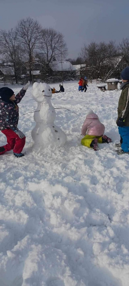 Lekcja wf’u na śniegu - uczniowie klasy drugiej radośni i szczęśliwi.