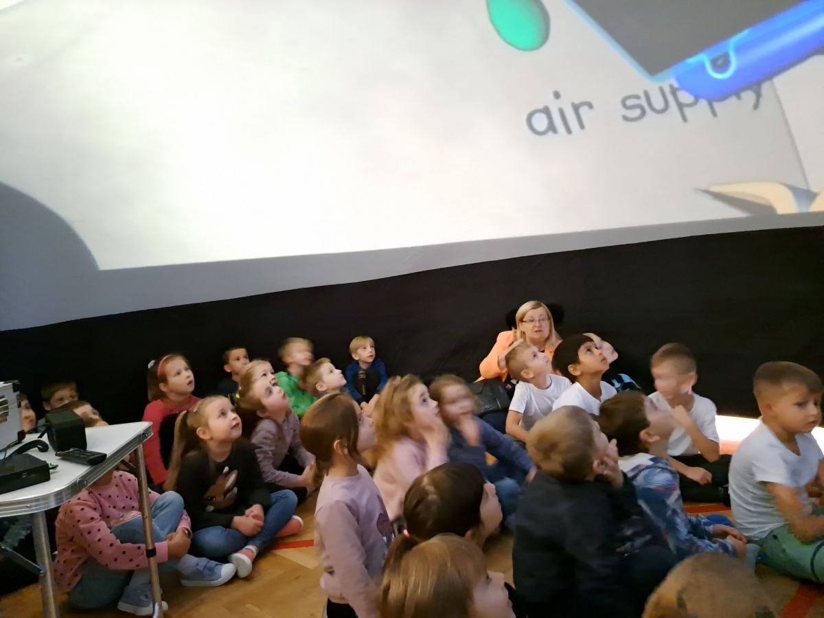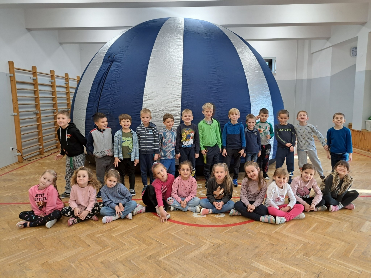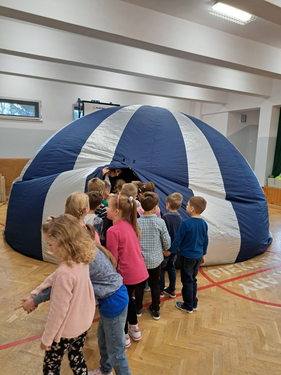 W naszej szkole na sali gimnastycznej stanęła nadmuchiwana kopuła. Wchodząc do jej wnętrza, zainteresowani uczniowie z klas I-VIII i przedszkola, mieli okazję przenieść się w świat kosmicznych tajemnic i odwiedzić odległe planety.