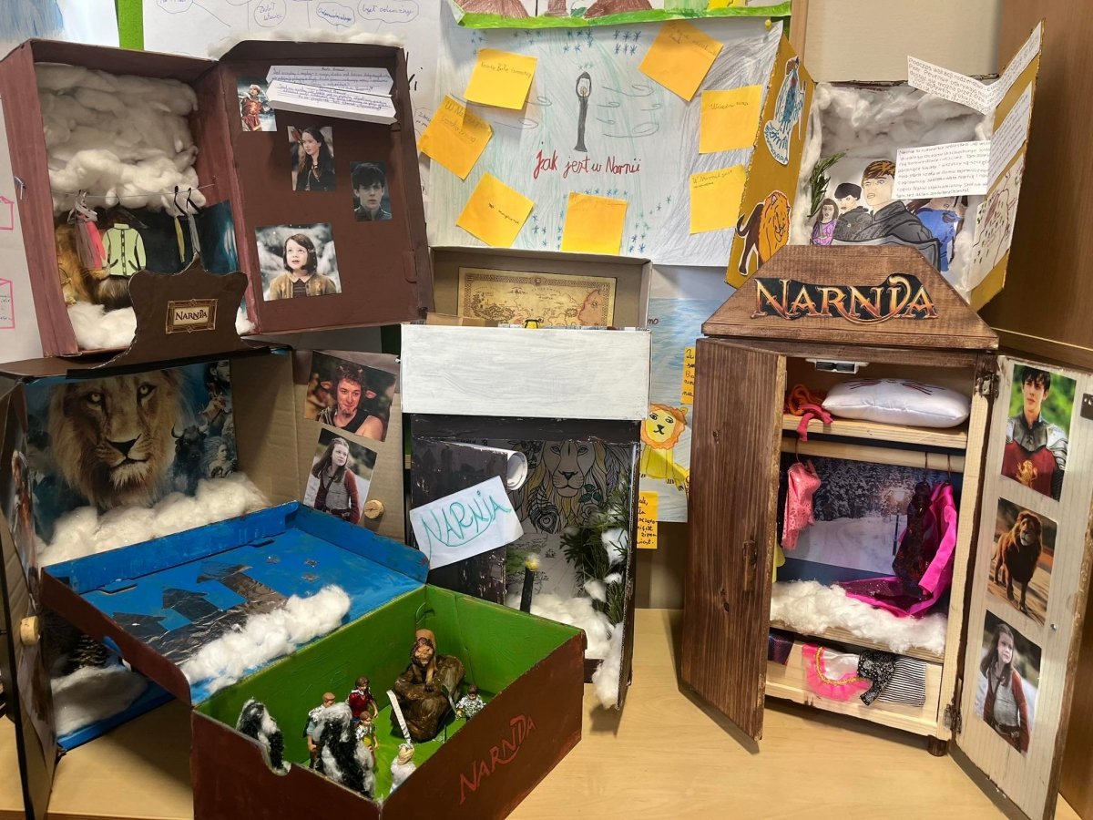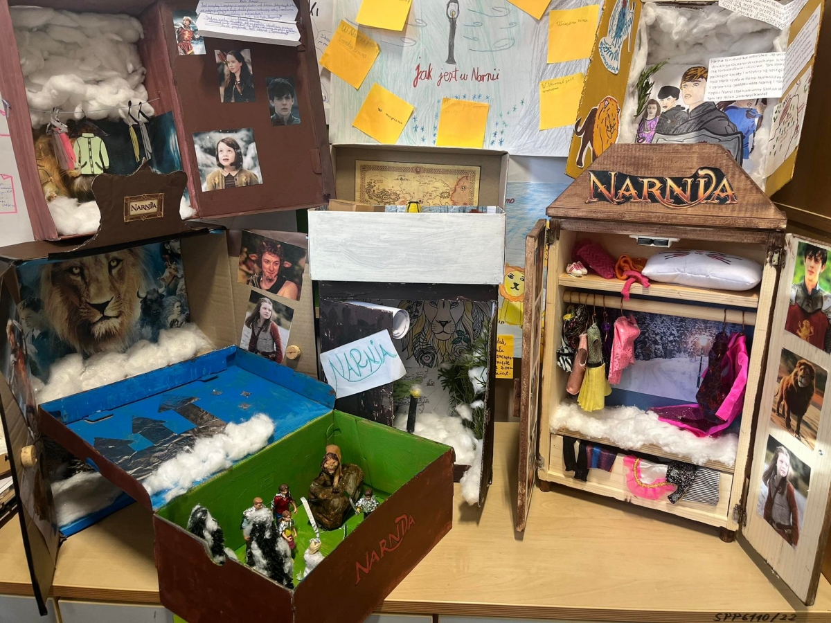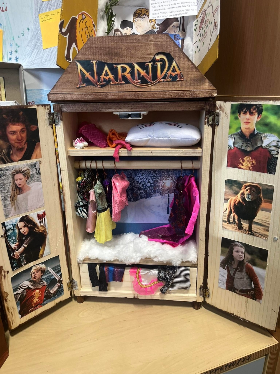 W ramach projektu kończącego spotkania z książką C. S. Lewisa dzieci gromadziły różne przedmioty związane z treścią utworu i światem przedstawionym. Zebrane eksponaty wyczarowały wspaniałą Narnię, którą możemy podziwiać w sali klasy V i VI. Może zobaczyć tam piękne małe szafy zbudowane na wzór tej tytułowej, a także pudełka po butach przerobione na wzór czarodziejskiej szafy z lektury. W środku pudełkowych szaf znalazło się prawie całe królestwo Narnii, czyli śnieg z waty, drzewa, latarnia, a także ubranka na wieszakach, za którymi można było odkryć tajemne wejście do magicznej krainy. Figurki i laleczki odzwierciedlały postacie bohaterów pierwszo- i drugoplanowych z całym bogactwem o szczegóły: plastikowe miecze, tarcze i różne innymi elementy związane z treścią tego niezwykłego utworu.