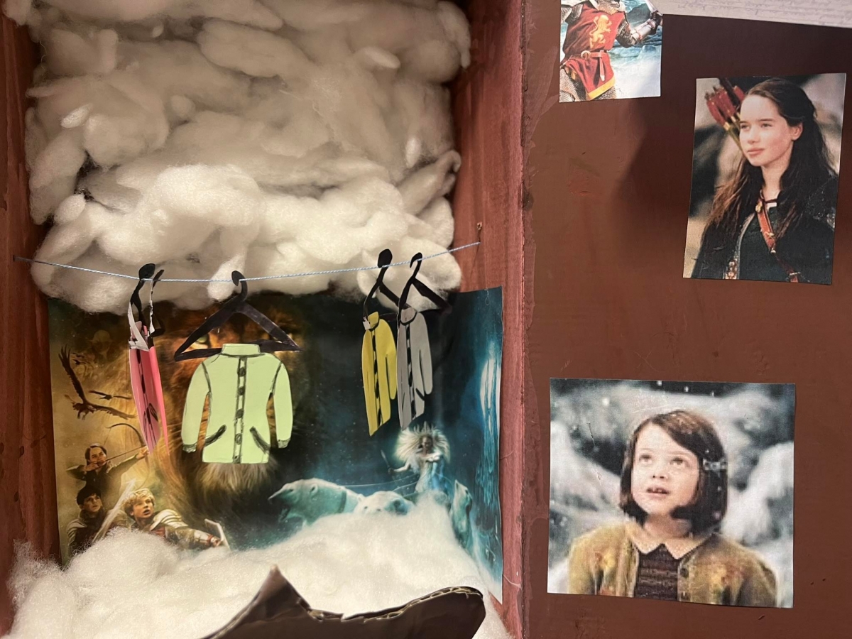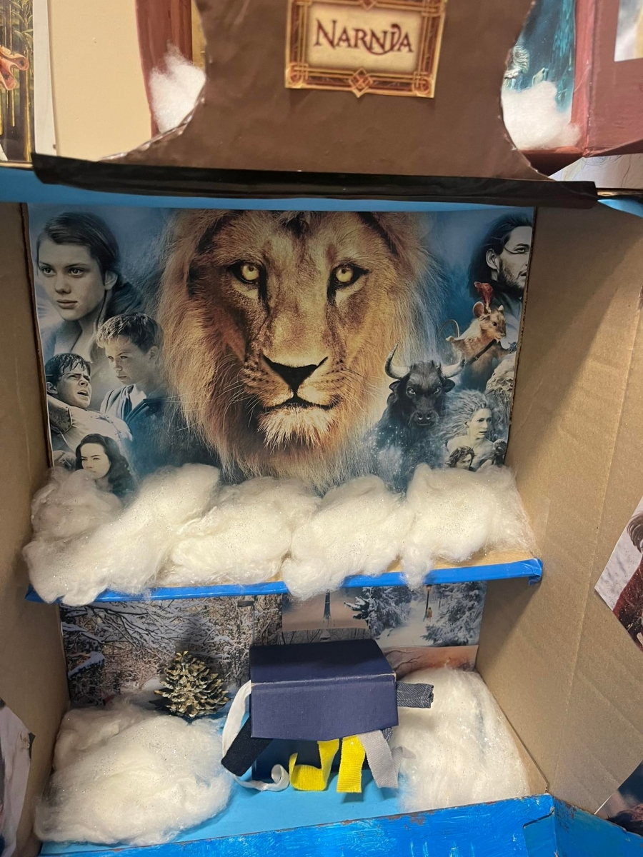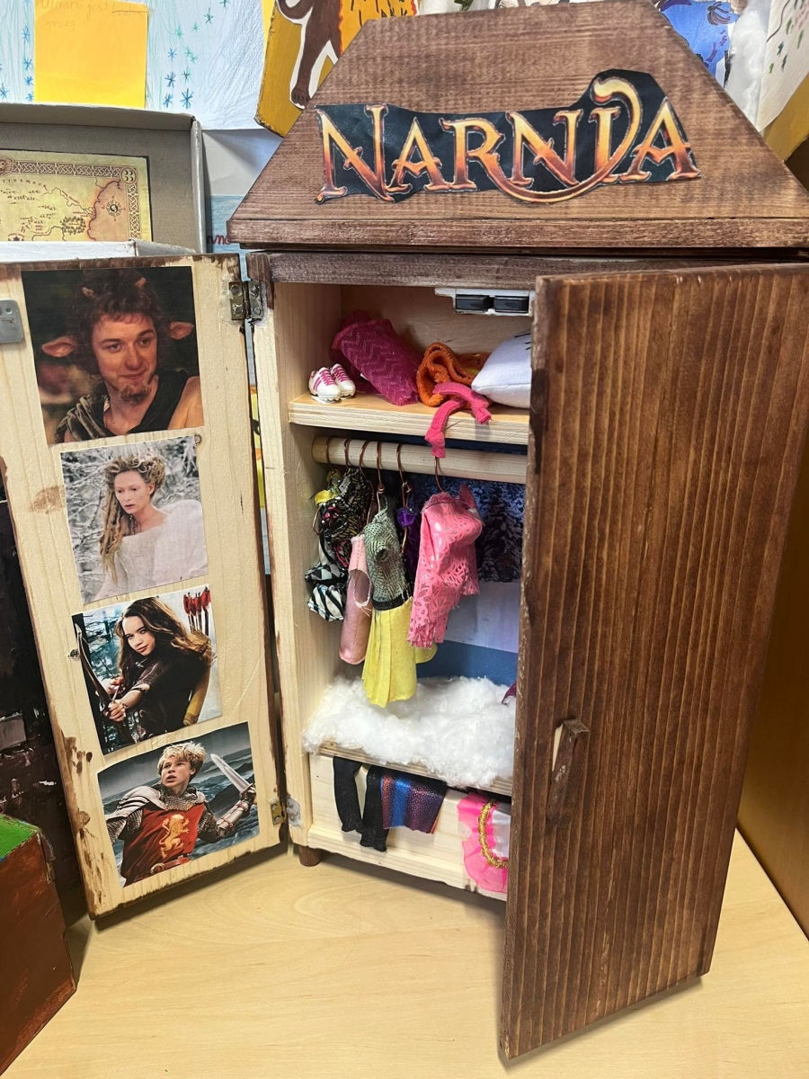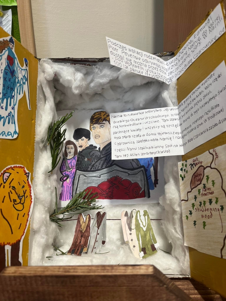 W ramach projektu kończącego spotkania z książką C. S. Lewisa dzieci gromadziły różne przedmioty związane z treścią utworu i światem przedstawionym. Zebrane eksponaty wyczarowały wspaniałą Narnię, którą możemy podziwiać w sali klasy V i VI. Może zobaczyć tam piękne małe szafy zbudowane na wzór tej tytułowej, a także pudełka po butach przerobione na wzór czarodziejskiej szafy z lektury. W środku pudełkowych szaf znalazło się prawie całe królestwo Narnii, czyli śnieg z waty, drzewa, latarnia, a także ubranka na wieszakach, za którymi można było odkryć tajemne wejście do magicznej krainy. Figurki i laleczki odzwierciedlały postacie bohaterów pierwszo- i drugoplanowych z całym bogactwem o szczegóły: plastikowe miecze, tarcze i różne innymi elementy związane z treścią tego niezwykłego utworu.