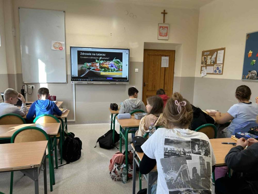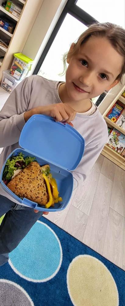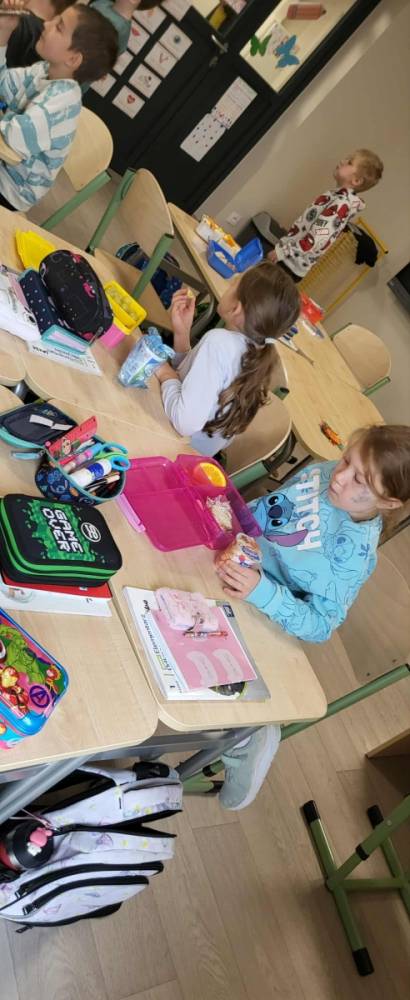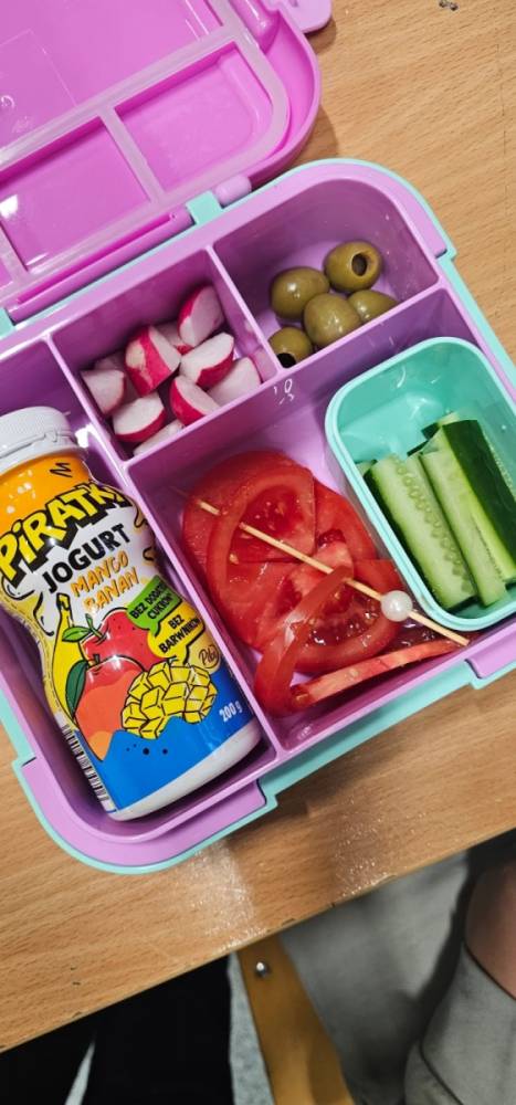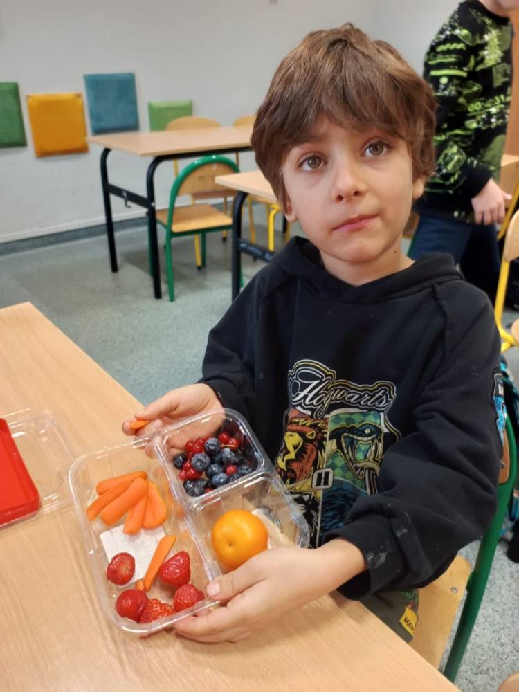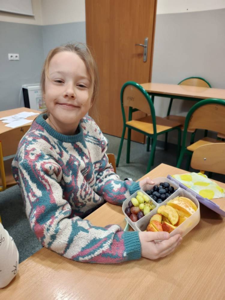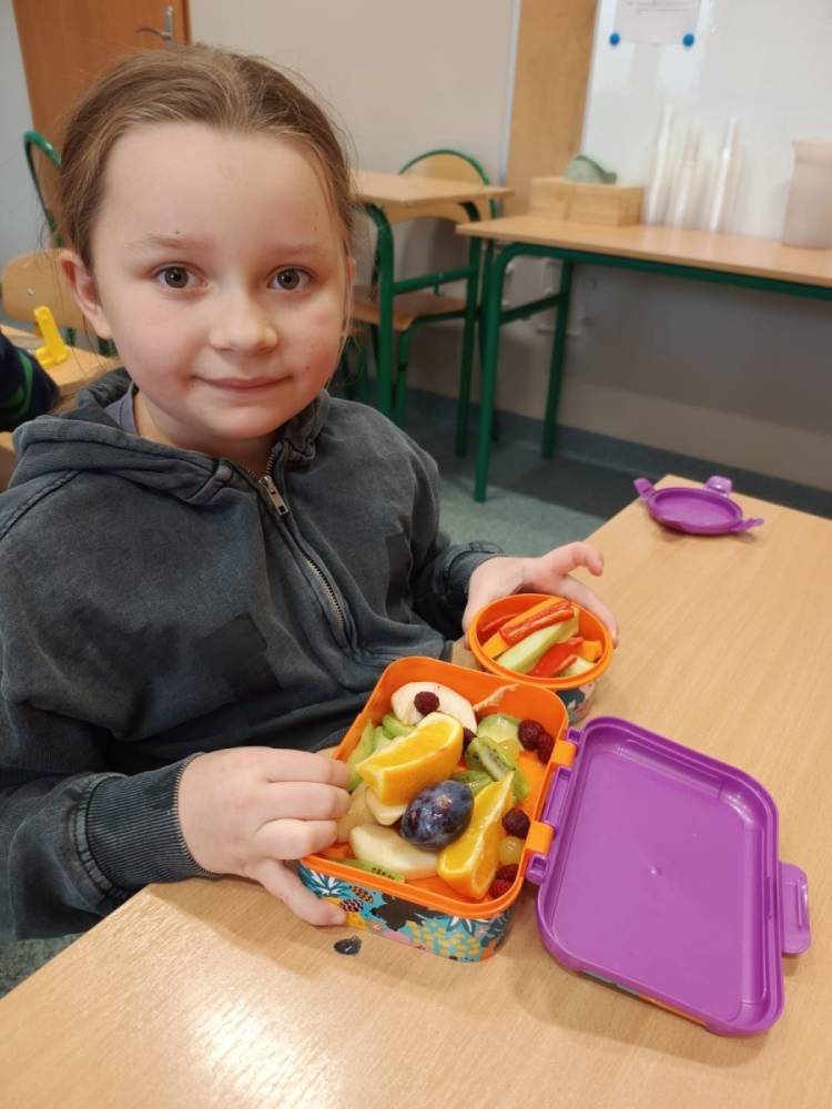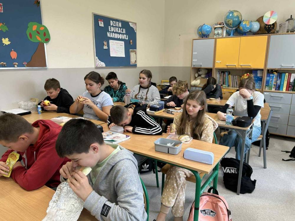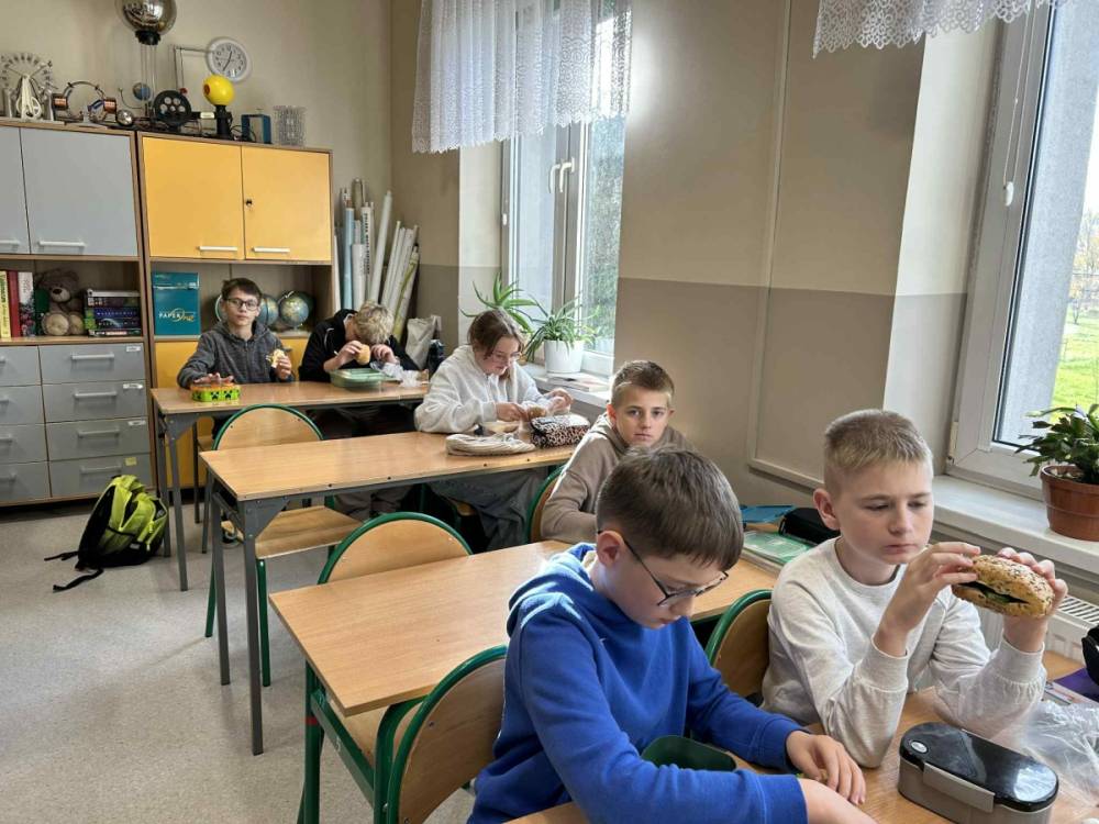 Z tej okazji w klasach odbyły się ciekawe pogadanki o talerzu zdrowego żywienia. Uczniowie dowiedzieli się, jakie produkty warto wybierać na śniadanie, aby mieć energię i dobry nastrój przez cały dzień. Na lekcjach języka angielskiego dzieci poznały również, co jada się na śniadanie w różnych krajach świata. Zwieńczeniem naszych działań było oczywiście wspólne zjedzenie drugiego śniadania.