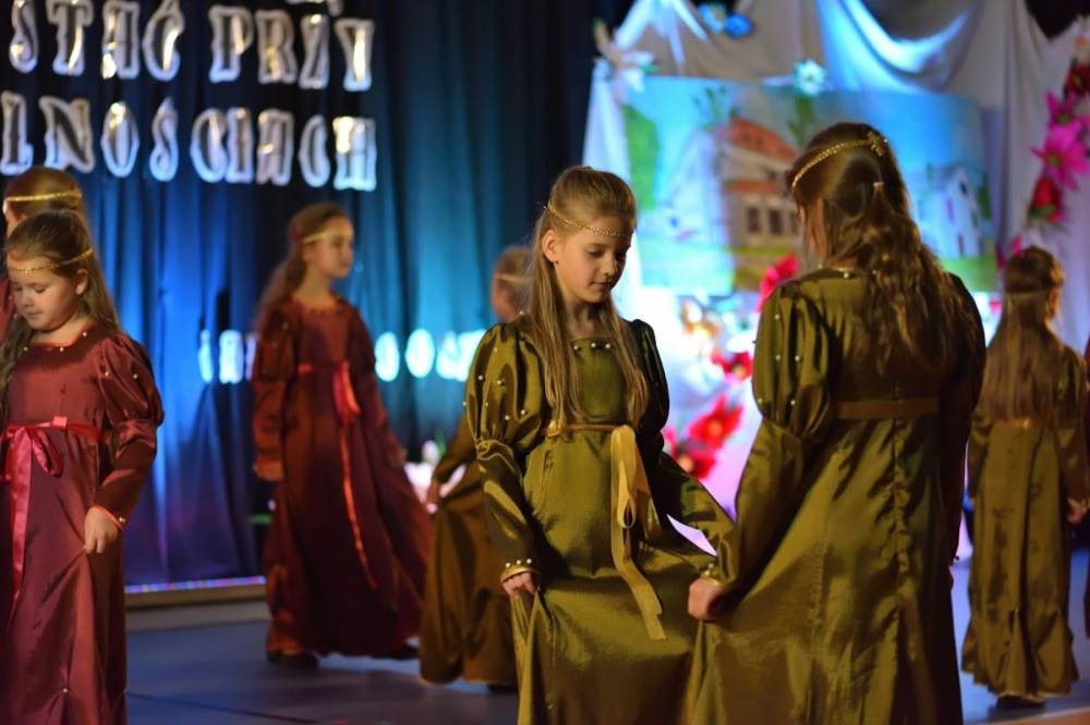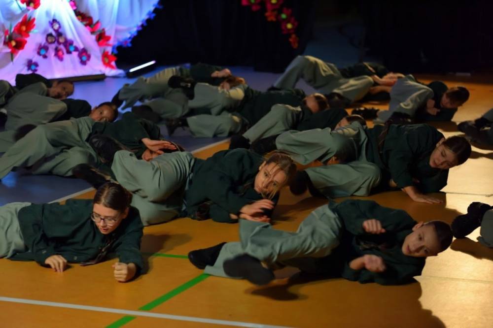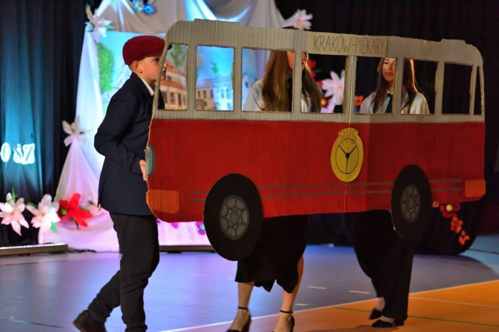 Po części oficjalnej nastąpiła część artystyczna. Przygasły światła, rozbrzmiała muzyka i przenieśliśmy się do komnaty Długosza, który jako patron rozpoczął spisywanie historii szkoły. Scenariusz przedstawienia napisany przez Panią Dyrektor zawierał wypisy z kronik szkoły i opowiadał o najważniejszych wydarzeniach w jej prawie 150 letnim istnieniu. Była mowa o trzech rozbudowach, o czasach powojennych, o warunkach panujących w szkole i innych wydarzeniach zapisanych na pożółkłych kartach kronik. W tle pojawiały się stare zdjęcia dokumentujące to, o czym była mowa na scenie, zdjęcia osób związanych ze szkołą, fotografie pięknych piekarskich krajobrazów. U widzów w wielu momentach można było dostrzec łezkę wywołaną wzruszeniem i wspomnieniami z młodych lat. Najbardziej podobały się zdjęcia Piekar autorstwa Janusza Kozła, filmiki z nagraniami absolwentów, wspomnienia emerytowanej Pani Dyrektor Grażyny Małuchy i taniec najmłodszych. Występ uświetnił brawurowy taniec ESCAPE Dance Academy przygotowany przez naszego absolwenta, choreografa, mistrza tańca Piotra Kapusty.