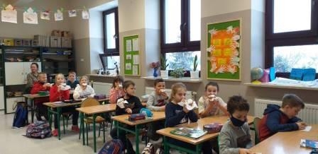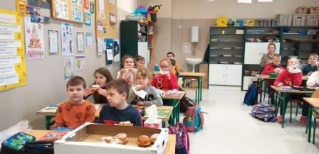 Uczniowie klas młodszych dziękują Radzie Rodziców za pyszne pączki.