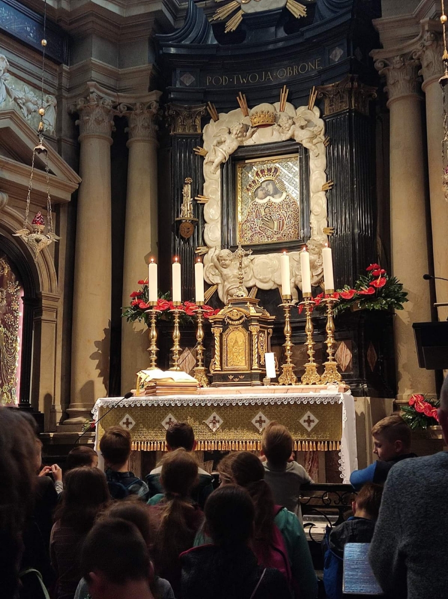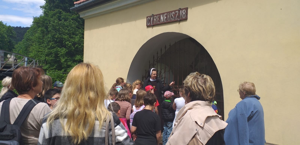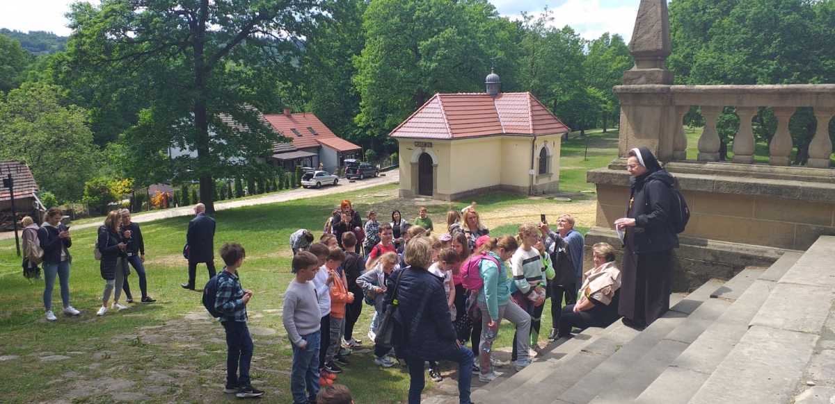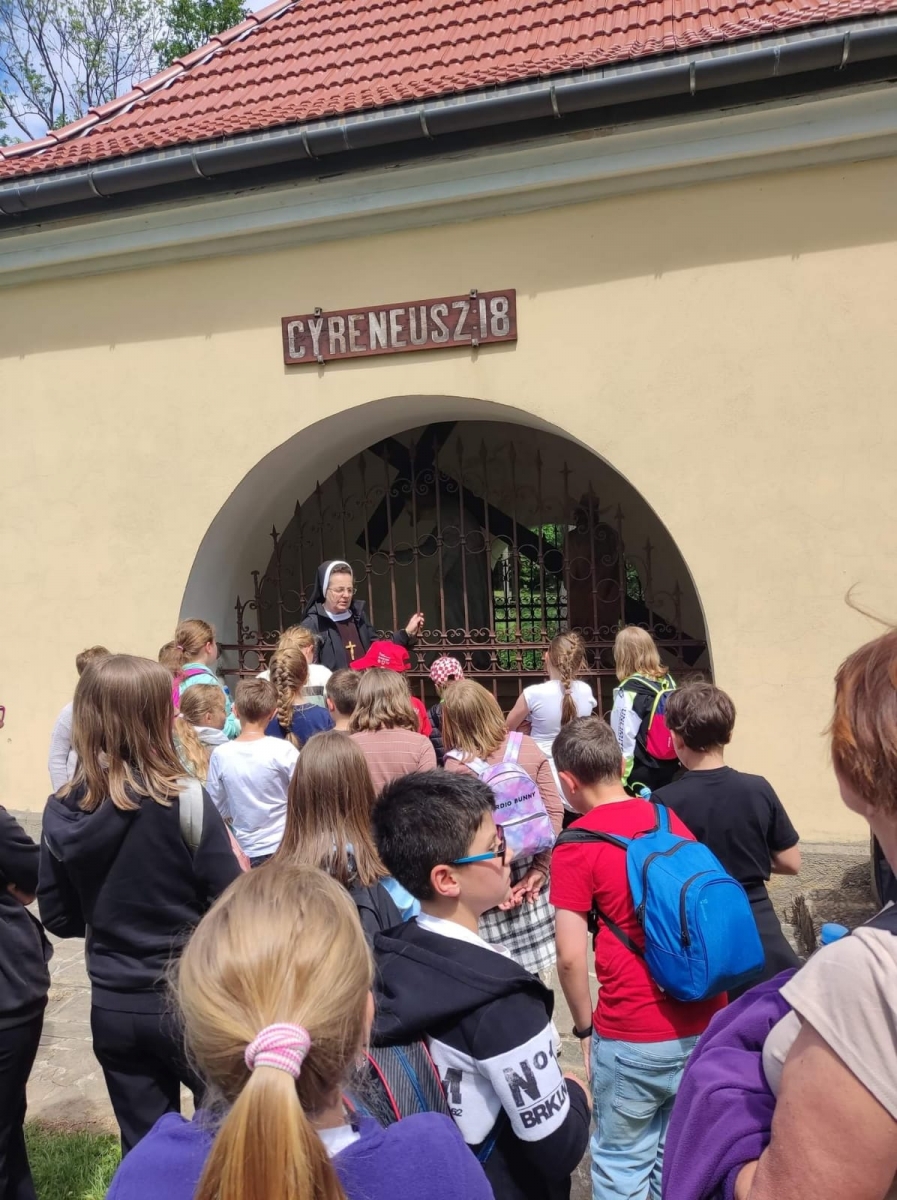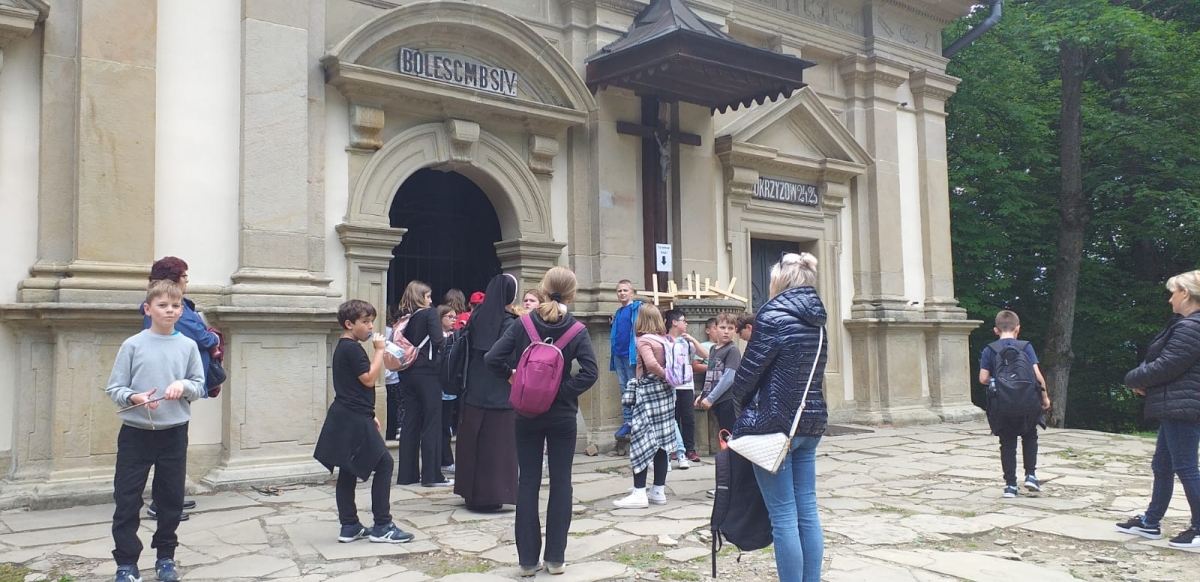 Kalwaria Zebrzydowska jest miejscem kultu Męki Pańskiej i kultu maryjnego. Kult Męki Pańskiej przejawia się w nabożeństwie dróżek Pana Jezusa i w obchodzie pasyjnym Wielkiego Tygodnia. Kult maryjny natomiast w nabożeństwie dróżkowym Matki Bożej, w Procesji pogrzebu i Triumfu Matki Bożej w sierpniu i w czci cudownego wizerunku Matki Bożej Kalwaryjskiej, który znajduje się tu od roku 1641. Opiekunami i stróżami sanktuarium, z woli pierwszego fundatora, Mikołaja Zebrzydowskiego są Bracia Mniejsi. W Polsce popularnie zwani bernardynami. Pierwsi bernardyni przybyli do Kalwarii w roku 1604, kiedy to rozpoczęto budowę kościoła i klasztoru. O godz. 08.20 wyruszyliśmy na naszą pielgrzymkę i już kilka minut po godz. 9 byliśmy na parkingu przed Sanktuarium. O godz. 10.00 uczestniczyliśmy we Mszy świętej, której przewodniczył i homilię wygłosił O. Tarsycjusz Bukowski ze Zgromadzenia Ojców Bernardynów. Uczniowie naszej Szkoły brali czynny udział w oprawie liturgicznej Mszy św. Jeden z rodziców odczytał Słowo Boże, cztery dziewczynki śpiewały psalm a inni przedstawili modlitwę wiernych. Po Mszy św. wszyscy udaliśmy się przed cudowny obraz Matki Bożej Kalwaryjskiej, aby Jej podziękować i prosić o opiekę oraz potrzebne łaski na drogę wierności Bogu. Po wyjściu z sanktuarium chwila przerwy na przygotowanie do pójścia dróżkami kalwaryjskimi. Wybraliśmy drogę Pana Jezusa idącego z krzyżem na Kalwarię. Przy każdej stacji Siostra Miriam powiedziała krótkie rozważanie a dzieci wyraziły intencje w których się modliliśmy. Po dotarciu na szczyt Kalwaryjski podziękowaliśmy wspólnie Bogu za dar zbawienia i prosiliśmy Go o błogosławieństwo i pomoc w dotarciu do nieba, które nam otworzył. Stromą drogą z góry dotarliśmy na Dziedziniec Sanktuarium, gdzie pielgrzymi mogli odpocząć, skorzystać z posiłków w Restauracji czy odwiedzić przyklasztorny sklepik z dewocjonaliami i pamiątkami. Ostatnim punktem naszej pielgrzymki była wspólna modlitwa koronką do Bożego Miłosierdzia o godzinie 15.00 w kaplicy Najświętszego Sakramentu.