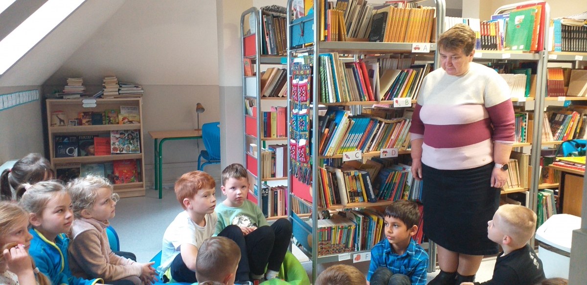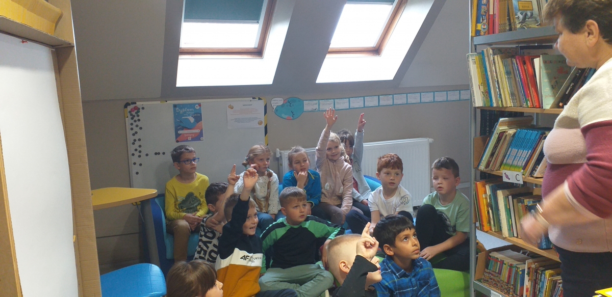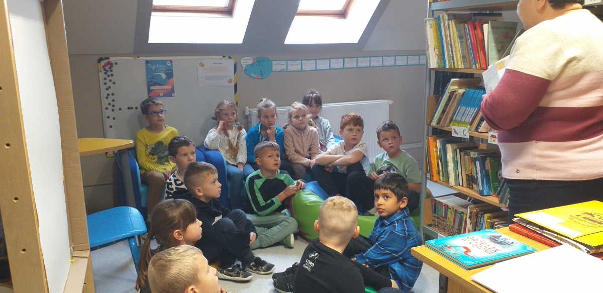 Nasza pani bibliotekarka zaprosiła najmłodszych uczniów do szkolnej biblioteki, gdzie pokazała zbiory i ciekawie opowiadała zasadach korzystania z tego miejsca. Pierwszoklasiści wysłuchali piosenki o książkach, a także z zaangażowaniem rozwiązywali przygotowane przez panią Ulę Lusinę zagadki. Potrafili również powiedzieć, jak należy dbać o książki.