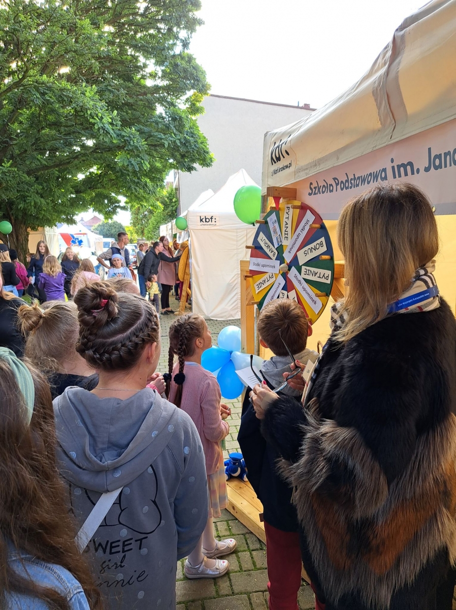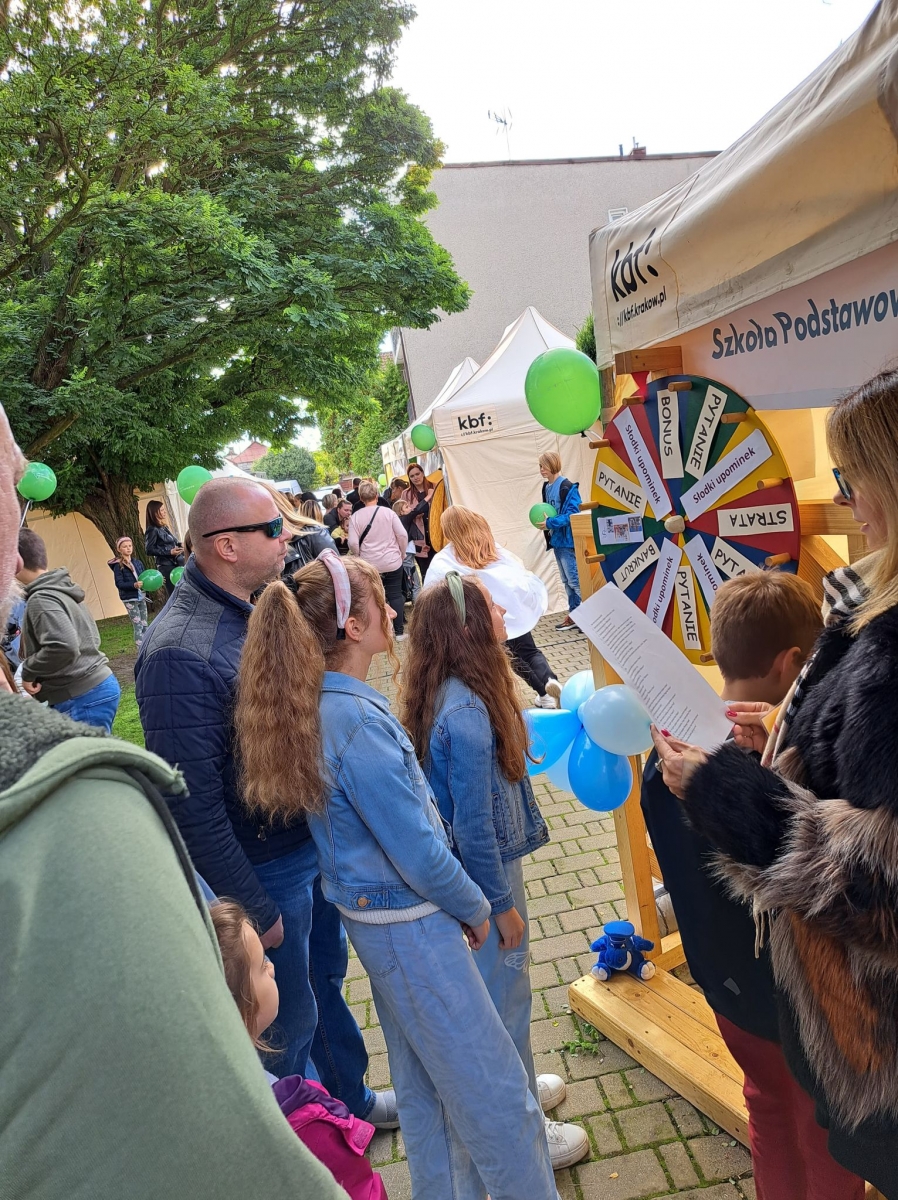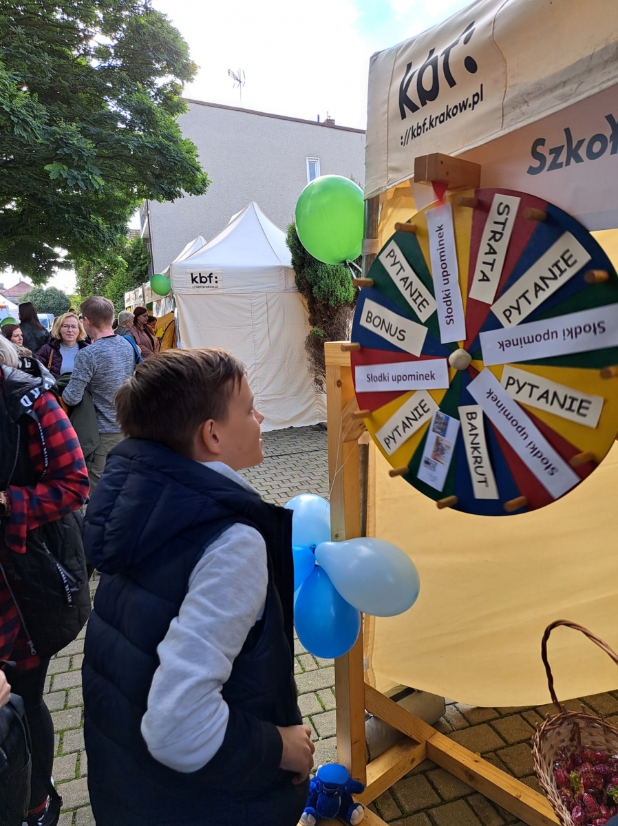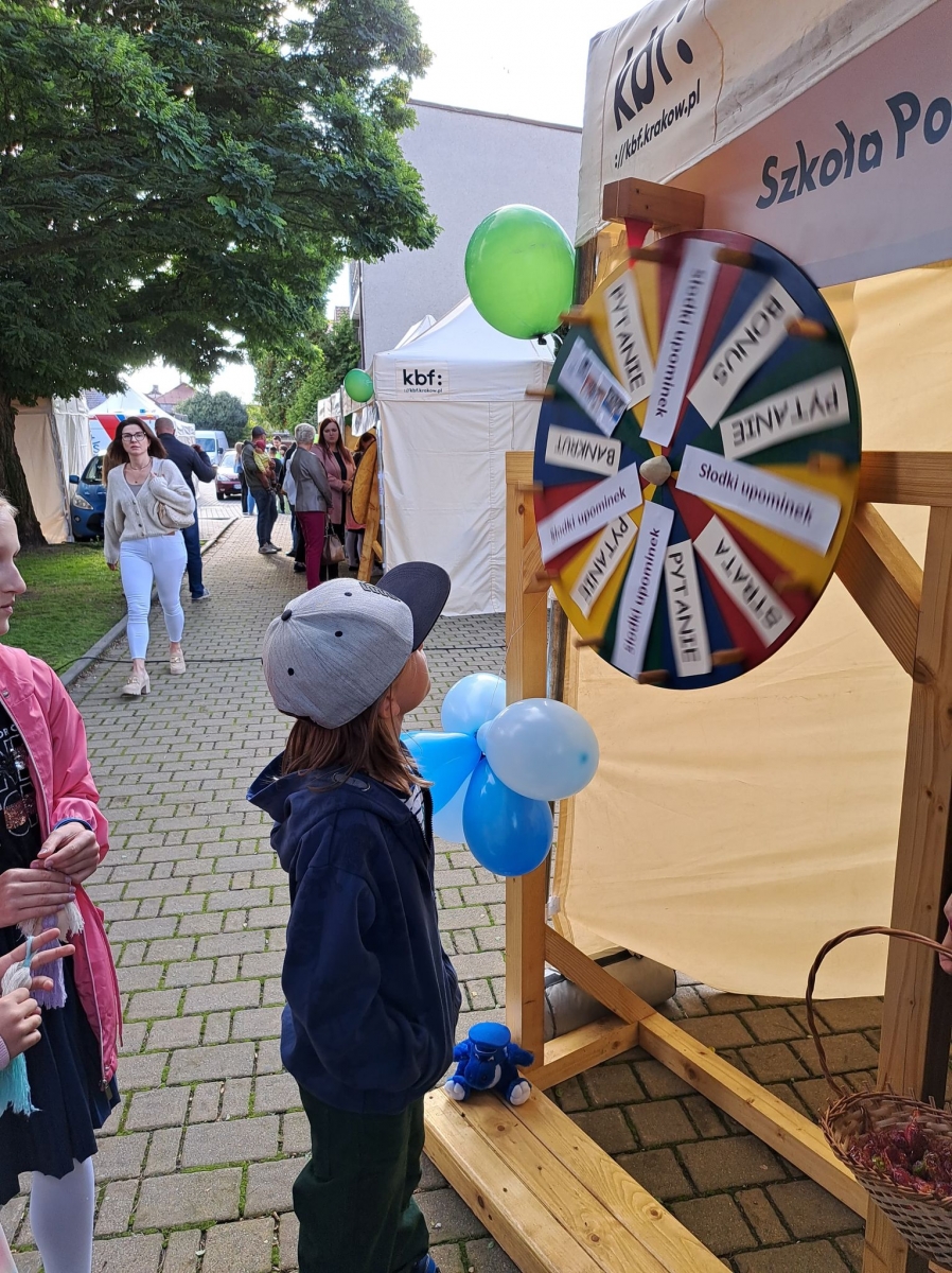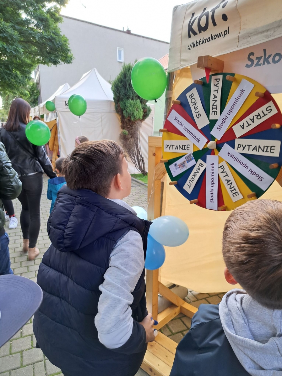 W czasie całego festynu wolontariusze z naszej szkoły otaczali opieką wszystkich odwiedzających nasze stoisko, gdzie już tradycyjnie było wyeksponowane koło fortuny, które podobnie jak gadżety z logo szkoły, cieszyło się dużą popularnością. Każdy mógł spróbować szczęścia i wylosować słodki upominek lub linijkę czy kredki ozdobione logo. Nawet przy kaprysach losu bankrut też nie odchodził z pustymi rękami, każdy otrzymywał małe, słodkie pocieszenie.