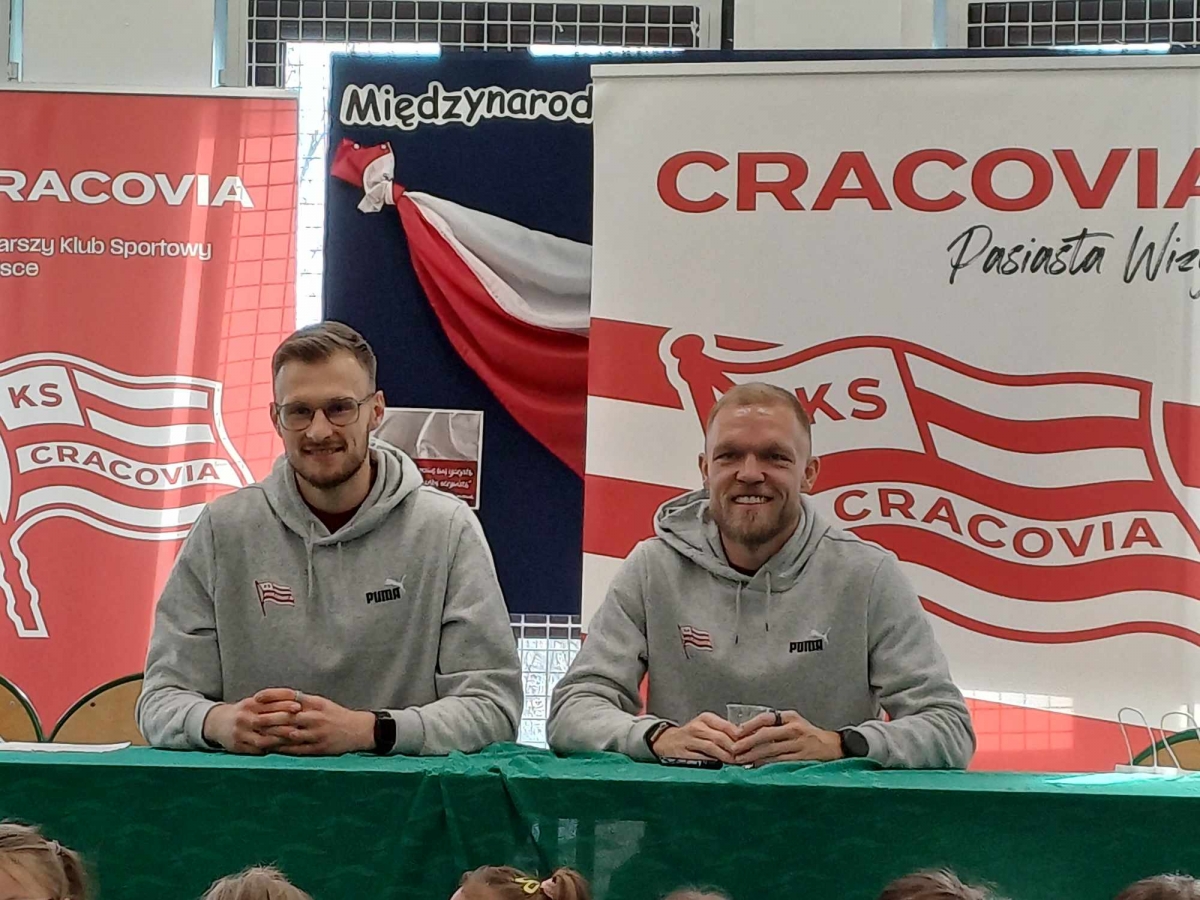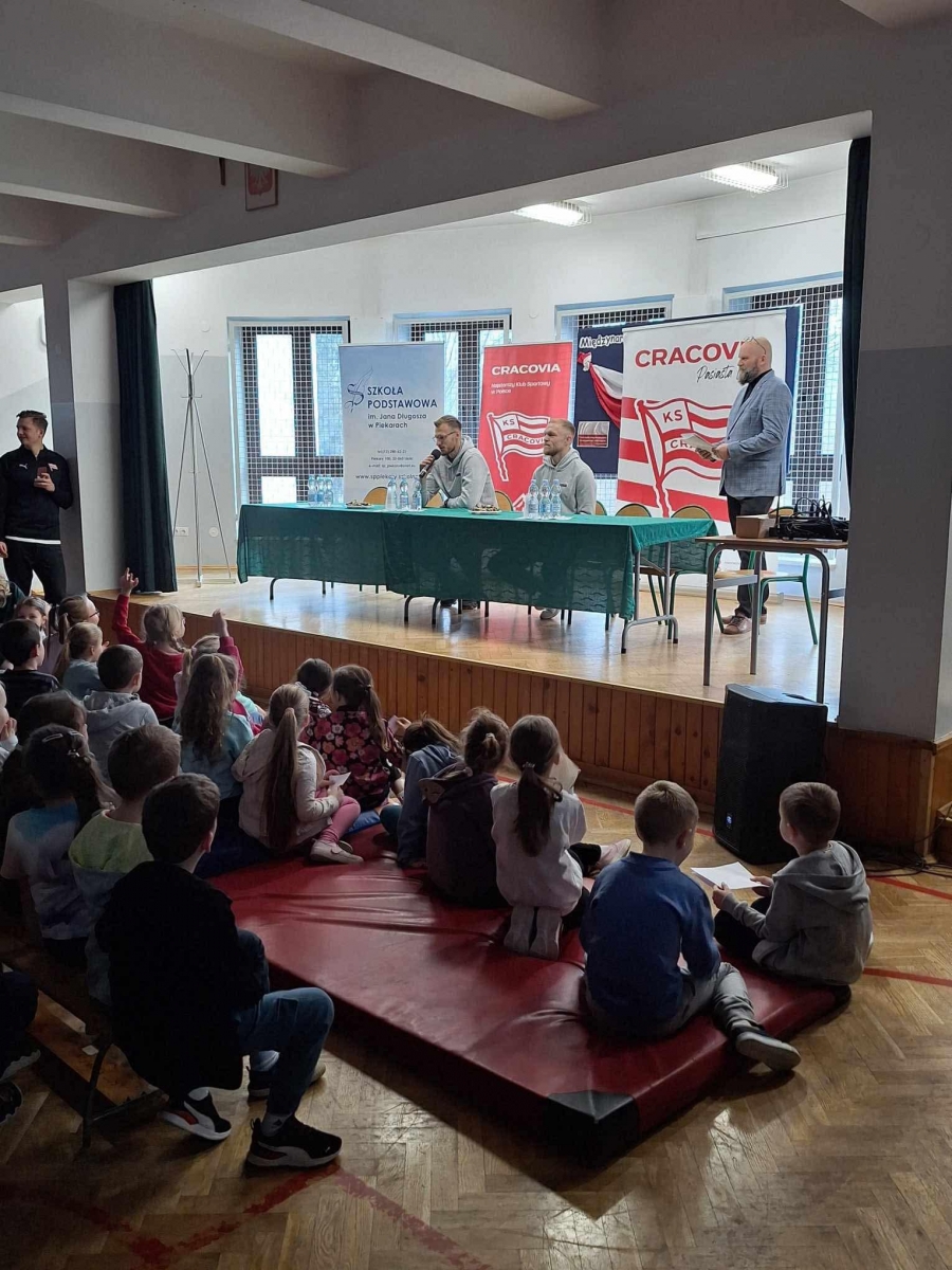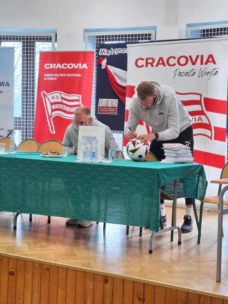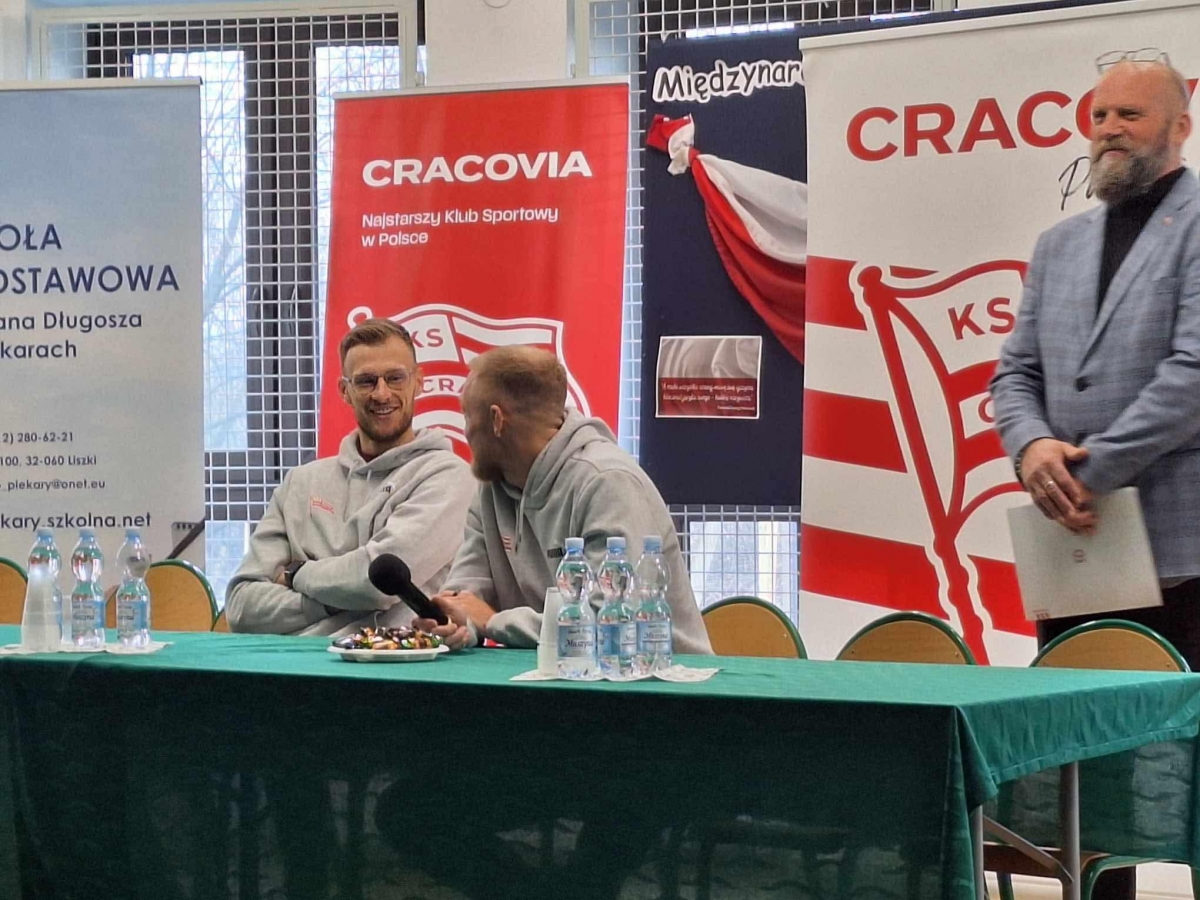 26 lutego 2025 był bardzo ważnym dniem w naszej szkole dla wszystkich kibiców Cracovii. O godzinie 9.00 pojawili się na sali gimnastycznej napastnik Mick Van Buren i bramkarz Henrich Ravas. Panowie opowiedzieli o tym jak zaczynali swoją piłkarską przygodę, o tym jakimi uczniami byli i jak wygląda ich trening. Uczniowie zaś przygotowali wiele pytań do zawodników Cracovii. Padały pytania o ilość bramek, asyst, czas trwania treningów, kluby, w których sportowcy grali wcześniej. Po serii pytań nadszedł wyczekiwany czas na autografy i zdjęcia. Uczniowie prosili o podpisy na piłkach, książkach, zeszytach, koszulkach, a nawet .... butach. Wszyscy uczestnicy spotkania otrzymali klubowe zeszyty i smyczki. Sportowcom podziękowaliśmy dyplomem i gorącymi brawami. Patrząc na radość naszych małych kibiców i wielkie uśmiechy zawodników spotkanie dla obu stron było niezwykłym przeżyciem. Już dzisiaj zaprosiliśmy zawodników do naszej nowej sali, na której może odbyć się nawet trening.