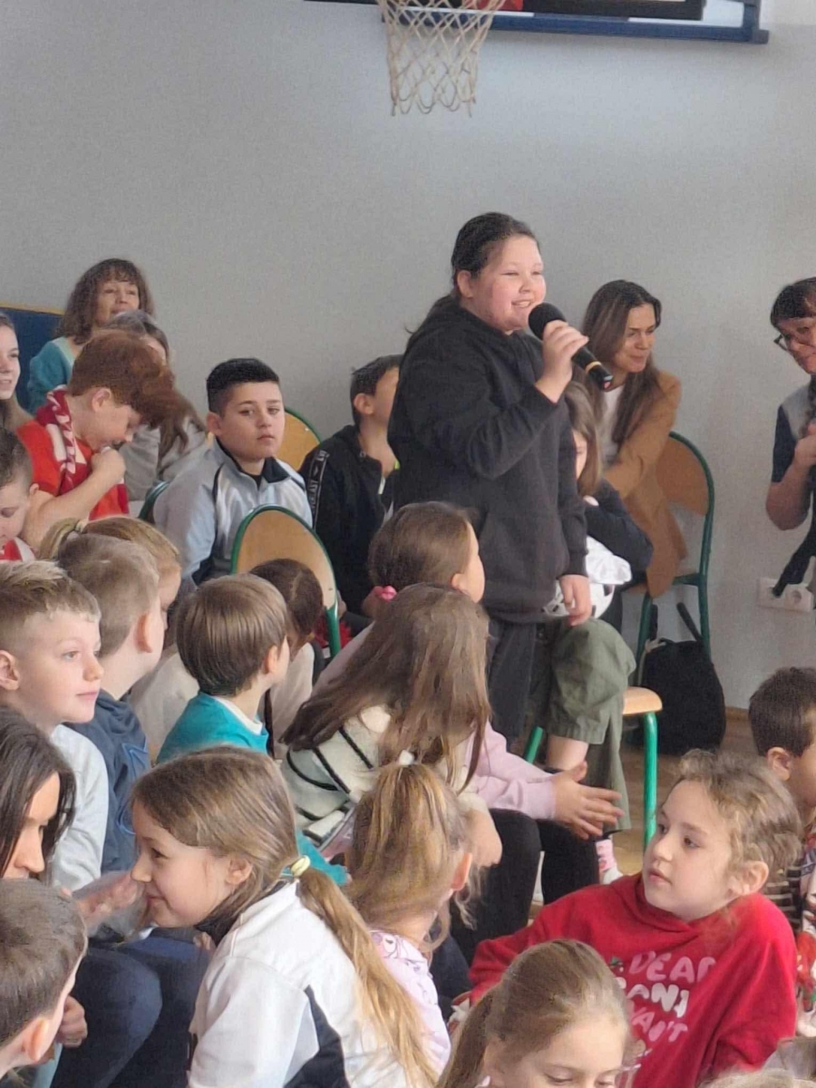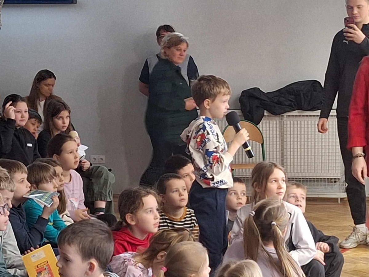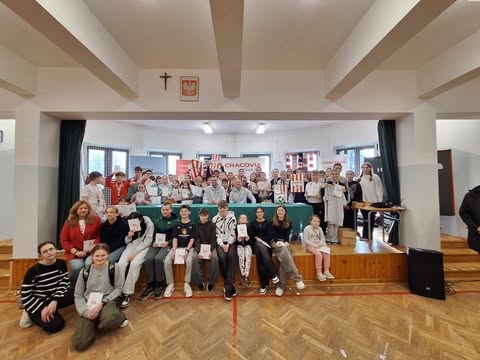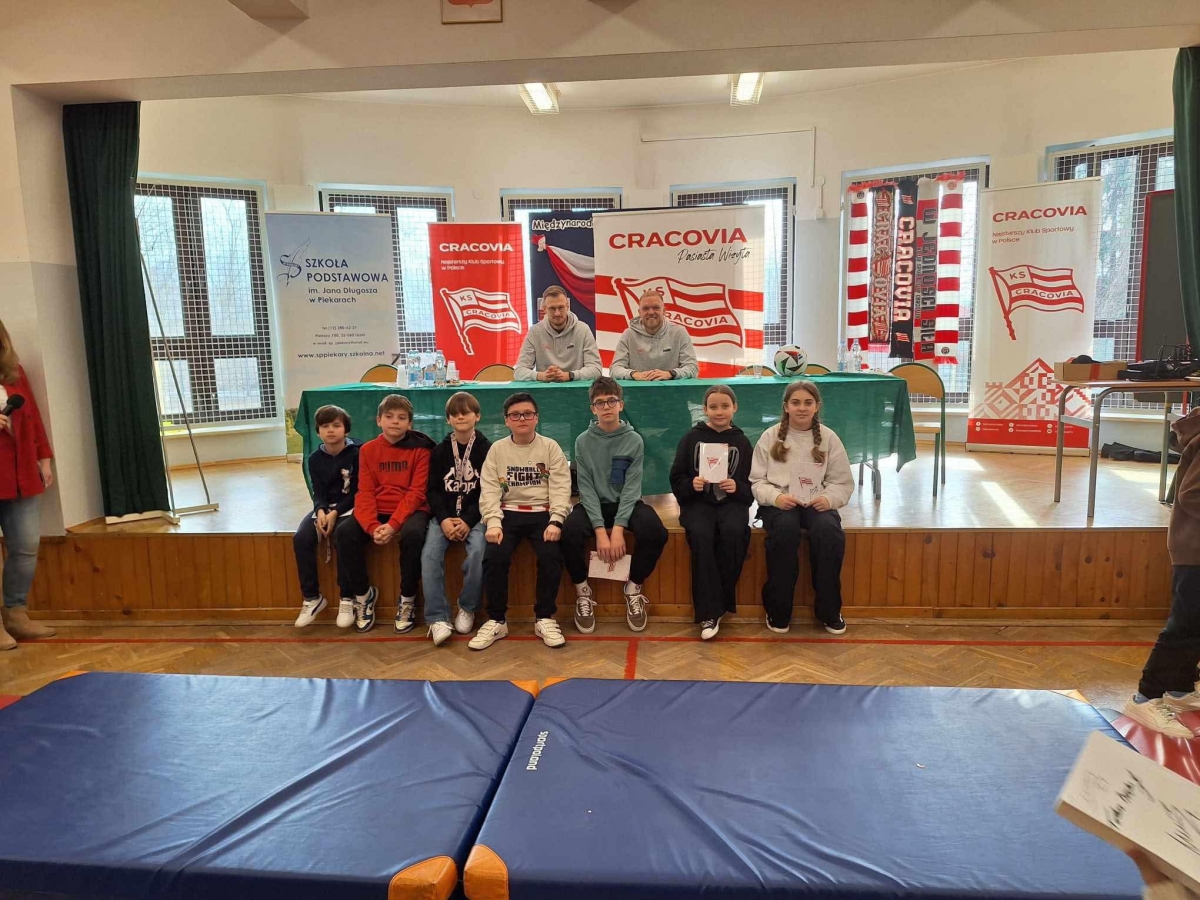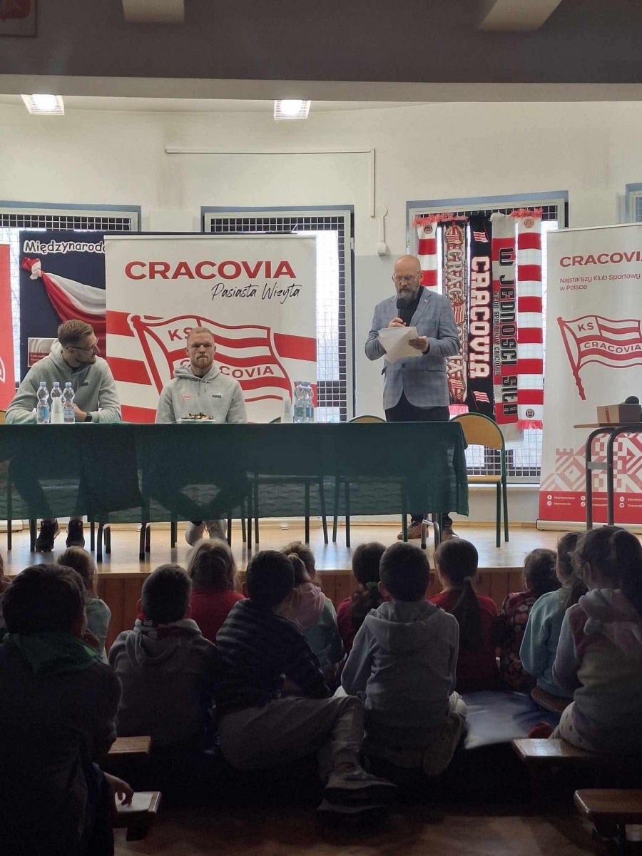 26 lutego 2025 był bardzo ważnym dniem w naszej szkole dla wszystkich kibiców Cracovii. O godzinie 9.00 pojawili się na sali gimnastycznej napastnik Mick Van Buren i bramkarz Henrich Ravas. Panowie opowiedzieli o tym jak zaczynali swoją piłkarską przygodę, o tym jakimi uczniami byli i jak wygląda ich trening. Uczniowie zaś przygotowali wiele pytań do zawodników Cracovii. Padały pytania o ilość bramek, asyst, czas trwania treningów, kluby, w których sportowcy grali wcześniej. Po serii pytań nadszedł wyczekiwany czas na autografy i zdjęcia. Uczniowie prosili o podpisy na piłkach, książkach, zeszytach, koszulkach, a nawet .... butach. Wszyscy uczestnicy spotkania otrzymali klubowe zeszyty i smyczki. Sportowcom podziękowaliśmy dyplomem i gorącymi brawami. Patrząc na radość naszych małych kibiców i wielkie uśmiechy zawodników spotkanie dla obu stron było niezwykłym przeżyciem. Już dzisiaj zaprosiliśmy zawodników do naszej nowej sali, na której może odbyć się nawet trening.