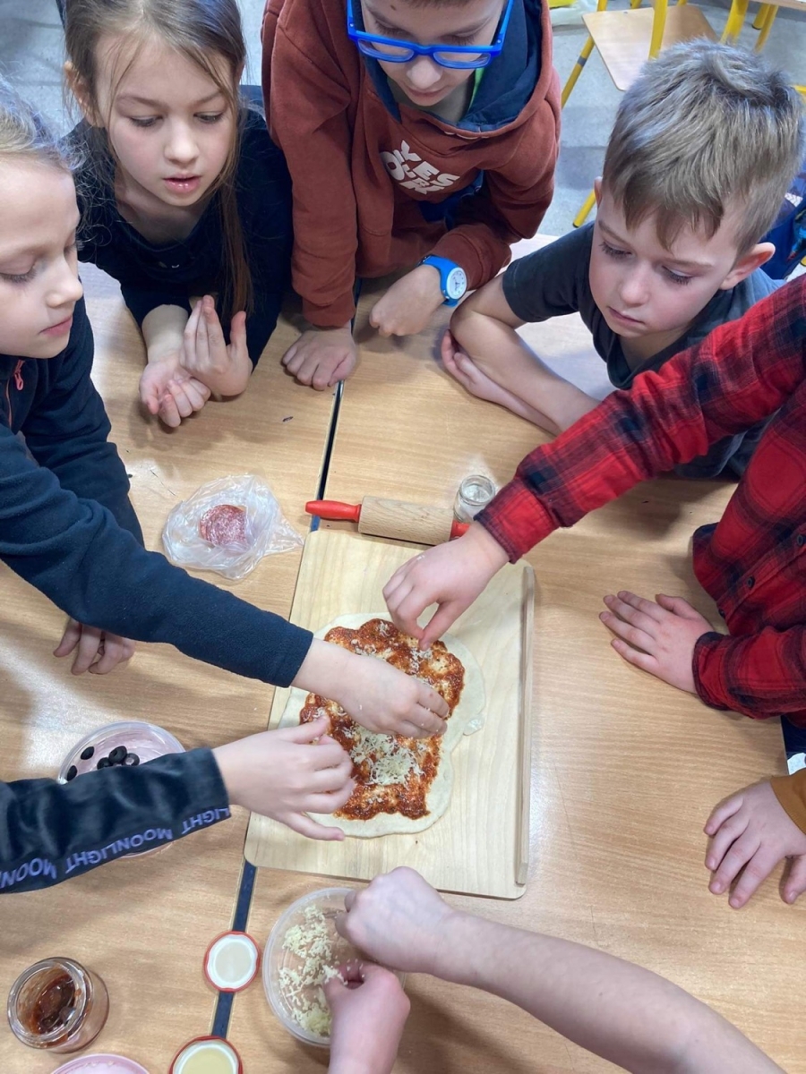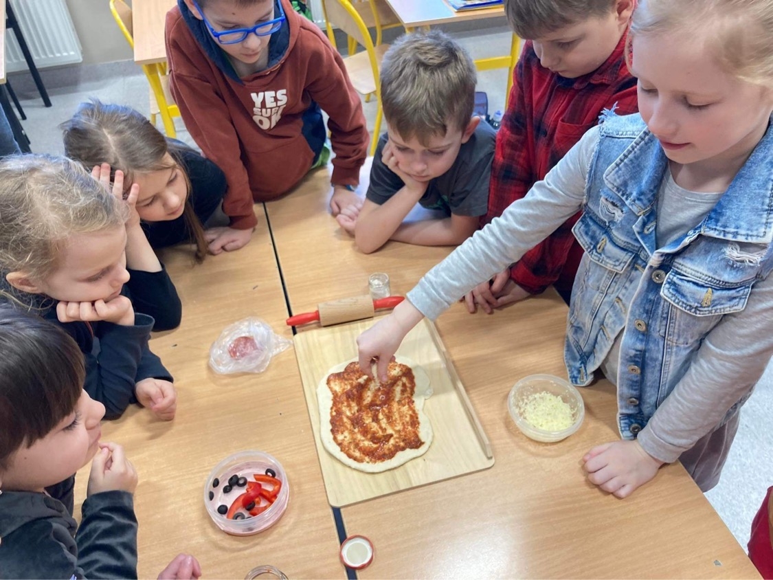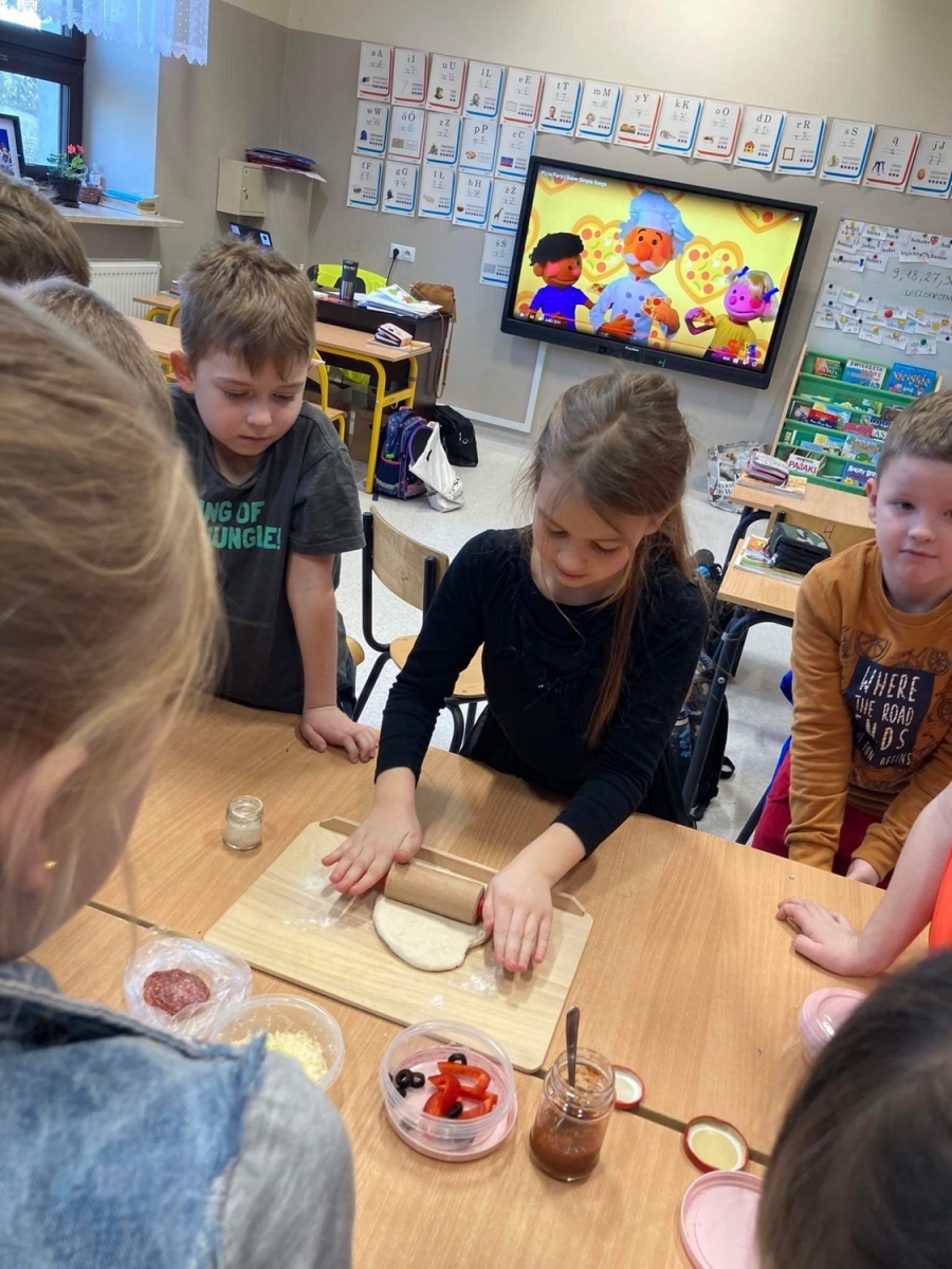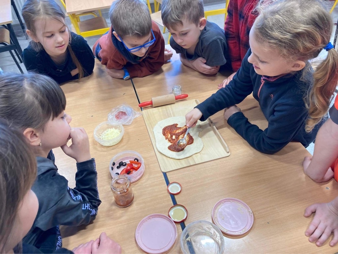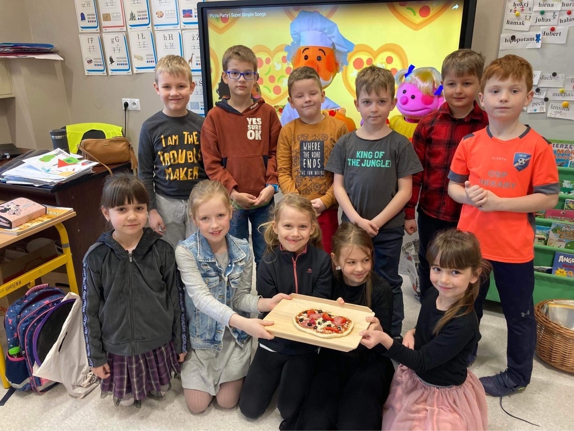W ramach projektu „English Special Days” uczniowie klasy 1 zajęli się przygotowywaniem pizzy. Dzieci najpierw poznały słownictwo związane z produktami spożywczymi i czynnościami związanymi z przygotowaniem pizzy. Po zaśpiewaniu piosenki zabraliśmy się do wałkowania ciasta i układania poszczególnych składników. Efekt końcowy był pachnący i wyglądał na prawdę apetycznie.