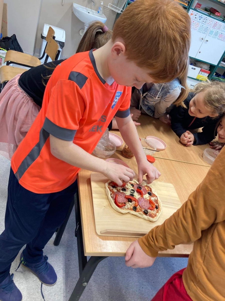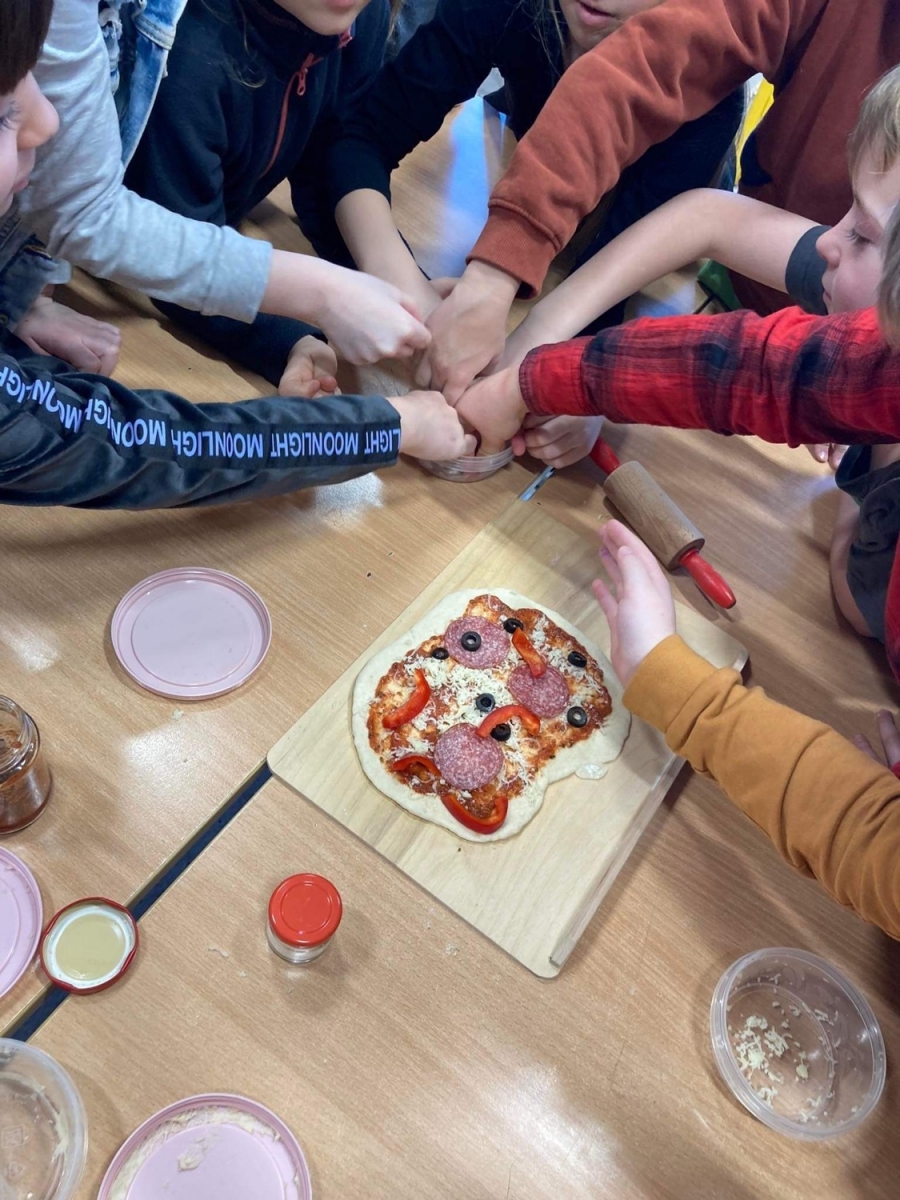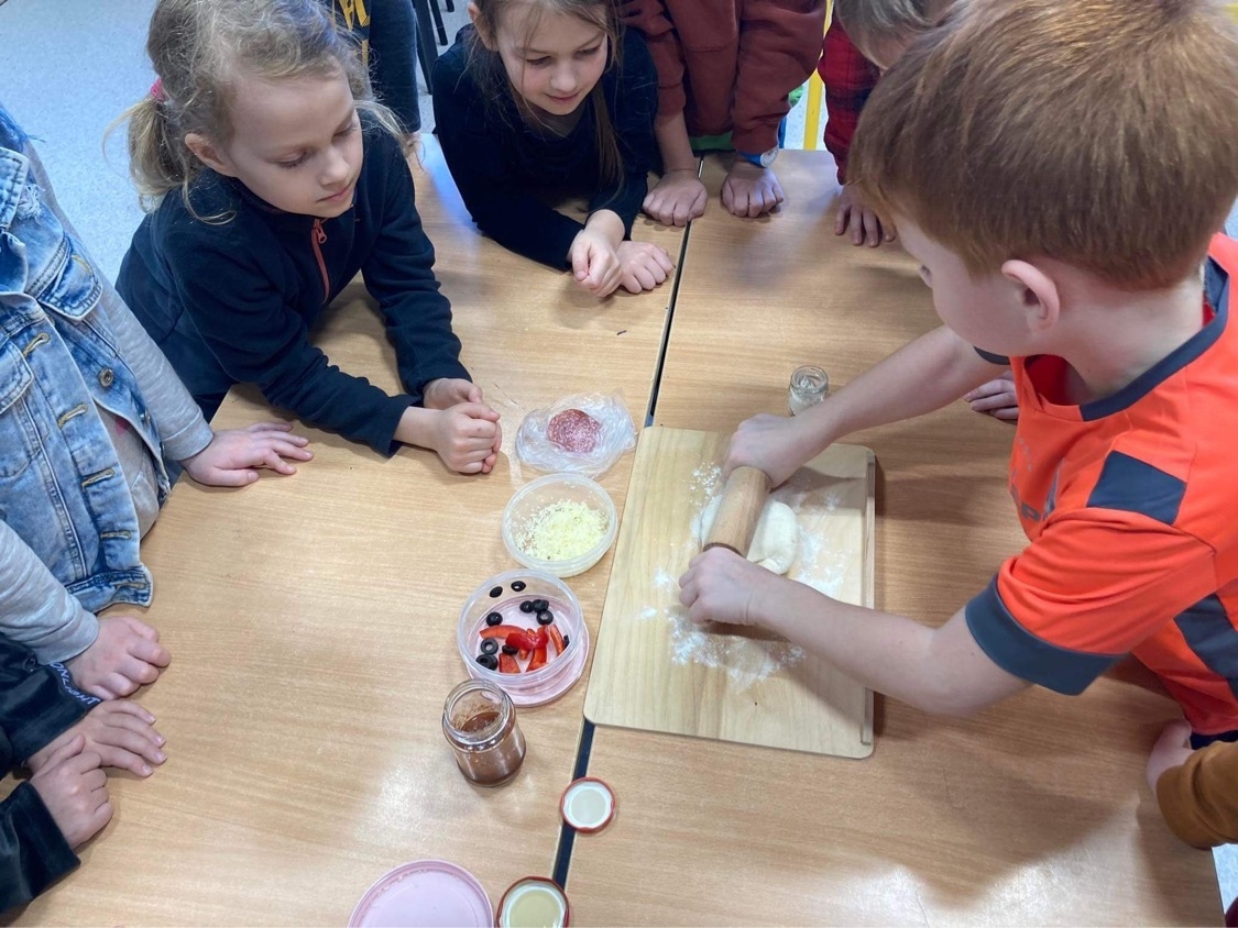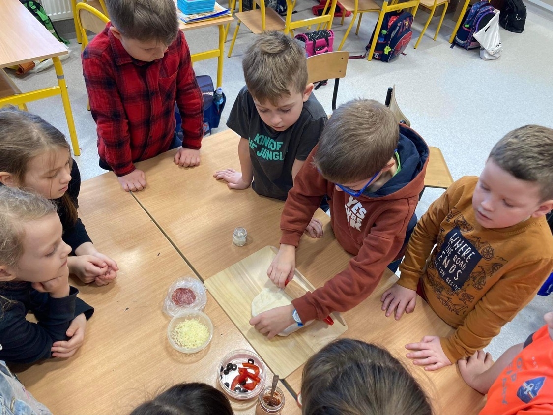 W ramach projektu „English Special Days” uczniowie klasy 1 zajęli się przygotowywaniem pizzy. Dzieci najpierw poznały słownictwo związane z produktami spożywczymi i czynnościami związanymi z przygotowaniem pizzy. Po zaśpiewaniu piosenki zabraliśmy się do wałkowania ciasta i układania poszczególnych składników. Efekt końcowy był pachnący i wyglądał na prawdę apetycznie.