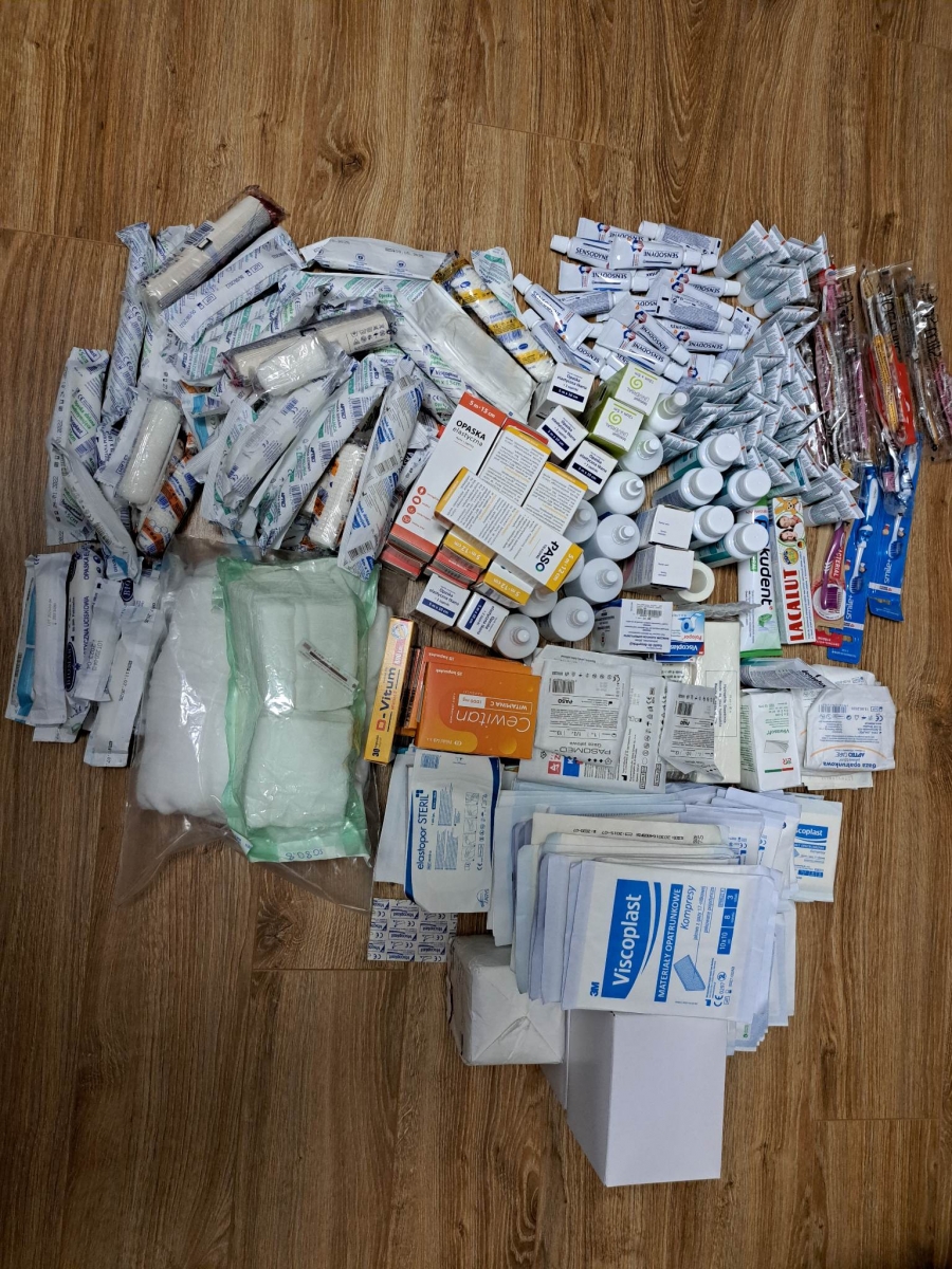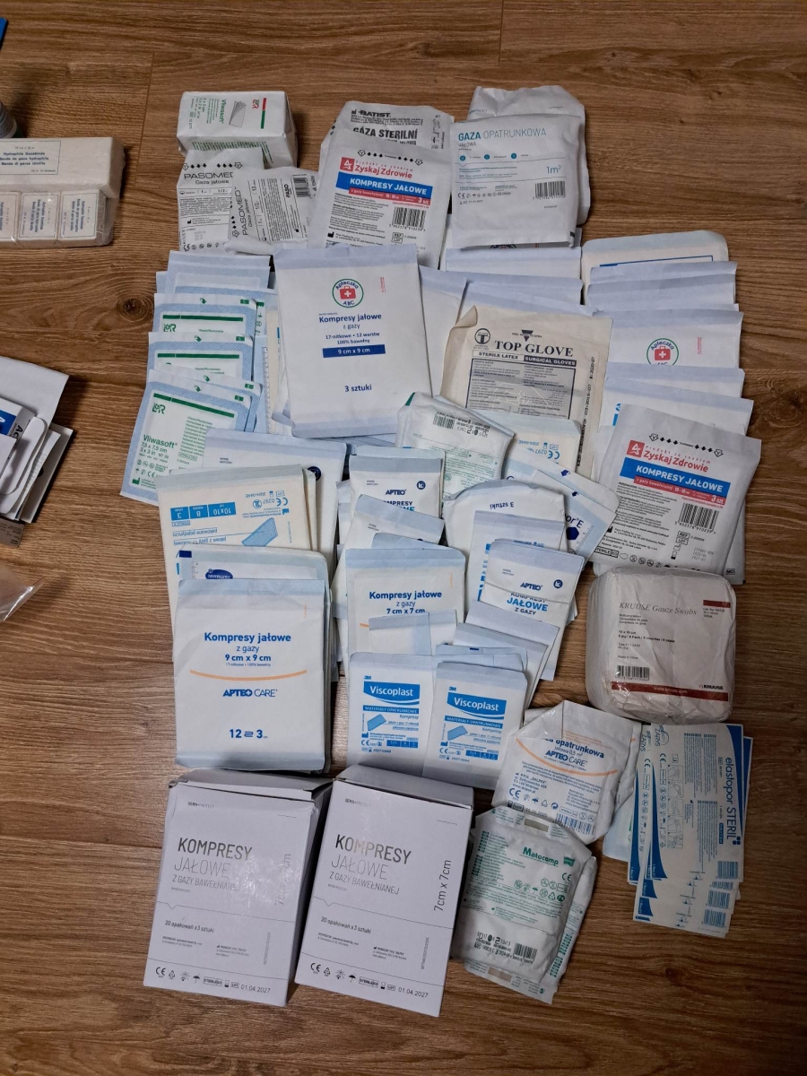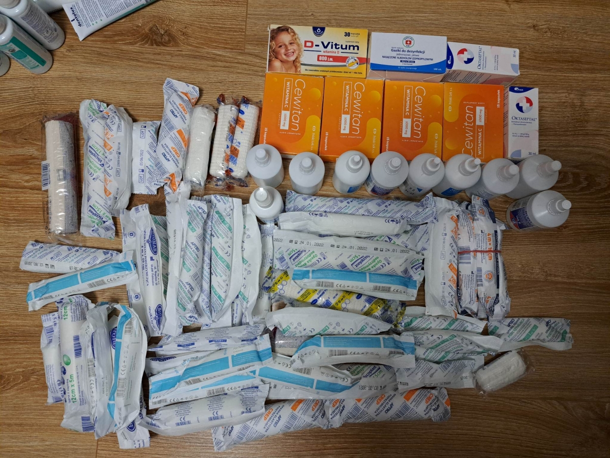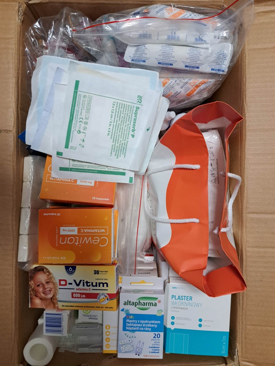 W ramach akcji zostały zebrane: kompresy jałowe, gazy opatrunkowe, jałowe opatrunki, plastry, gaziki odkażające i inne środki do odkażania ran, opaski uciskowe, bandaże, przybory do mycia zębów.