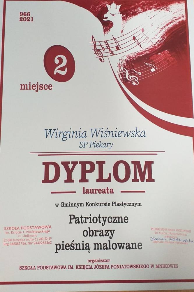 Wykonane prace zachwycały wszystkich, były pomysłowe, bardzo staranne, estetyczne i pięknie ilustrowały nasze pieśni patriotyczne. Niestety do Szkoły w Mnikowie, która była organizatorem konkursu mogła iść tylko jedna praca z każdej kategorii wiekowej. Po długich naradach szkolne jury wybrało finalistów szkolnego etapu: Oliwię Kolasę i Wirginię Wiśniewską.