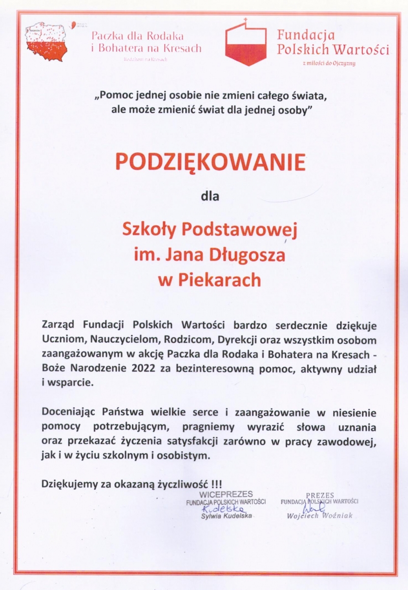 Do naszej szkoły wpłynęło specjalne podziękowanie dla całej społeczności naszej szkoły za zaangażowanie w niesienie pomocy potrzebującym.