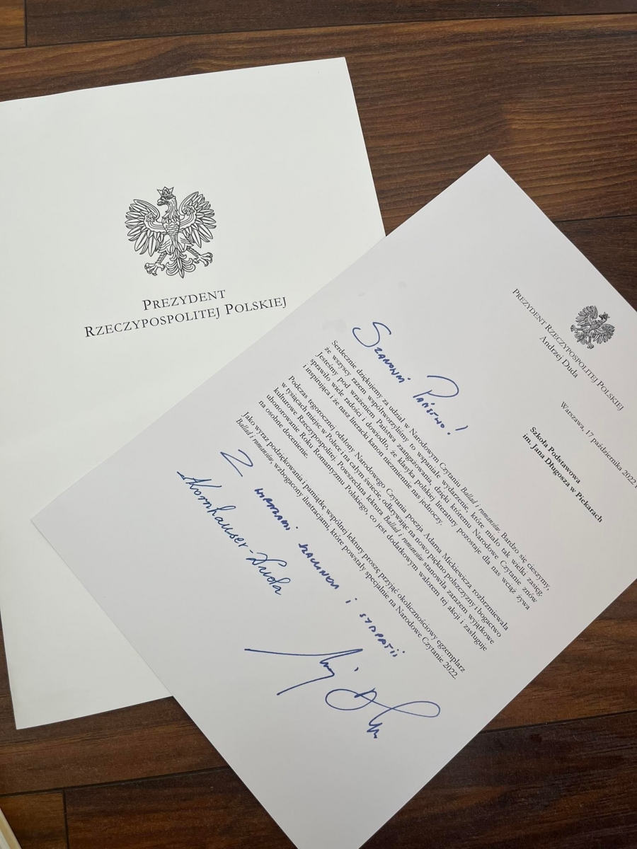 Miło nam poinformować, że otrzymaliśmy podziękowania od Prezydenta RP Andrzeja Dudy za udział w tegorocznej edycji Narodowego Czytania, która odbyła się w naszej szkole 2 września 2022 roku.