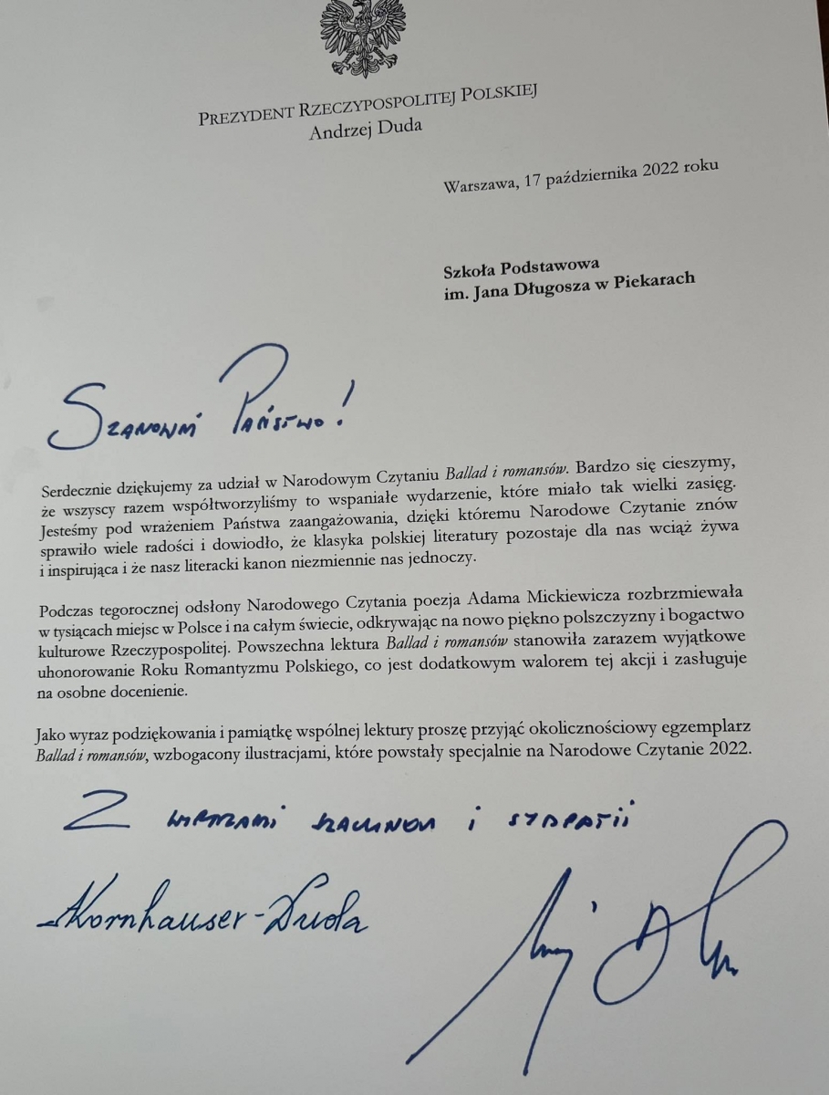 Wraz z listem przesłane zostały okolicznościowe, bogato ilustrowane egzemplarze tegorocznej lektury wspólnego czytania, czyli “BALLADY I ROMANSE” Adama Mickiewicza wraz z podpisami Pana Prezydenta RP Andrzeja Dudy oraz Pierwszej Damy.