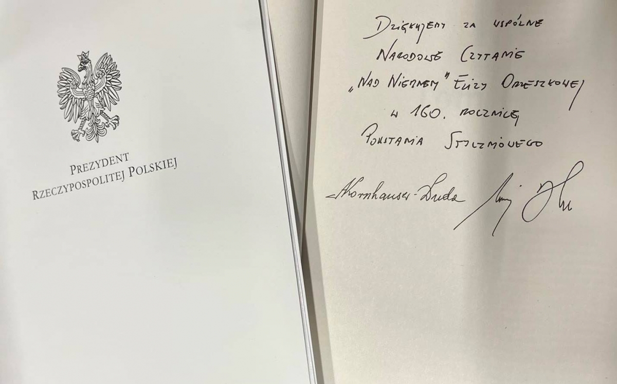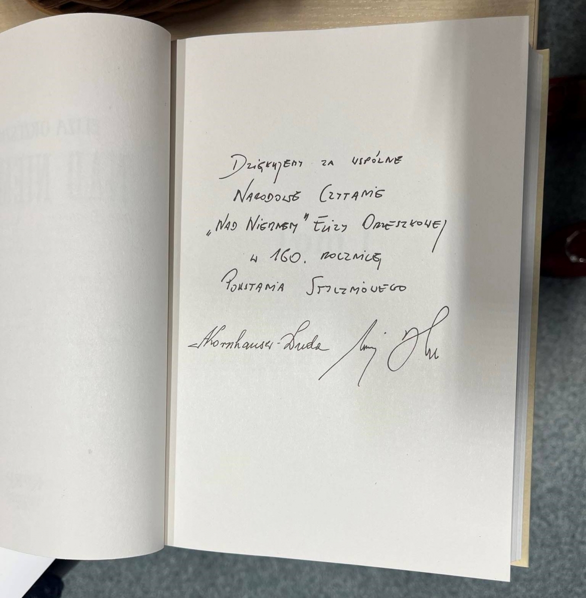 Wraz z listem przesłany został piękny okolicznościowy egzemplarz tegorocznej lektury wspólnego czytania, czyli “Nad Niemnem” Elizy Orzeszkowej wraz z podpisami Pana Prezydenta RP Andrzeja Dudy oraz Pierwszej Damy.