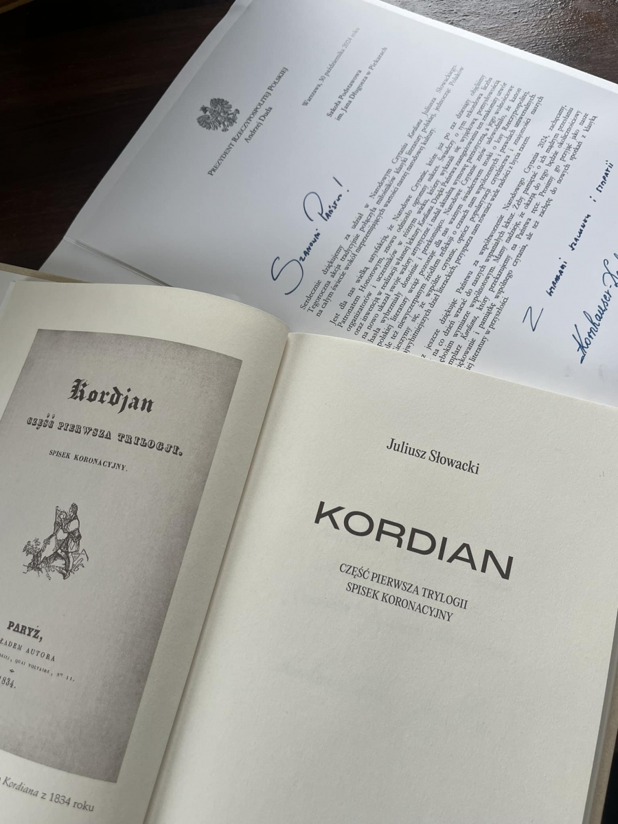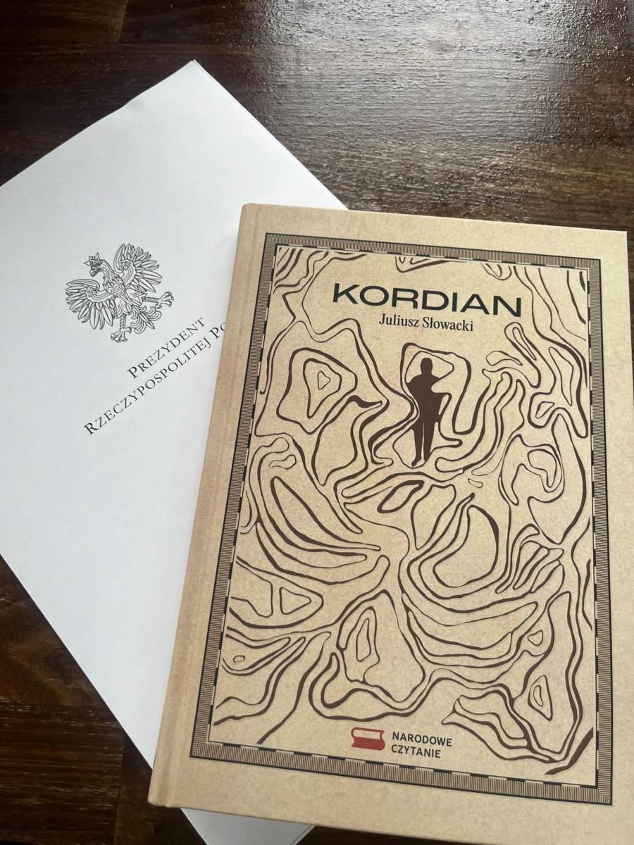 Wraz z listem podpisanym przez Parę Prezydencką został przesłany do naszej szkoły piękny, okolicznościowy egzemplarz tegorocznej lektury wspólnego czytania, czyli “Kordiana” Juliusza Słowackiego.