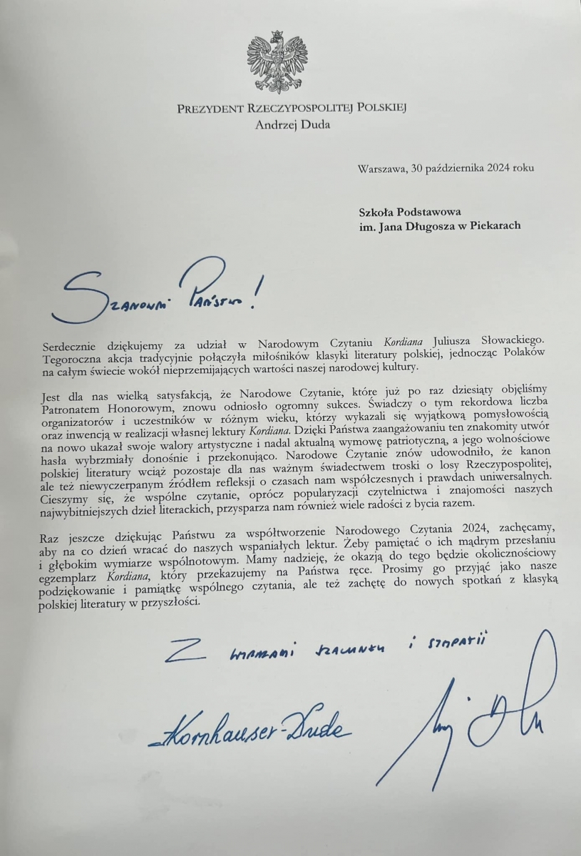 Miło nam poinformować, że kolejny już raz otrzymaliśmy podziękowania od Prezydenta RP Andrzeja Dudy za udział w tegorocznej edycji Narodowego Czytania.