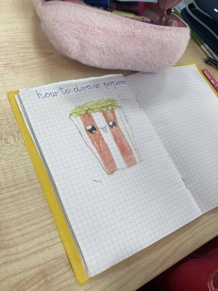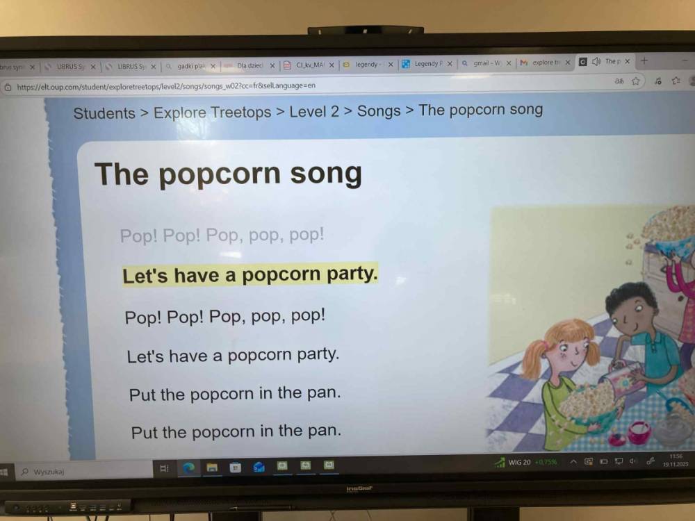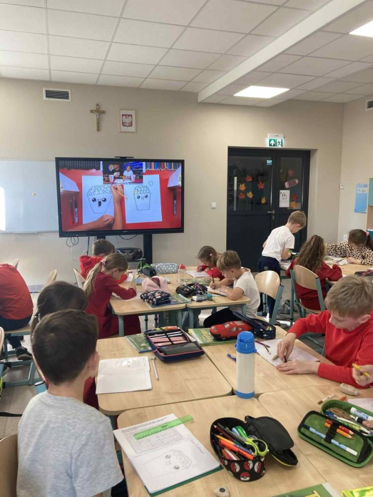 Wspólnie uczyliśmy się piosenki i rysowaliśmy krok po kroku pudełko pełne popcornu instruowani przez anglojęzycznego lektora. Nie obyło się także bez degustacji