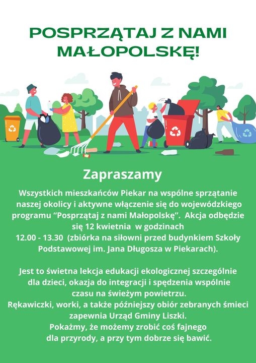 Posprzątaj z nami Małopolskę! to inicjatywa Urzędu Małopolskiego, która skupia lokalne społeczności wokół idei zachowania środowiska naturalnego. Akcja ma zwrócić uwagę na problem pozostawiania śmieci na terenach rekreacyjnych i turystycznych, a także zaszczepić w najmłodszych troskę o przyrodę.