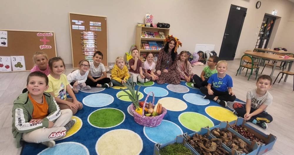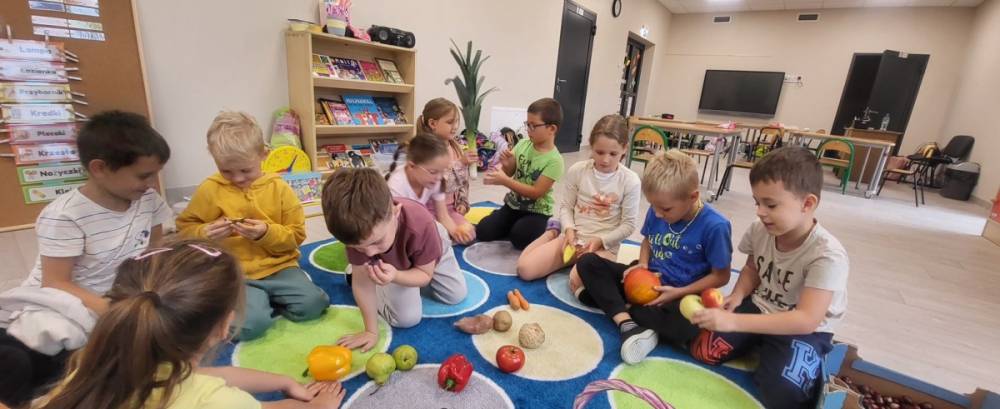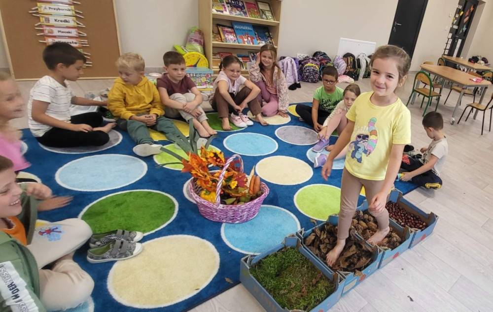Podczas zajęć pierwszoklasiści przypomnieli sobie także jesienne warzywa i owoce, które są ważną częścią zdrowej diety. Była to świetna okazja, by porozmawiać o tym, co można znaleźć na straganach i w ogrodach o tej porze roku. Na zakończenie dzieci wykorzystały kasztany również do zabawy z liczeniem, łącząc przyjemne doznania z nauką matematyki.