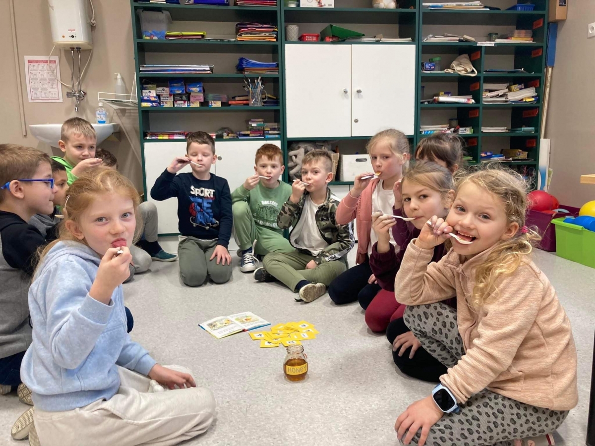 Aby jeszcze lepiej poznać świat Kubusia, uczniowie smakowali miód i cieszyli się z tego nie mniej niż nasz dzisiejszy bohater.