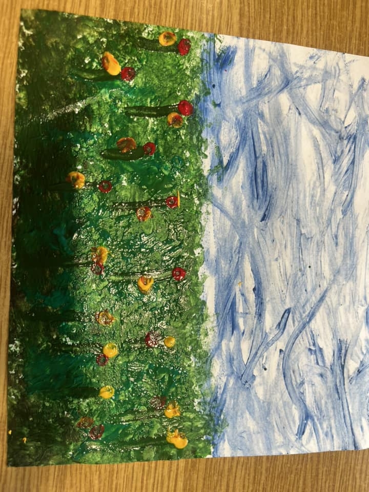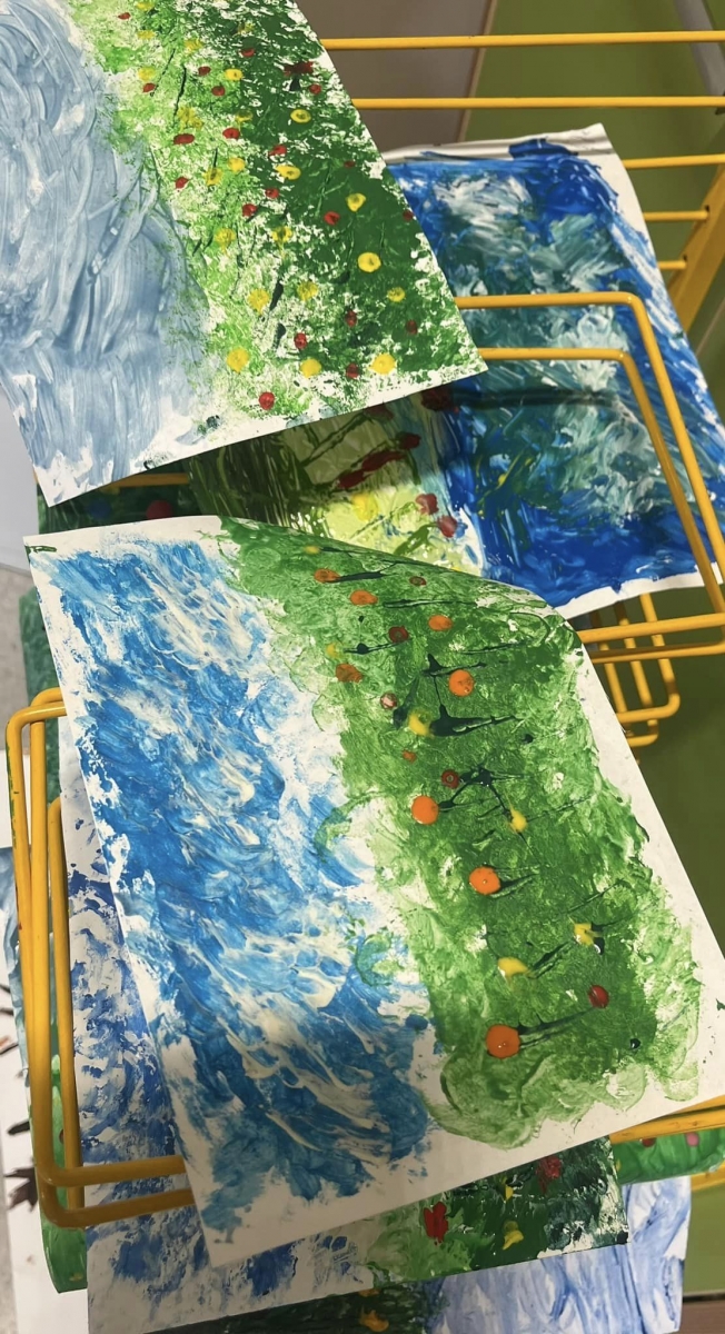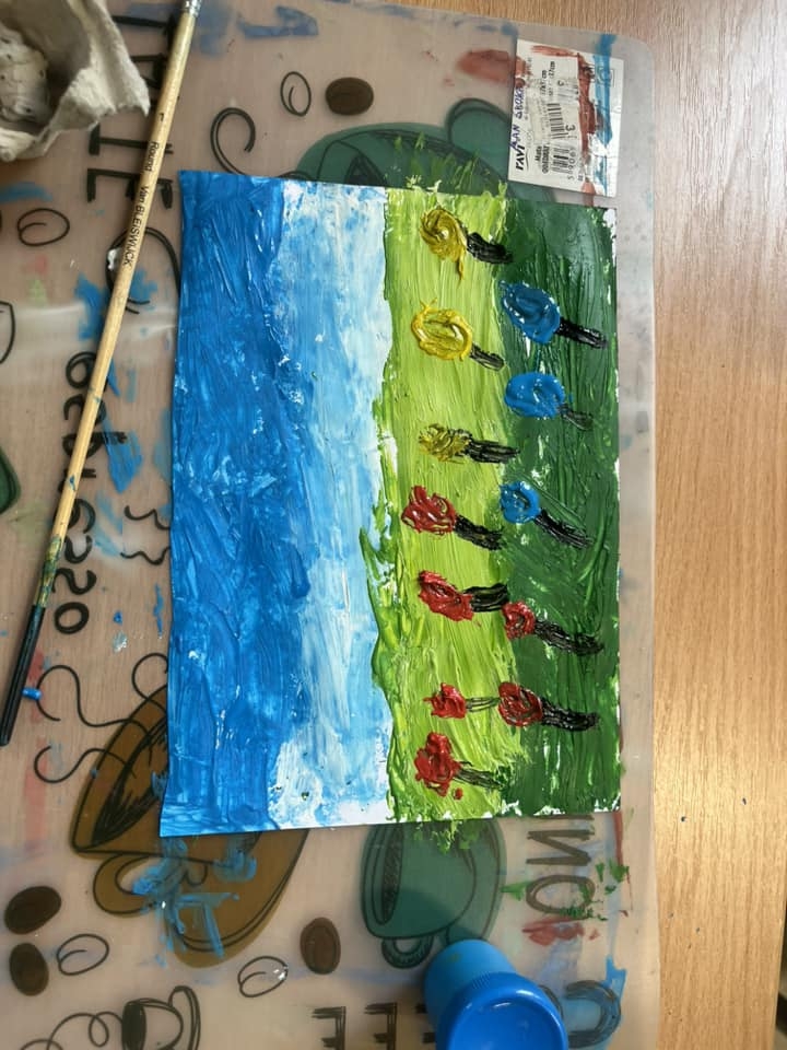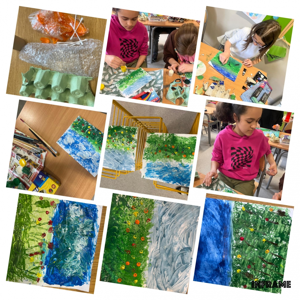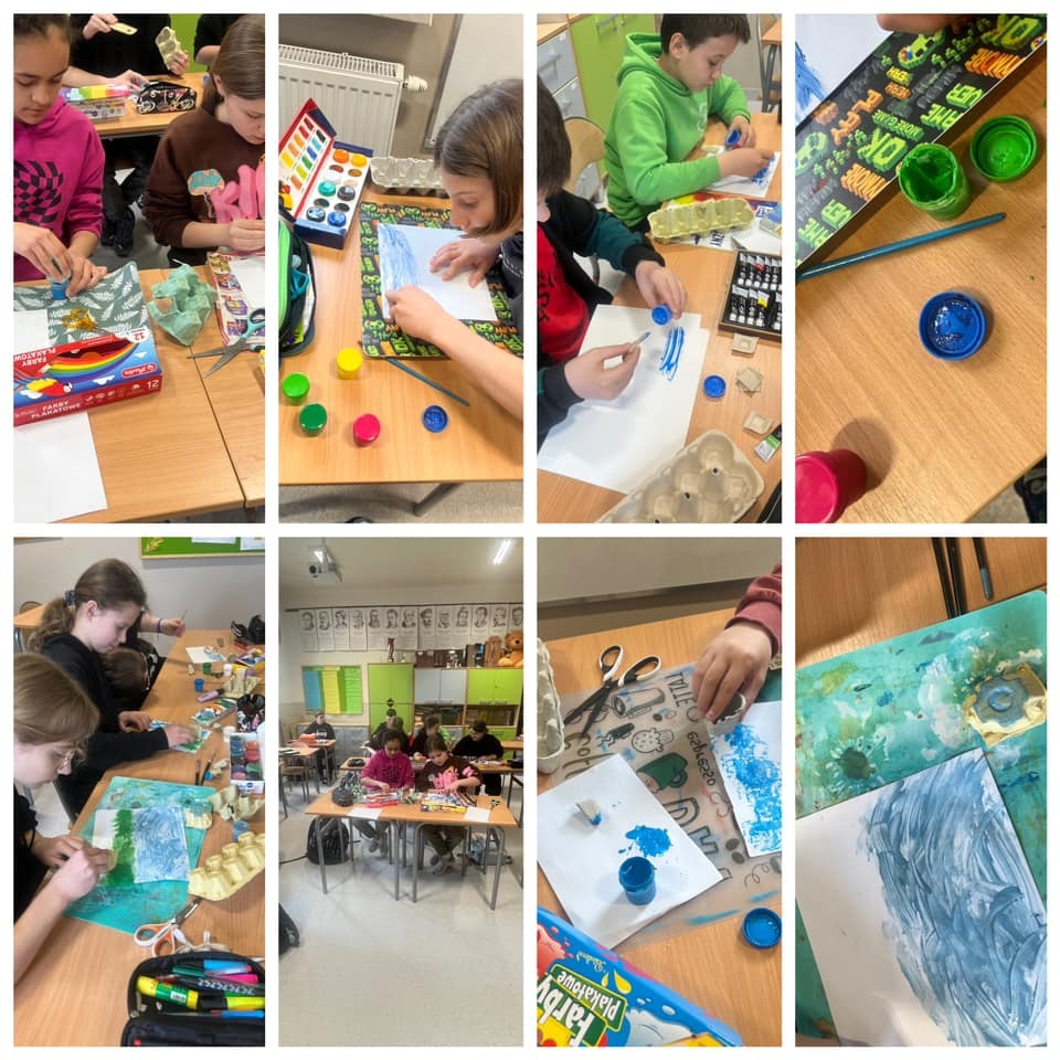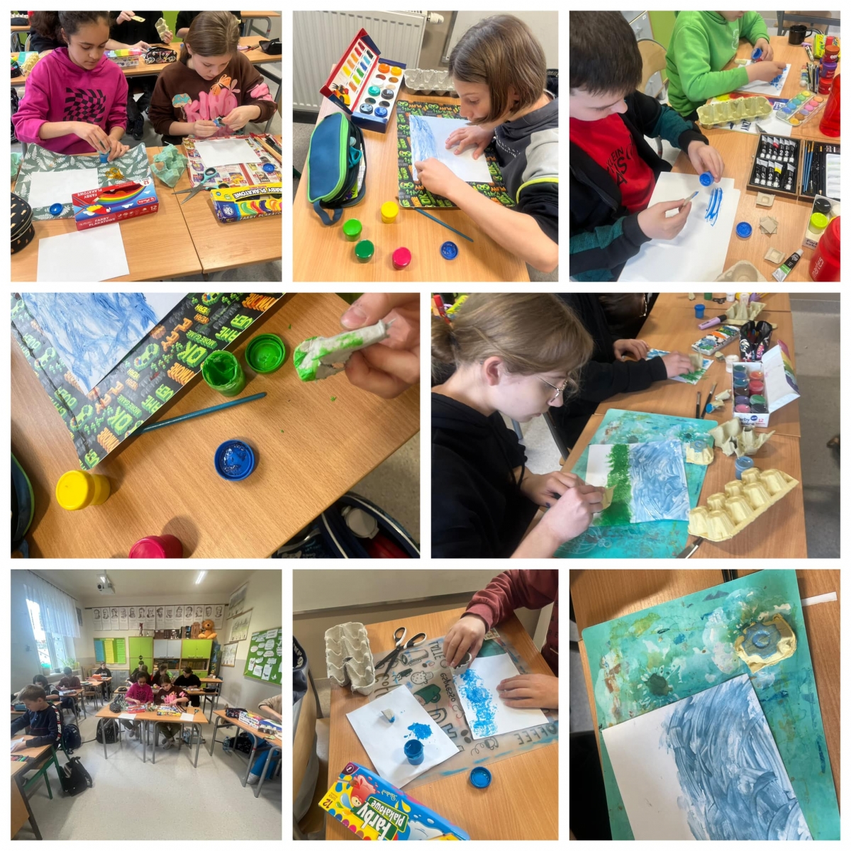 Uczniowie kl. V przystąpili do realizacji projektu „Zabawa sztuką”. Wykonaliśmy pierwsze zadanie projektowe, które polegało na wykorzystaniu do malowania farbami „nietypowych pędzli” np. pudelek po jajkach, patyczków higienicznych, rolek z papieru toaletowego czy gąbek.