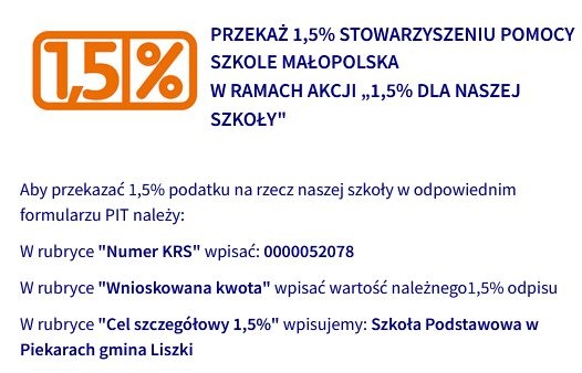 Drodzy Rodzice, Opiekunowie, Przyjaciele naszej szkoły, jak co roku prosimy o wsparcie poprzez przekazanie nam tzw. 1,5%.