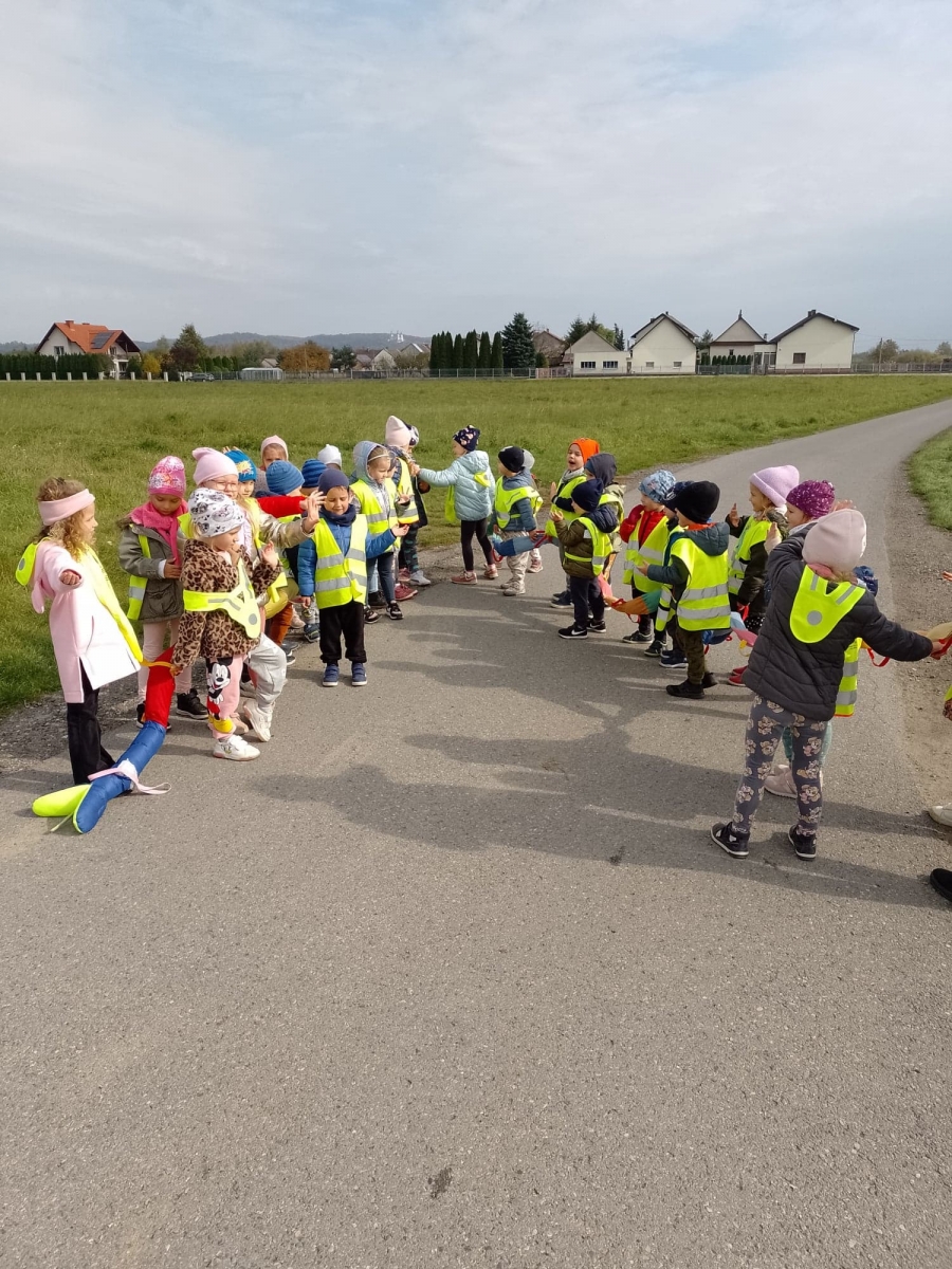 Dodatkowo przedszkolaki poznały zawód policjanta oraz utrwalały numery alarmowe. W zdobywaniu wiedzy pomocne były piosenki, zabawy ruchowe oraz prace plastyczne o tematyce ruchu drogowego.