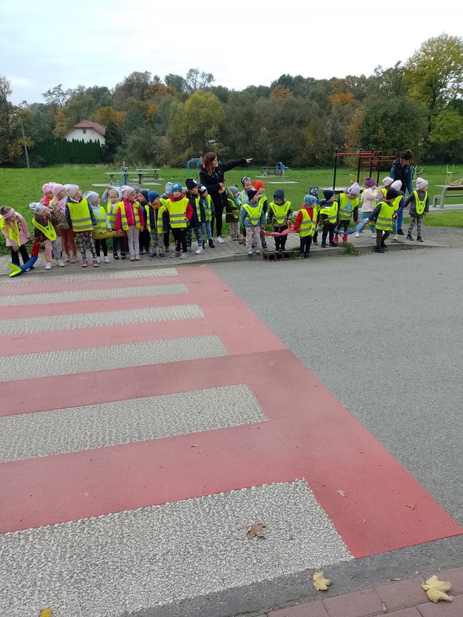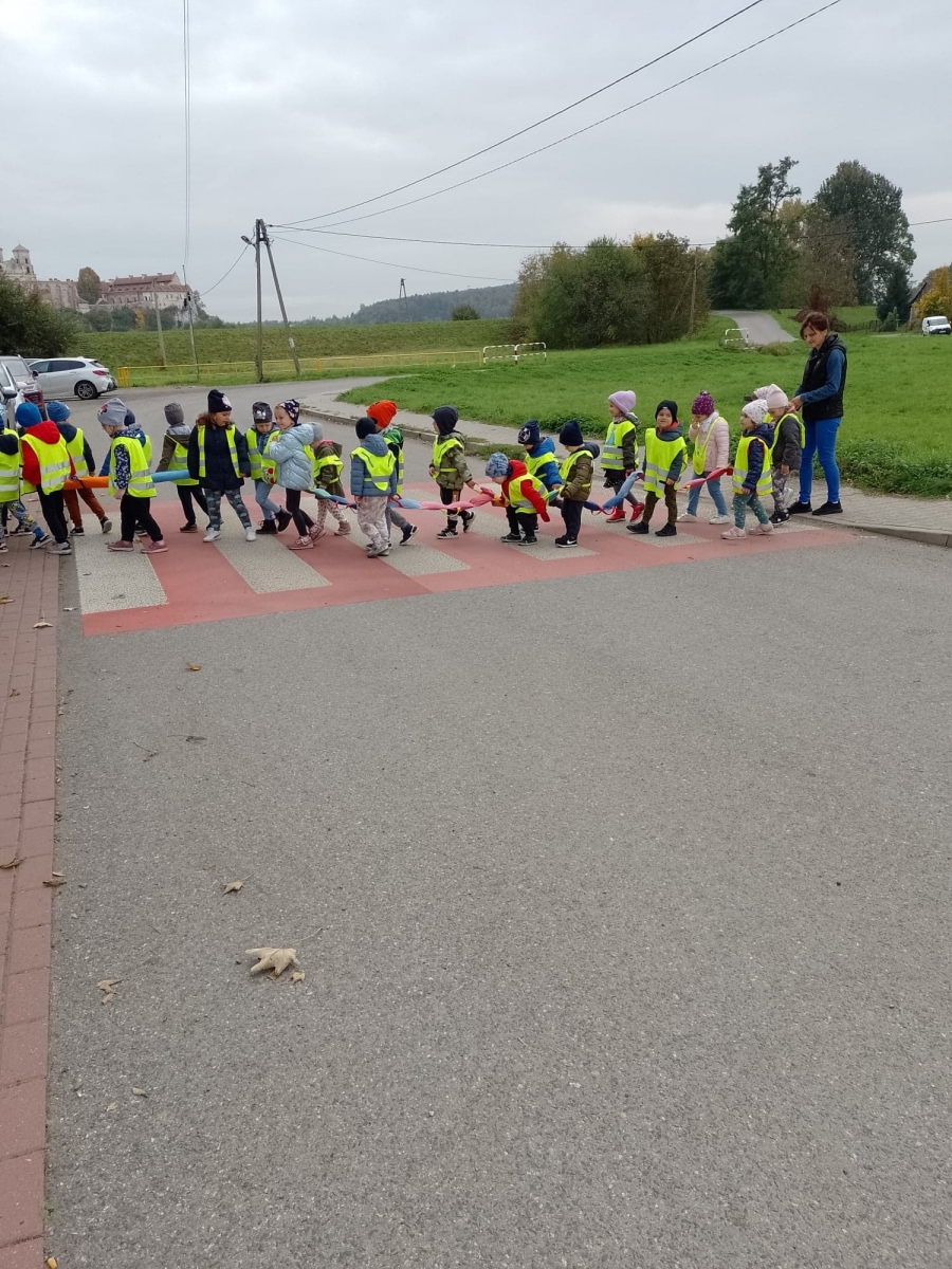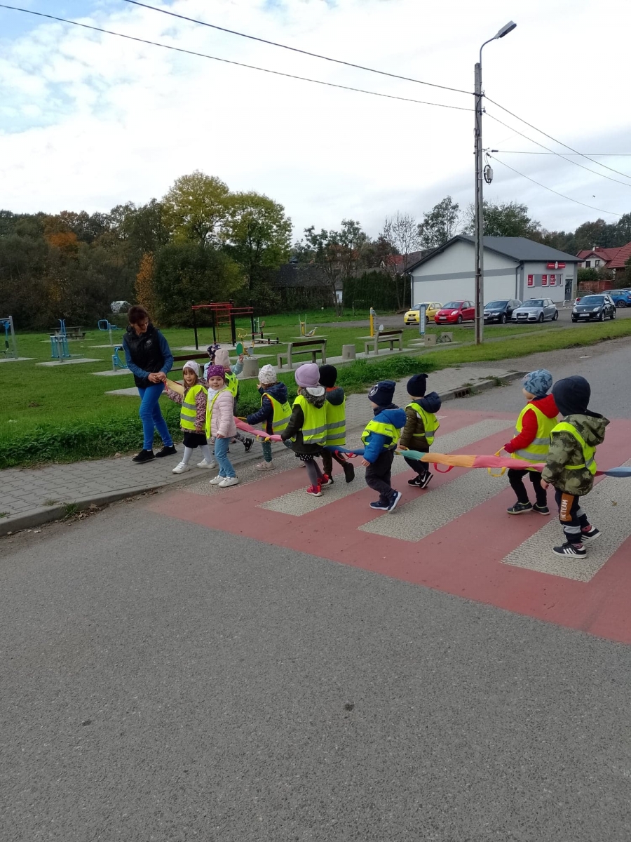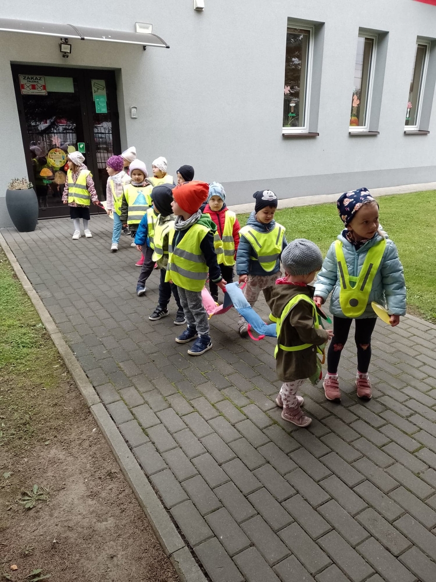 Dzieci ćwiczyły zasady poruszania się i przechodzenia przez jezdnię w ramach spacerów.