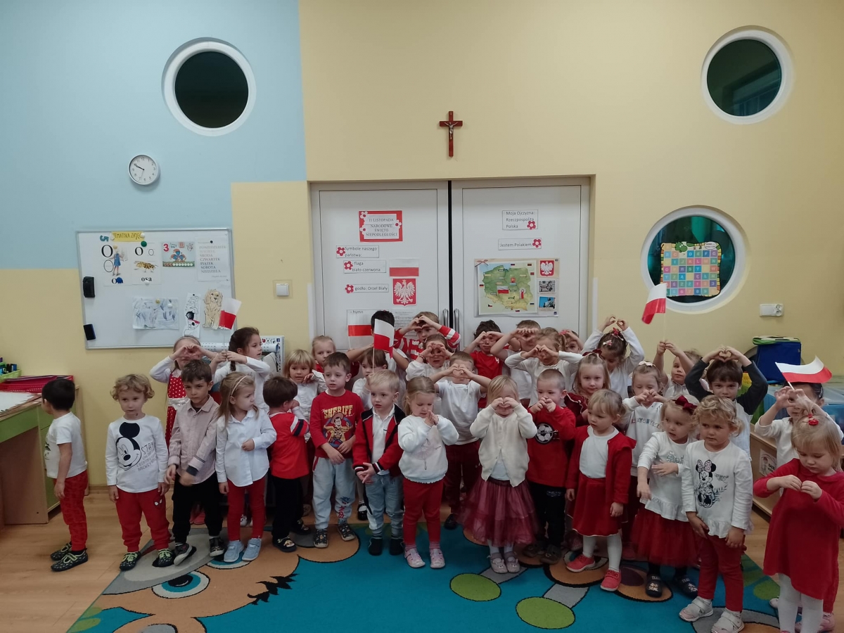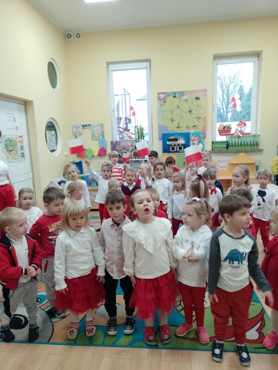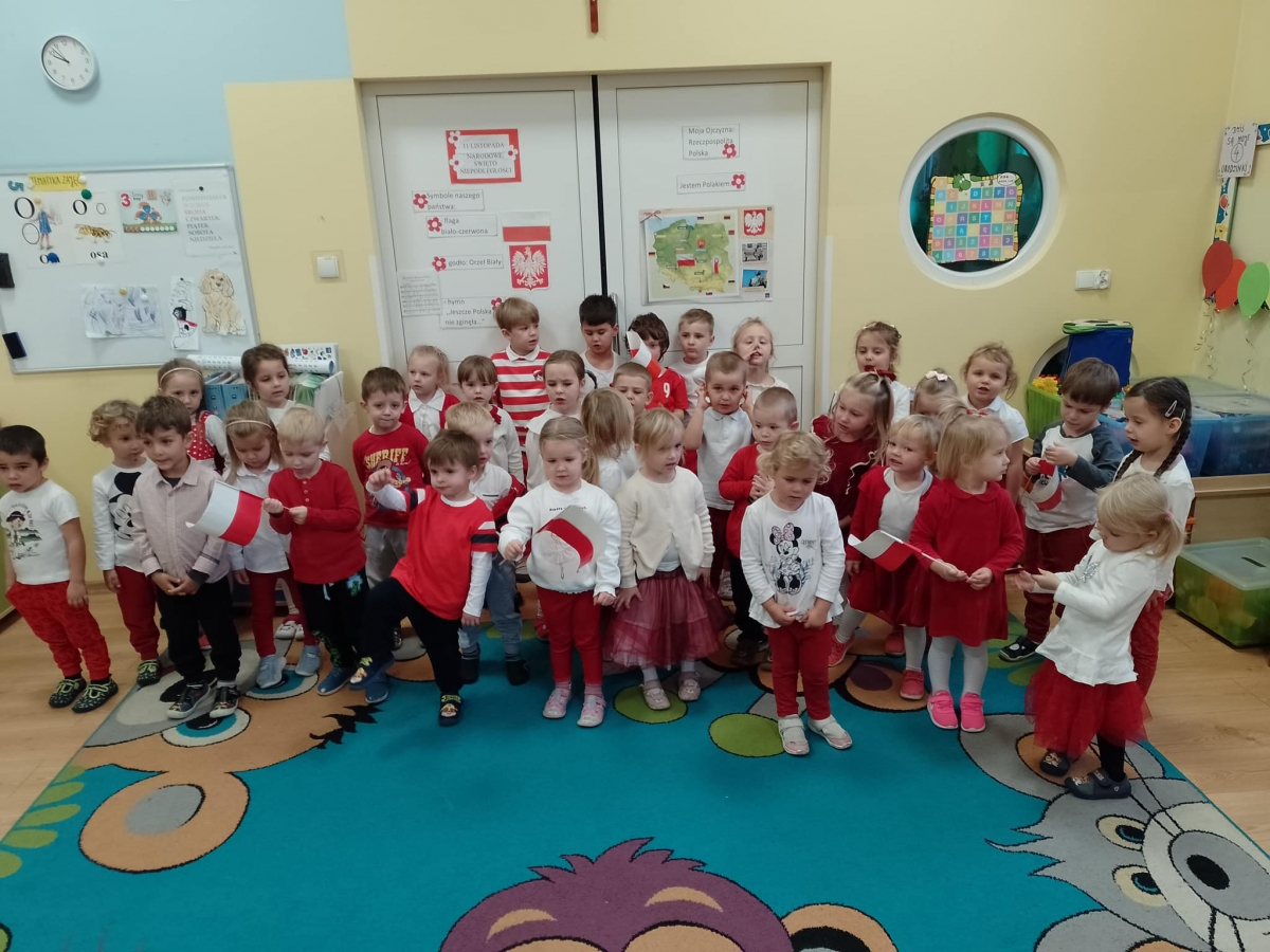 8 listopada to dzień podsumowujacy patriotyczmy tydzień w naszym przedszkolu. Odświętnie ubrane ,,Pszczółki'' i ,,Tygryski'' zaśpiewały Hymn Polski, wykonały kotyliony oraz popisały się wiedzą na temat historii naszej Ojczyzny.