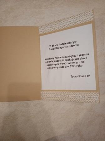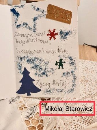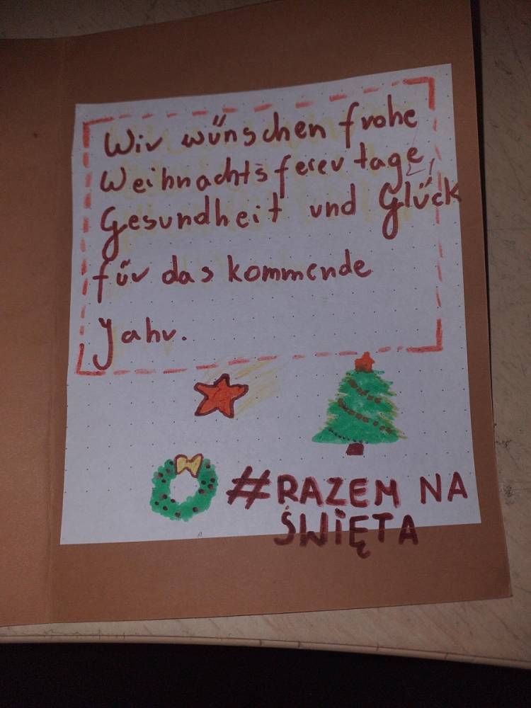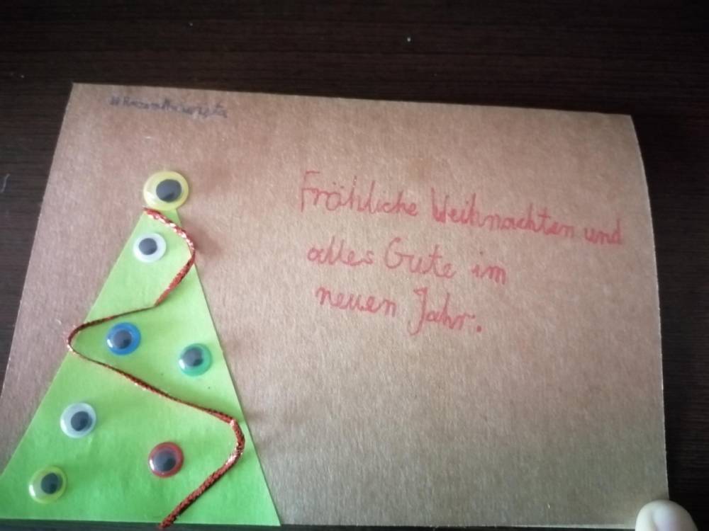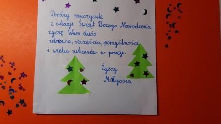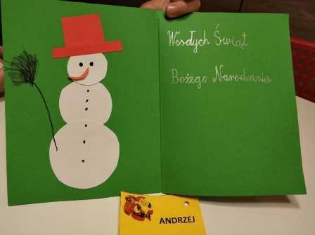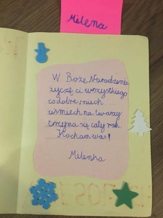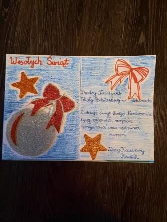 - uczniowie przygotowywali słodkie upominki świąteczne dla bliskich, tworzyli ozdoby choinkowe, a także kartki bożonarodzeniowe, by wyrazić tym szacunek i pamięć, jak również uczcić tradycję Bożego Narodzenia. W tym szczególnym przedświątecznym czasie w ramach zajęć wychowawczych uczniowie poruszali tematykę rodziny, relacji pomiędzy jej członkami, a wykonanymi samodzielnie kartkami świątecznymi dzieci obdarzyły bliskich, szczególnie wiele radości dało to starszym krewnym. Dzieci nie zapomniały także o swoich sąsiadach, wrzucając do skrzynek pocztowych życzenia świąteczne.