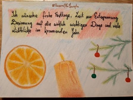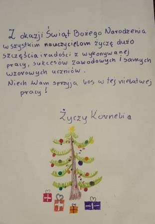 - uczniowie ze szkolnego koła wolontariatu wykonywali kartki z życzeniami świątecznymi, podtrzymując tradycję obdarowywania bliskich kartkami. Jest to niezwykle istotne w czasie, gdy dominuje poczta internetowa. Ręcznie wykonane karty świąteczne „wyruszyły w teren” do emerytowanych pracowników oświaty, lokalnych przedsiębiorców, a także darczyńców naszej szkoły,