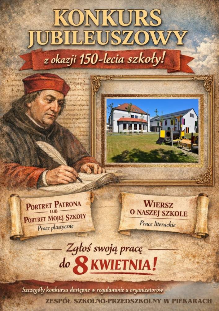 REGULAMIN KONKURSU JUBILEUSZOWEGO z okazji 150-lecia Szkoły „Mój Patron. Moja Szkoła”. Szczegóły w załączonym regulaminie wraz z Załącznikiem nr 1 - zgodą.