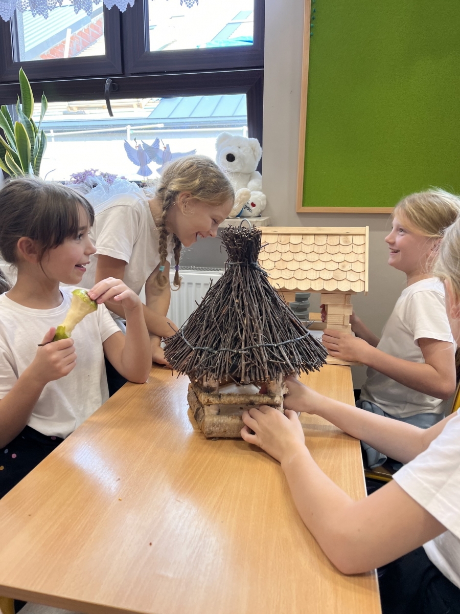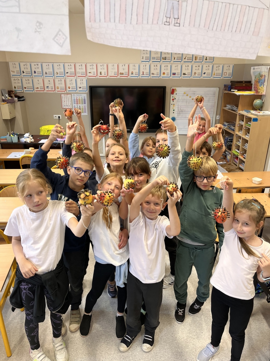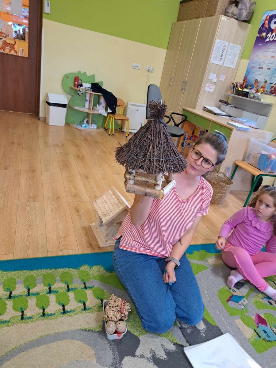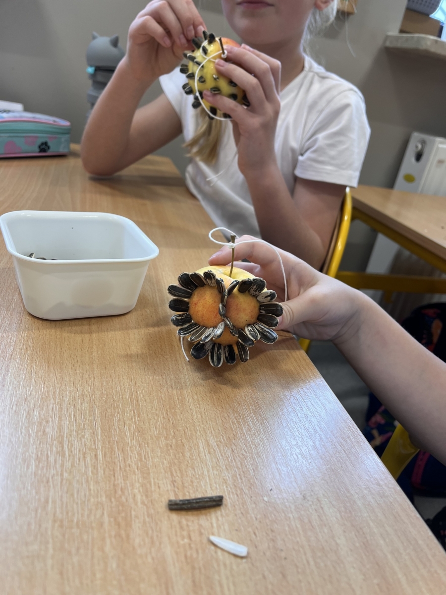 Podczas pierwszych warsztatów przyrodniczych dzieci poznały tajniki karmienia ptaków pozostających na jesień i zimę w Polsce. Rozmawialiśmy o tym, czym wolno, a czym nie powinno się karmić ptaków. Zadaniem dzieci było wrzucenie odpowiednich składników do właściwego kosza. Dowiedziały się również jakie gatunki ptaków pozostają w Polsce oraz czym się żywią, jak powinien wyglądać bezpieczny karmnik i czym dokarmiać ptaki wodne, a także dlaczego chleb jest dla nich szkodliwy. Na koniec warsztatów każde z dzieci przygotowało własny ekologiczny karmnik z jabłek, sznurka i pestek słonecznika.