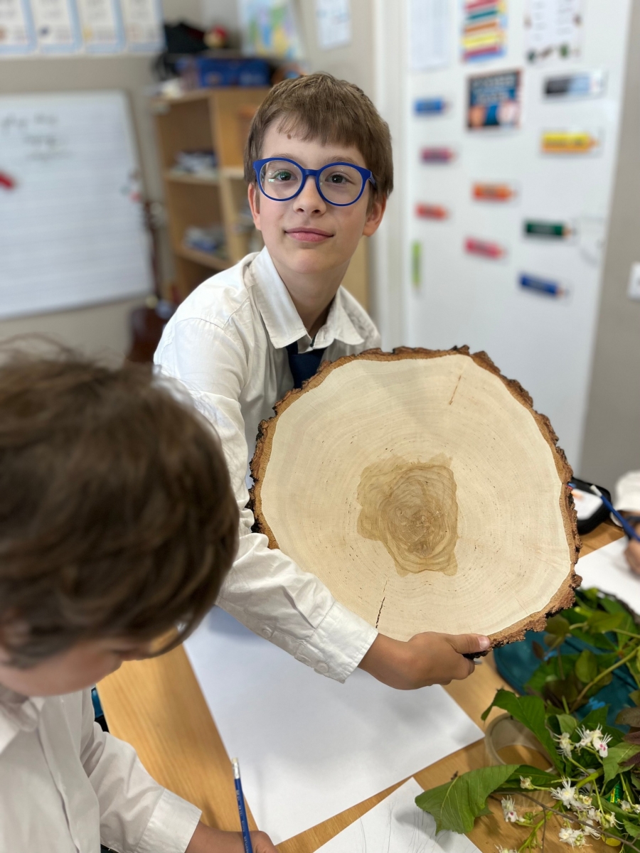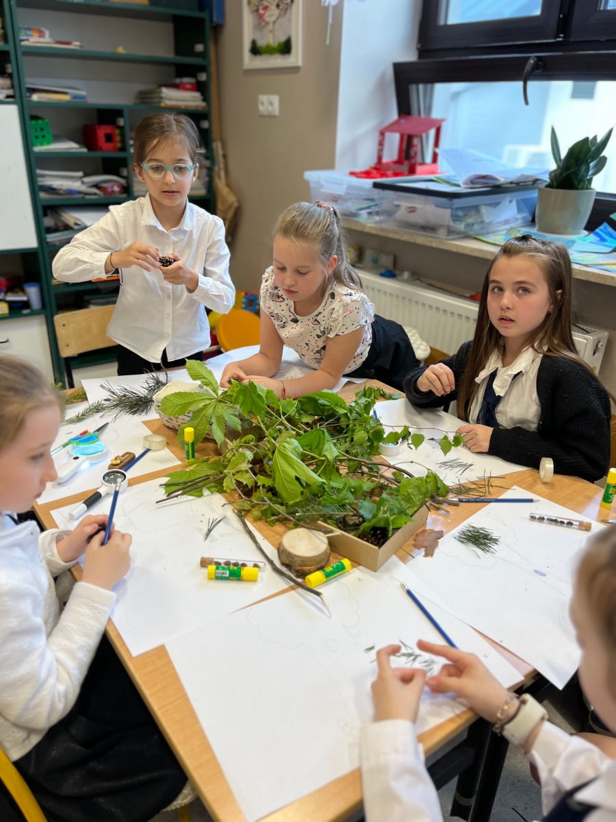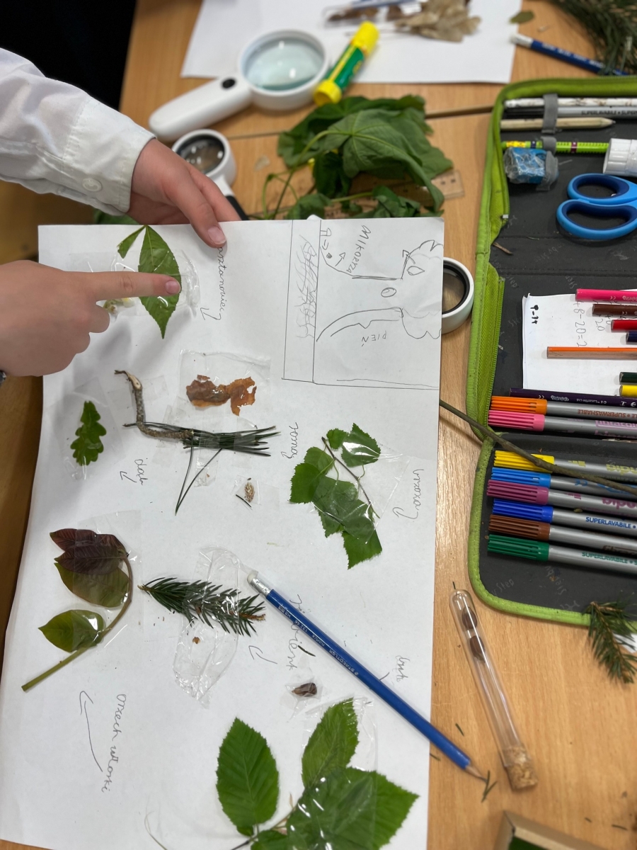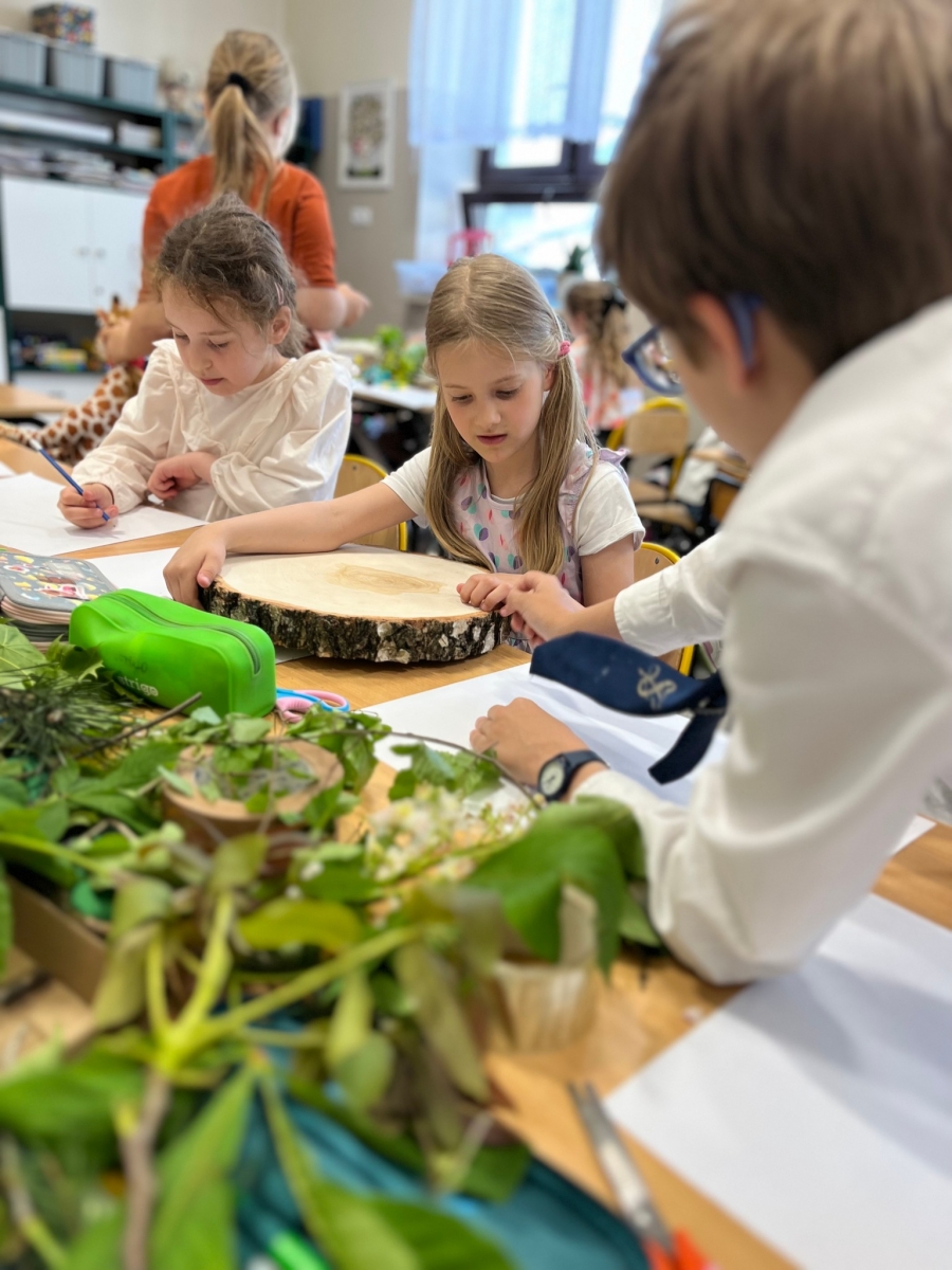 To idealny moment na rozmowy o drzewach, bo większość z nich budzi się do życia i pokazuje nam swoje piękne kwiaty. Dzieci dowiedziały się jak drzewa się ze sobą łączą, jak pomagają im grzyby, gdzie znajduje się ich system nawadniający, obejrzały liście, kwiaty i pąki, różne przekroje drzew, mogły zobaczyć jak drzewa różnią się twardością, kolorem i zapachem, a także dowiedziały się jak możemy rozpoznawać drzewa zimą, czym są charakterystyczne blizny po liściach oraz jak rozpoznać po nasionach czy dany gatunek lubi być koło siebie i dlaczego niektóre szyszki zamykają się kiedy jest wilgotno. Podczas warsztatów dzieci pracowały nad swoimi kartkami z notatnika, metodą natural jurnalism - czyli dotykaj, wąchaj, opisuj, rysuj i przyklejaj. Ta metoda sprawiła im wiele radości.