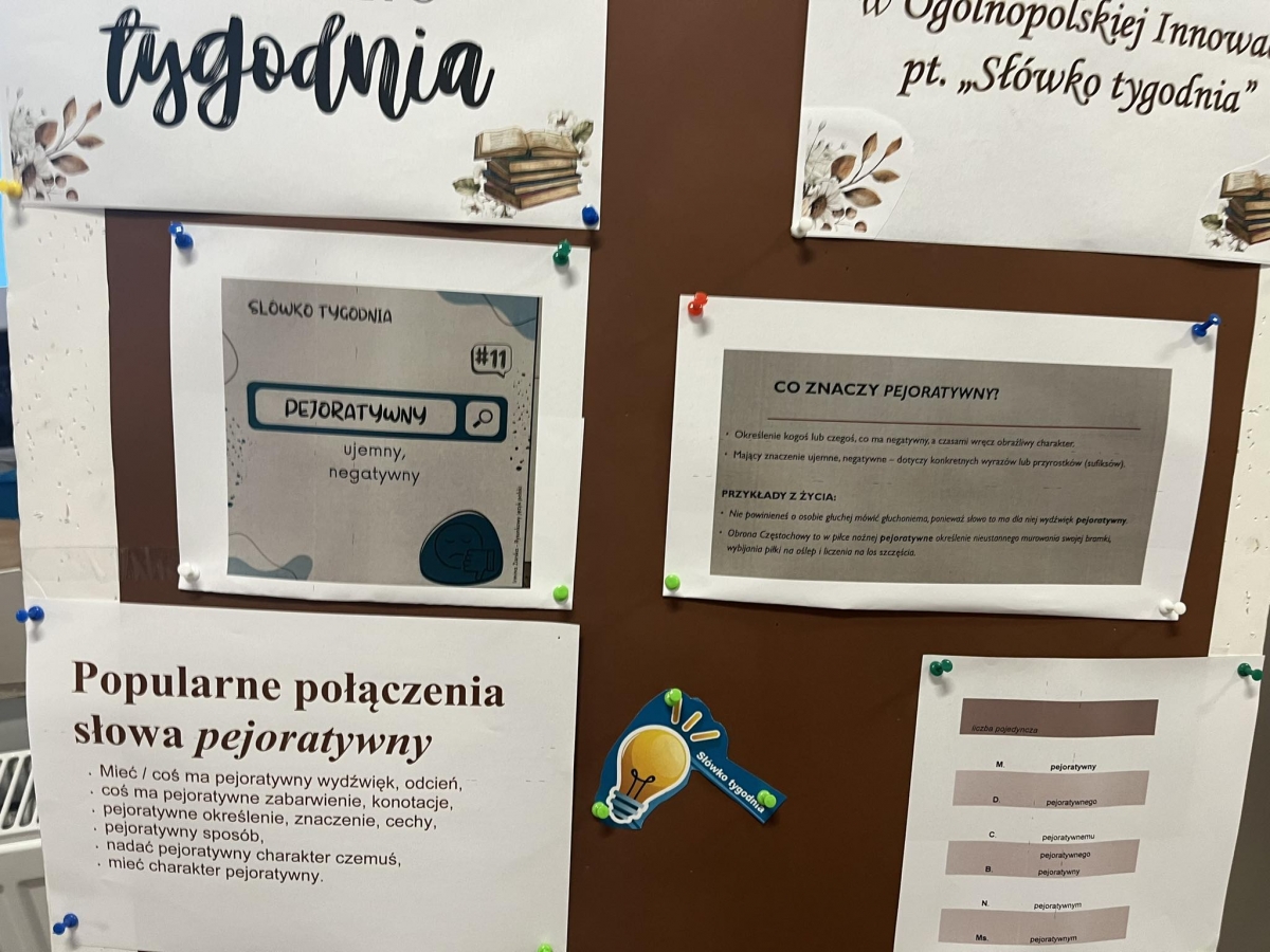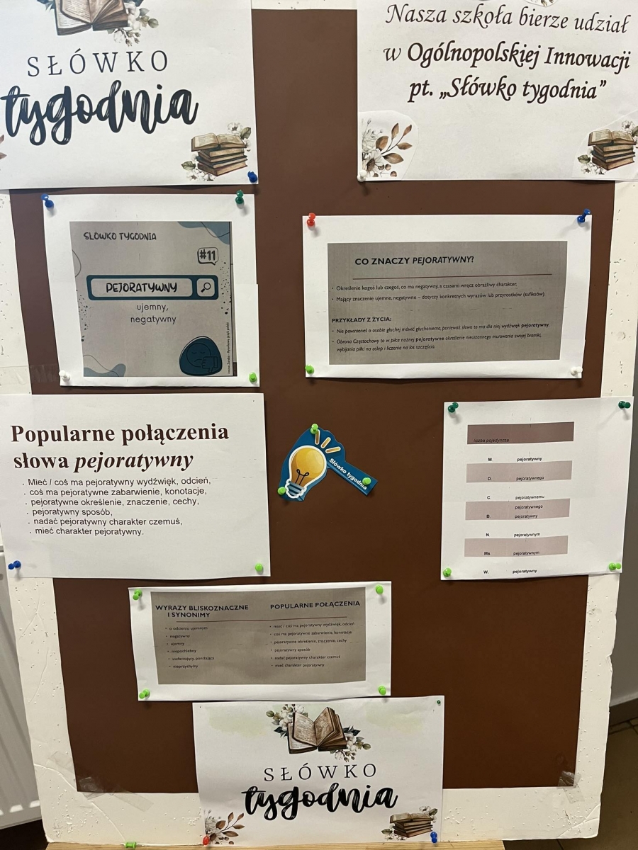Ogólnopolski projekt, w którym bierze udział także nasza szkoła, czyli innowacja „Słówko tygodnia” jest odpowiedzią na trudności uczniów związane ze rozumieniem wypowiedzi czytanych i pisanych, a także brak bogactwa synonimów w komunikatach uczniów.