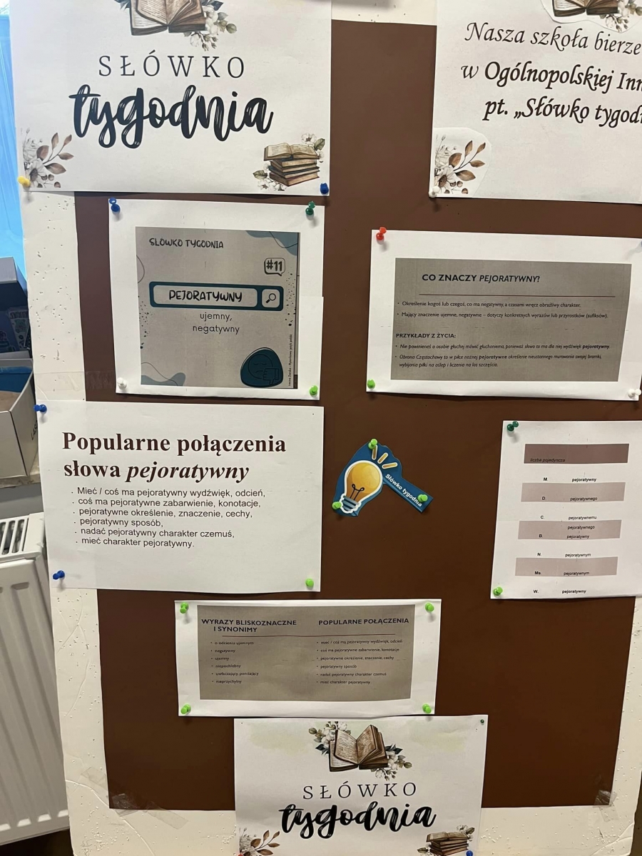 Ogólnopolski projekt, w którym bierze udział także nasza szkoła, czyli innowacja „Słówko tygodnia” jest odpowiedzią na trudności uczniów związane ze rozumieniem wypowiedzi czytanych i pisanych, a także brak bogactwa synonimów w komunikatach uczniów.