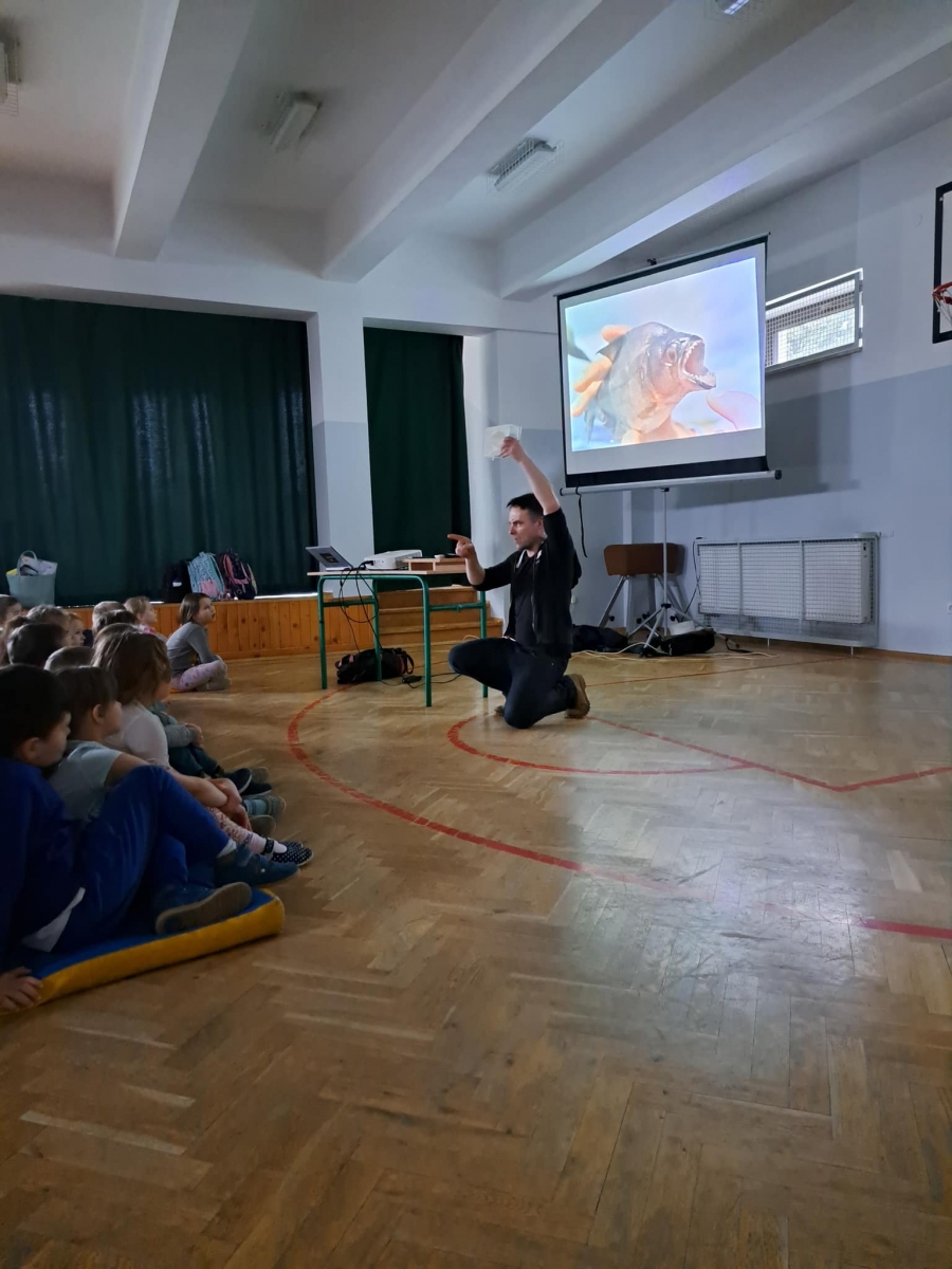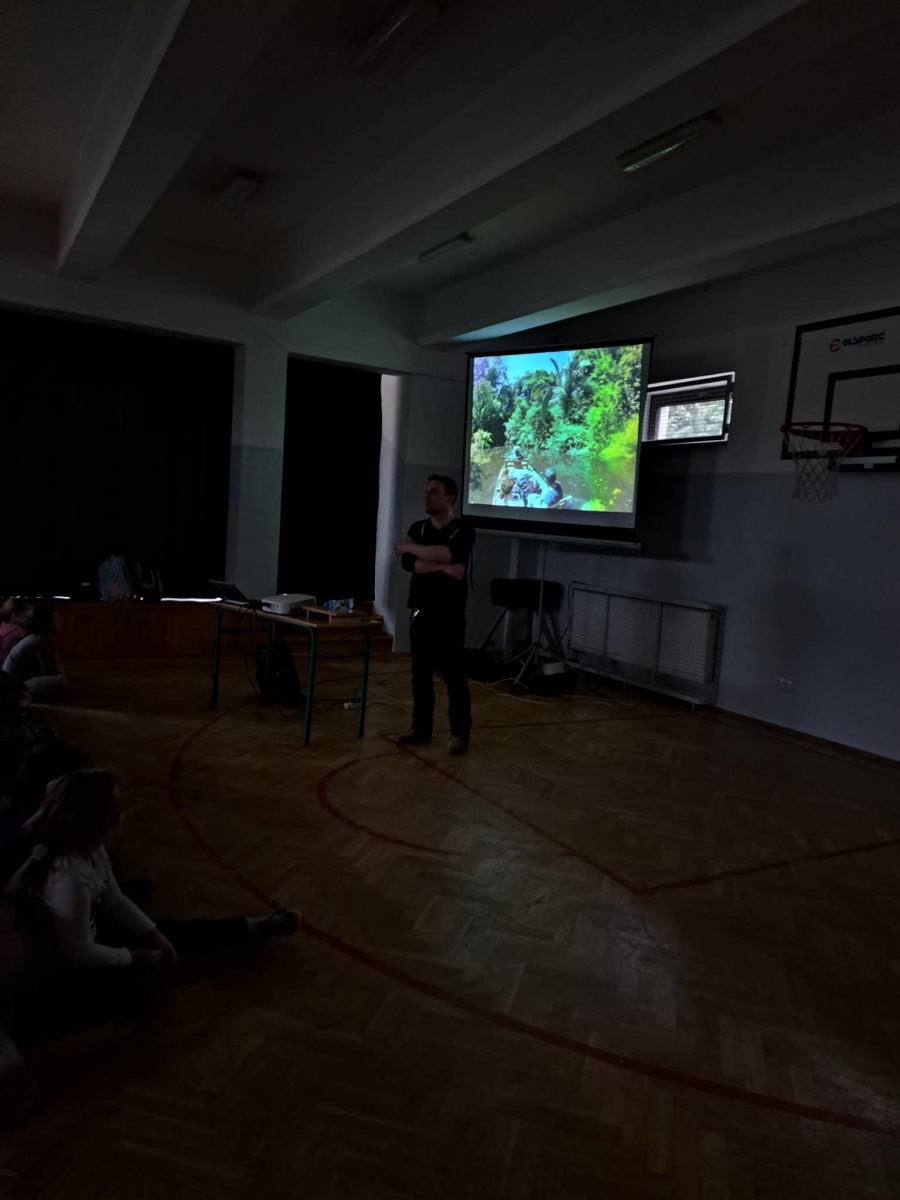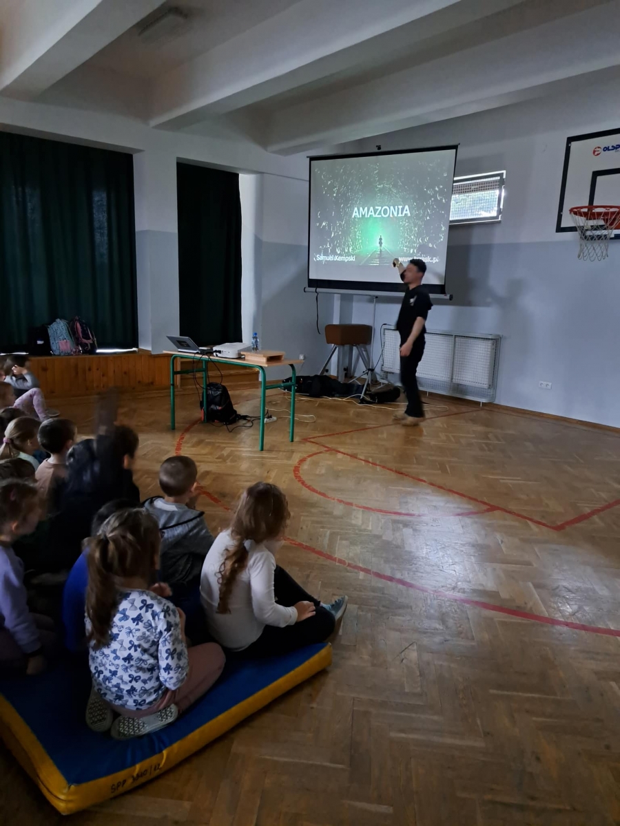 W czasie spotkania z podróżnikiem mogliśmy posłuchać ciekawych opowieści o Amazonce – największej rzece świata, lesie deszczowym zwanym dżunglą i o sposobach przetrwania w nim, zwyczajach i życiu codziennym Indian oraz zabawach z indiańskimi dziećmi. Duże wrażenie zrobiła na zgromadzonych drapieżna pirania z dorzecza Amazonki i narzędzie, bez których nie da się wędrować po lesie deszczowym.