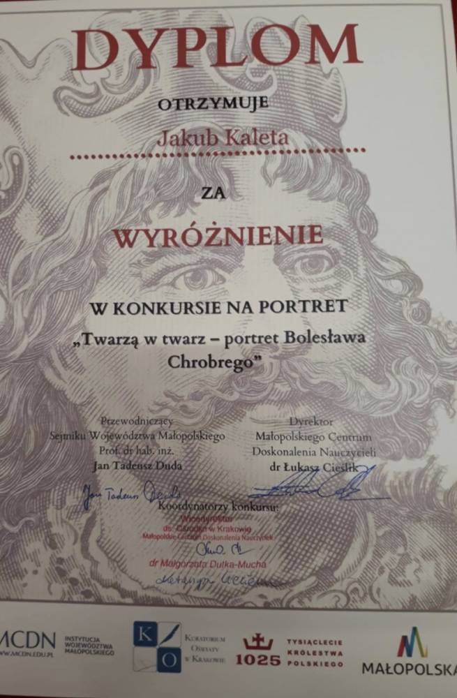 Z dumą informujemy, że uczeń kl. I Jakub Kaleta zdobył wyróżnienie w Konkursie na portret pt. „Twarzą w twarz – portret Bolesława Chrobrego” organizowanym w ramach projektu