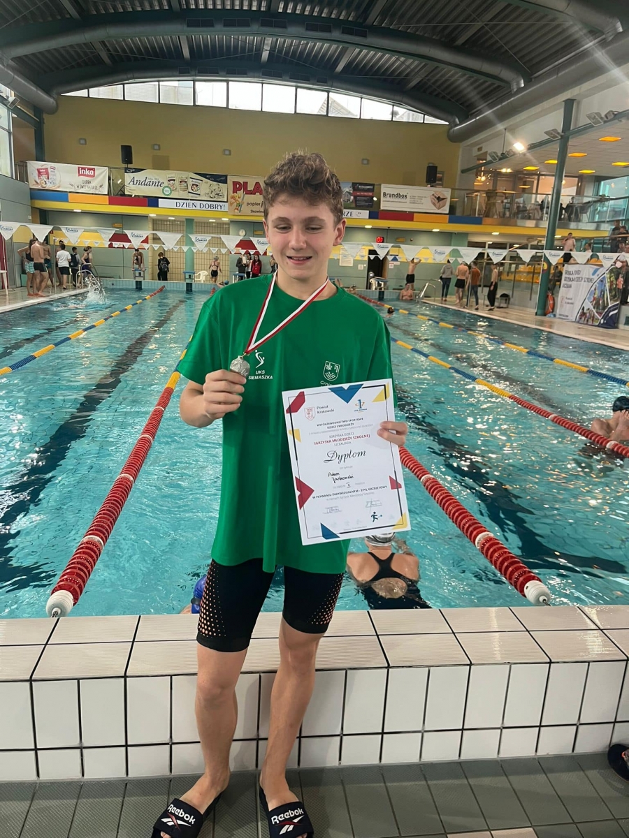 Uczeń kl. VII Adam Jaskowski zajął 2. miejsce w Powiatowych Zawodach w pływaniu, które odbyły się w Skawinie.