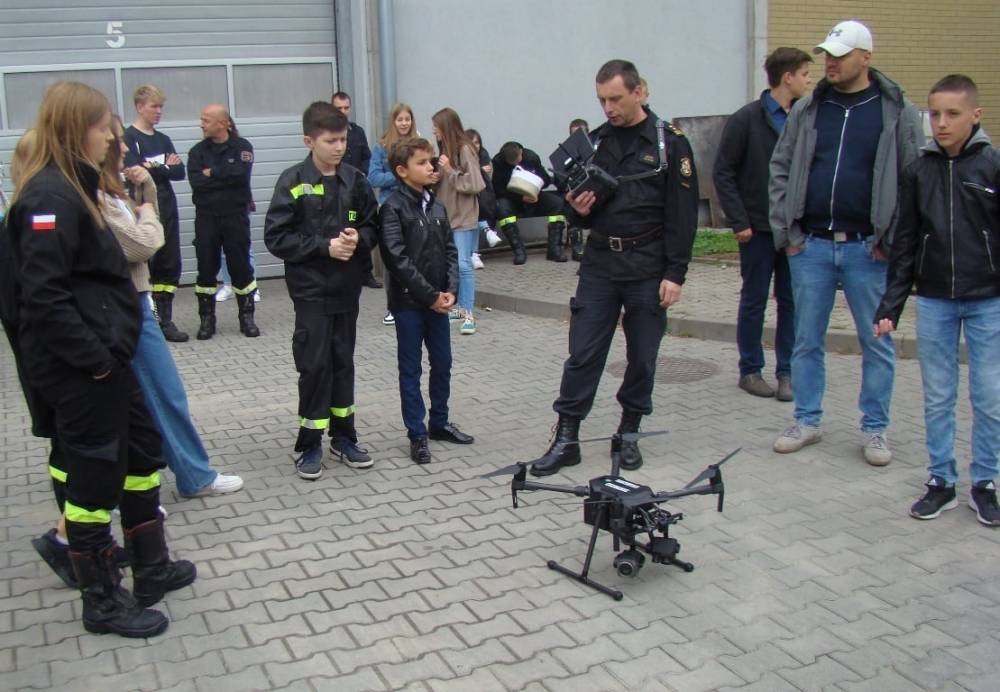 Zwycięscy przedstawiciele szkół z etapów powiatowych, będąc na terenie Jednostki Ratowniczo - Gaśniczej nr 7 w Krakowie, mieli okazję zapoznać się z wyposażeniem punktu oraz zobaczyć, jak uruchamia się drona.