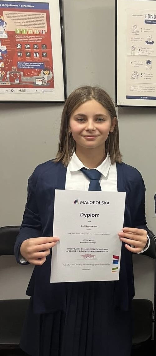 Z przyjemnością informujemy, że w tegorocznym Małopolskim Konkursie Recytatorskim „Spotkanie ze słowem pięknym i prawdziwym” uczennica kl. VI Emilia Strojnowska zakwalifikowała się do etapu wojewódzkiego! Wielkie brawa