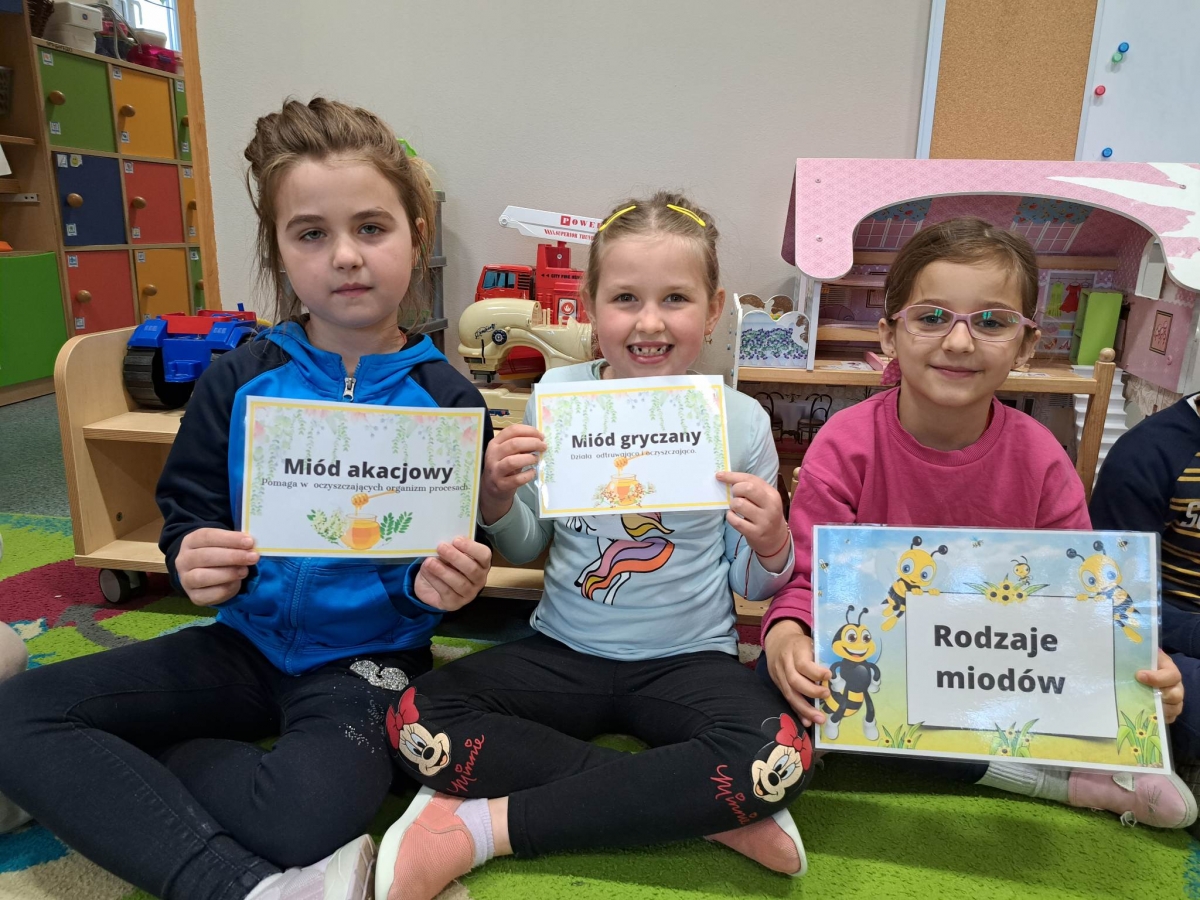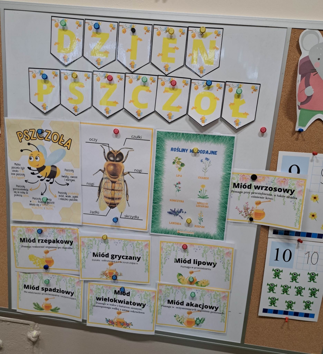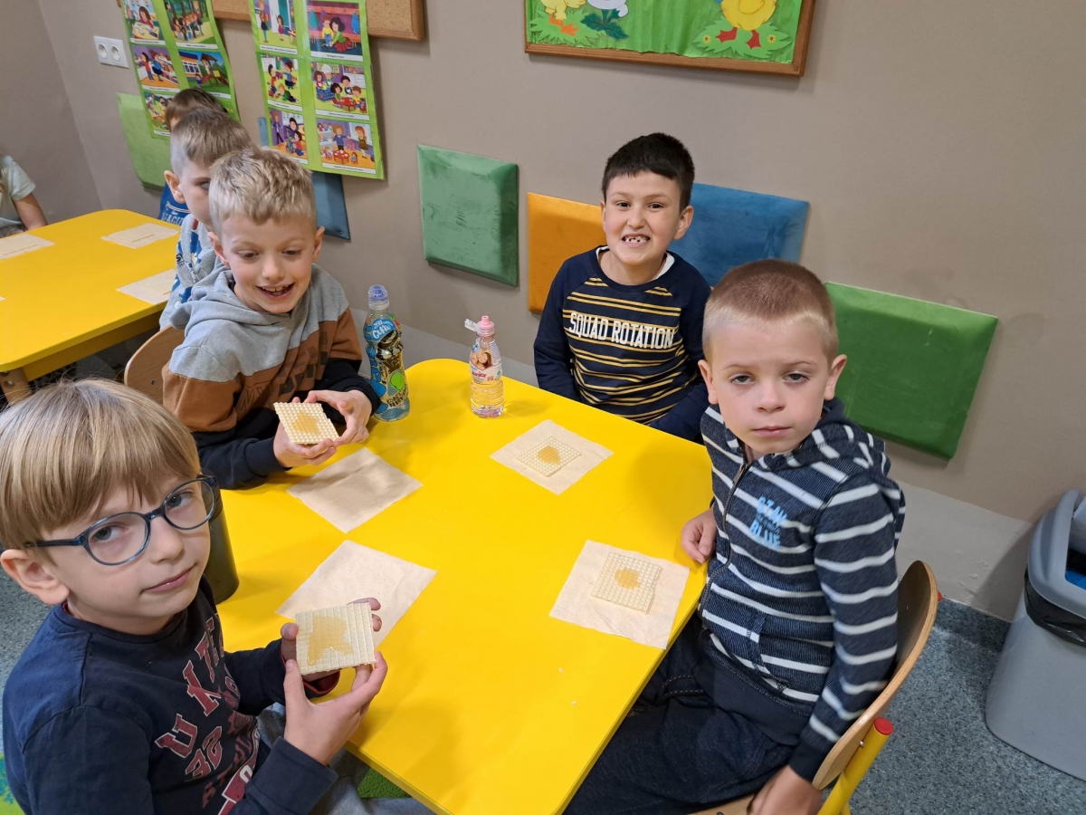 Dzieci z oddziału przedszkolnego "Mądre Sówki" rozmawiały na temat roli pszczół w przyrodzie. Omówiły budowę, pszczoły, etapy powstawiania miodu i jego rodzaje. Dokonywały obliczeń matematycznych posługując się sylwetami pszczółek. Wykonały również pracę plastyczną nawiązującą do tematu pszczół. Najprzyjemniejszą częścią zajęć była degustacja miodu.