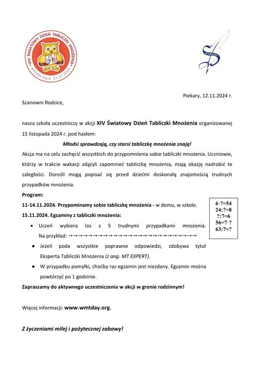 XIV Światowy Dzień Tabliczki Mnożenia, 15 listopada 2024 r.